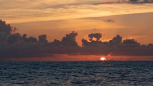 The winds remained low all night, and the waves all but disappeared. When I went on watch at 04:00, the sky was already beginning to lighten, and the stars were no longer visible. Only Venus remained visible. The sunrise was glorious, and it is always thrilling to catch that first ray of sunshine appearing on the horizon. From that first moment to full sunrise, it only lasts a short while; the sun seems to just pop up in a hurry.