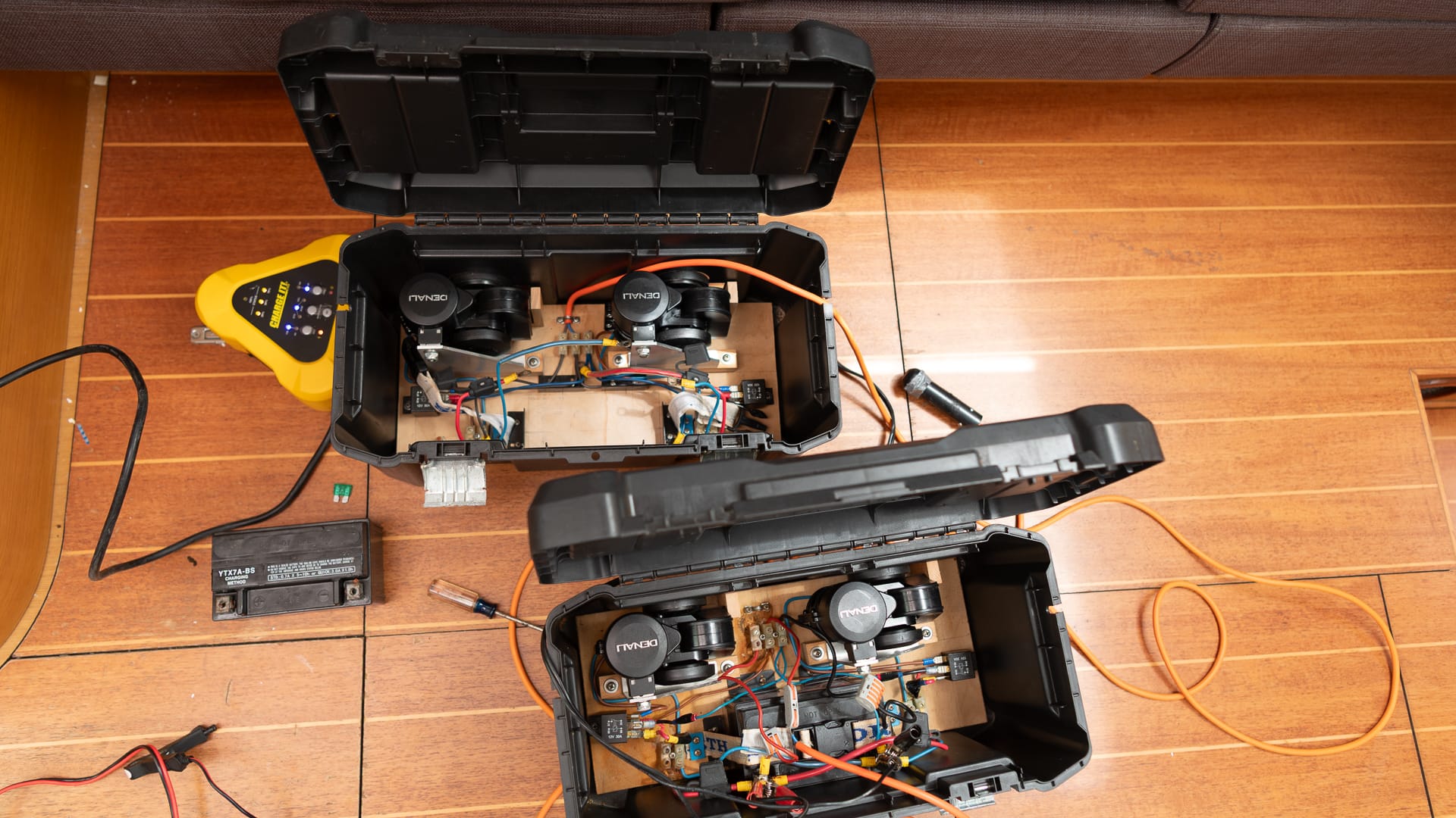 Paul also delivered the horns that we use for the races, engineered and built by Neil Andrew. They are, unfortunately, currently inoperable, and my initial analysis is that one battery is pushing up the daisies and the other would have been read its last rites long ago had it been Roman Catholic. One charger just beeps with the message “Error, ERROR!” and the other gives a bit more time before showing a failure.