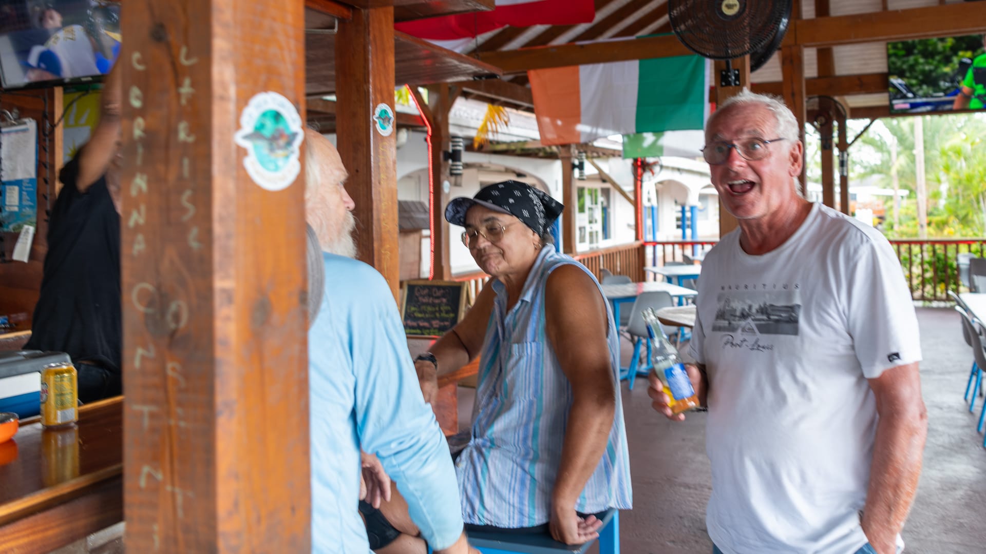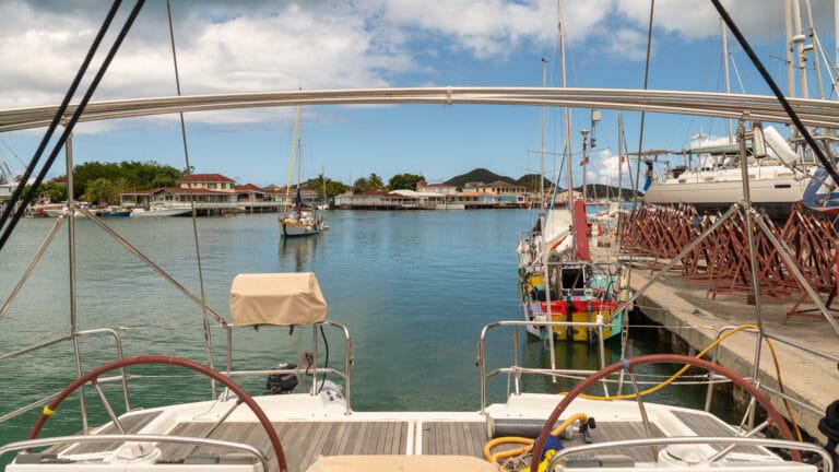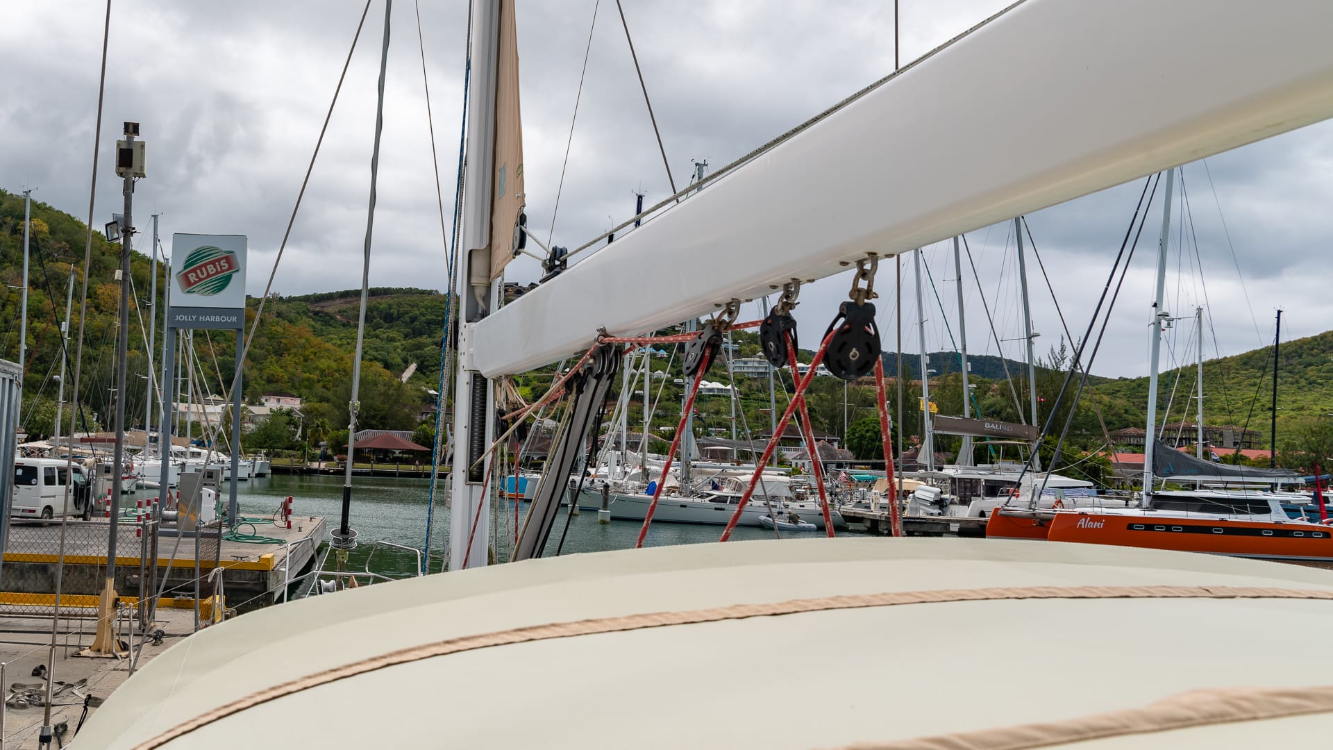 The clouds are moving in again, and I went to Epicurean via dinghy between showers. I didn’t get much; nonetheless, the bill ended up being quite high. Oh well, at least there’s a bit of ballast mass in the fridge now! When the rains let up, I’ll dinghy to Mike’s boat and tow him and his dinghy back to save him a bit of rowing.