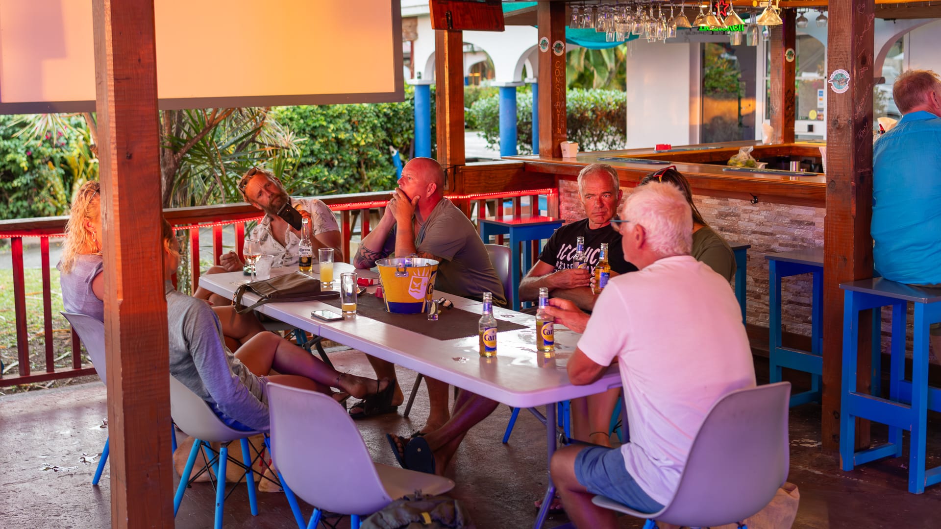 I motored out to Mike and, instead of towing him back and forth, I’ve loaned him my dinghy for the next couple of days since I’m not using it yet. I’m going to clean up forward for a bit and then join the others for happy hour.