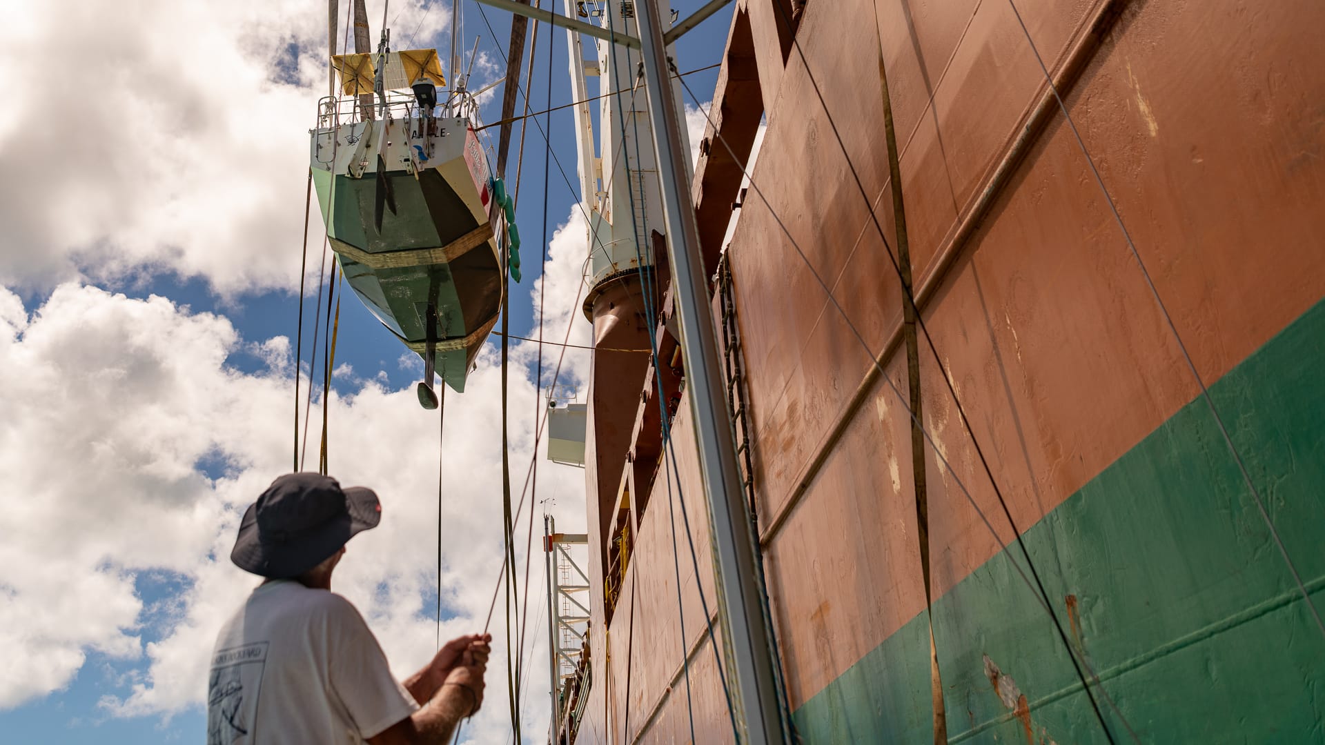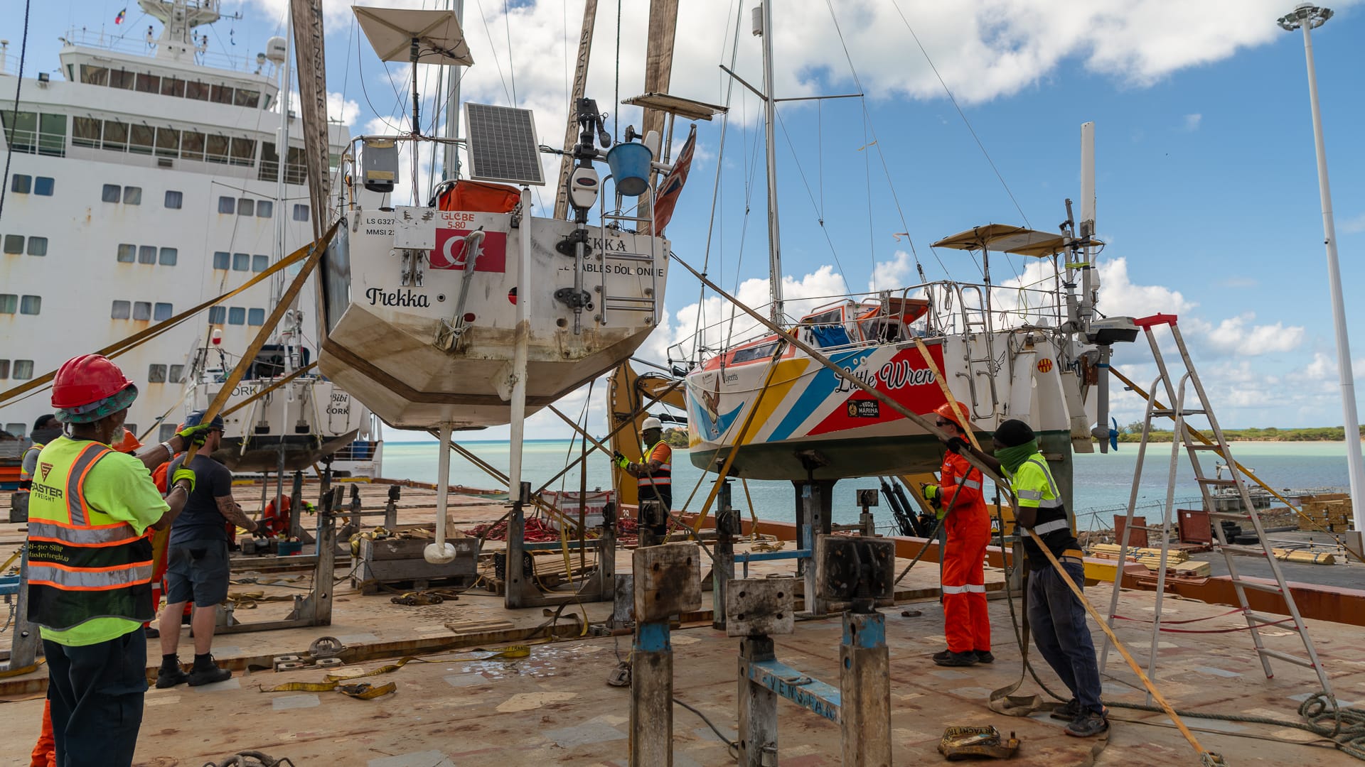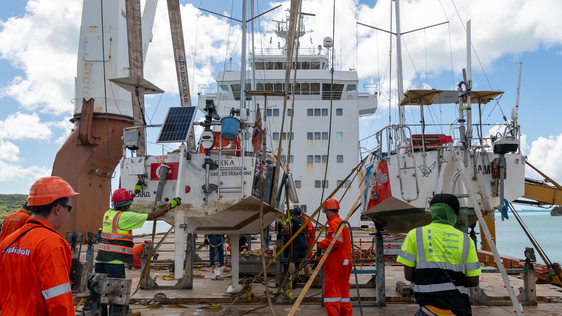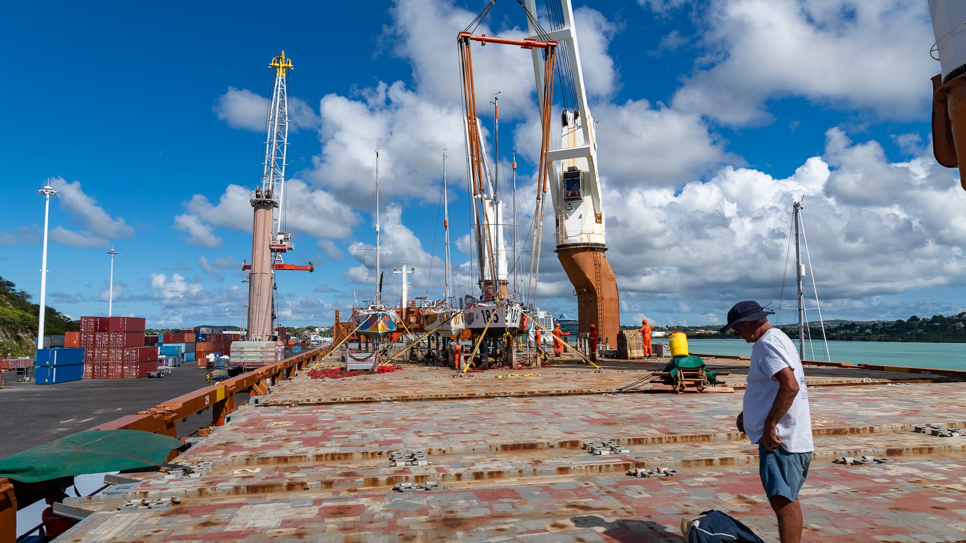 Noon came around, and we still had no loading time, so everyone went off for lunch. Subsequently, we were told we could head over to the cargo ship, and shortly thereafter, the loading process began. Although we were #2 in line, another 5.80 snuck ahead of us, and it took quite a while before Trekka was hauled on board and the loadmasters began chocking her and welding the frames to the deck.