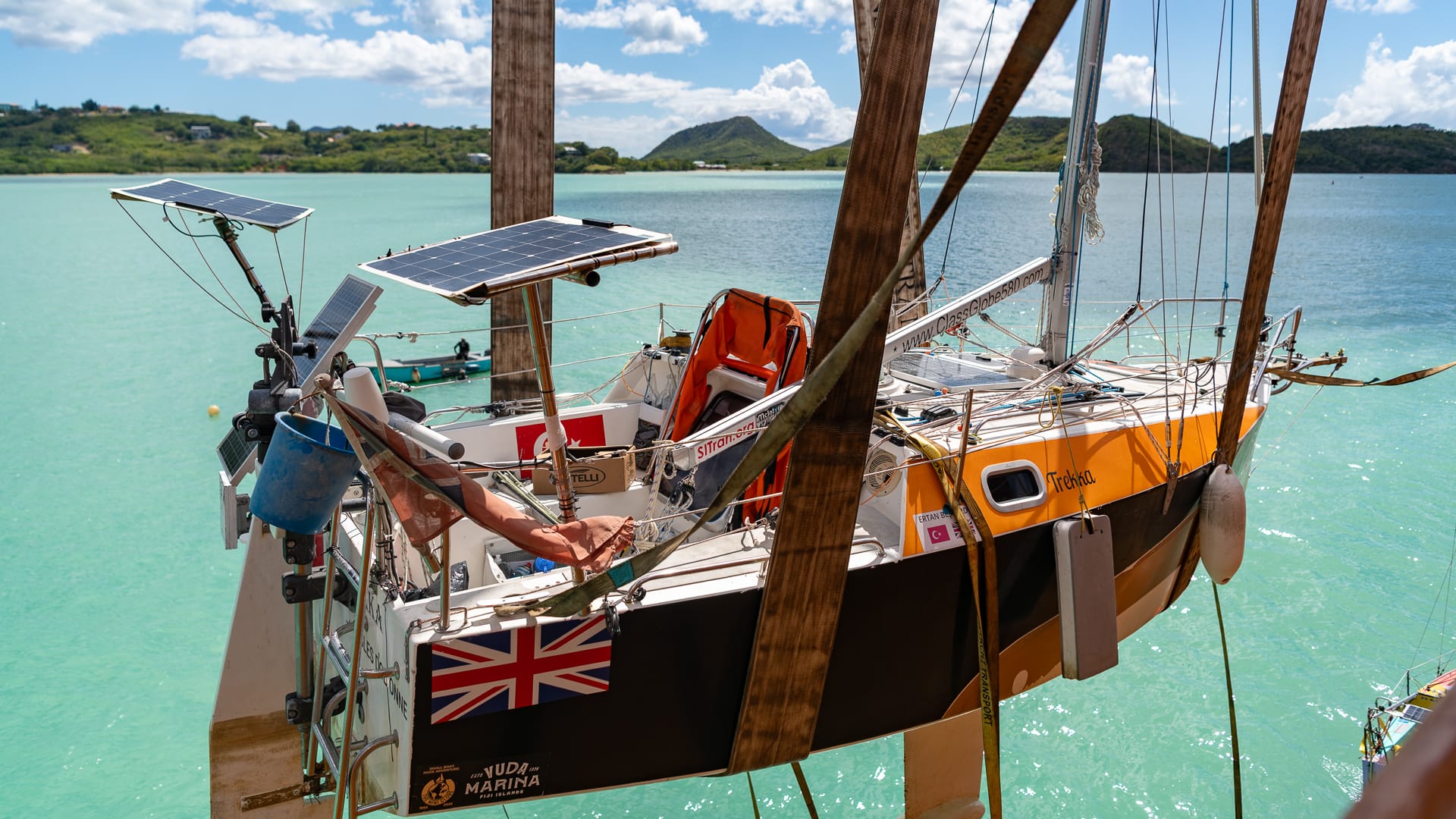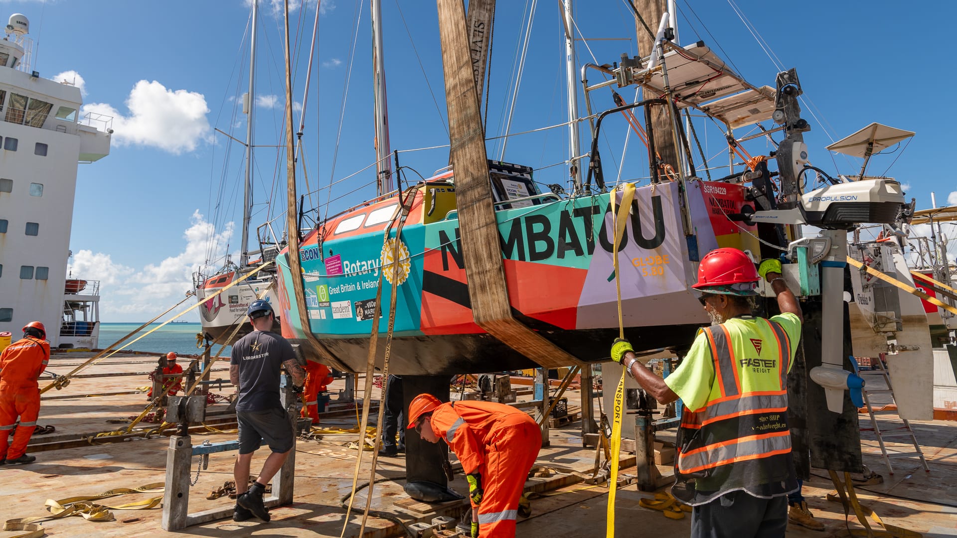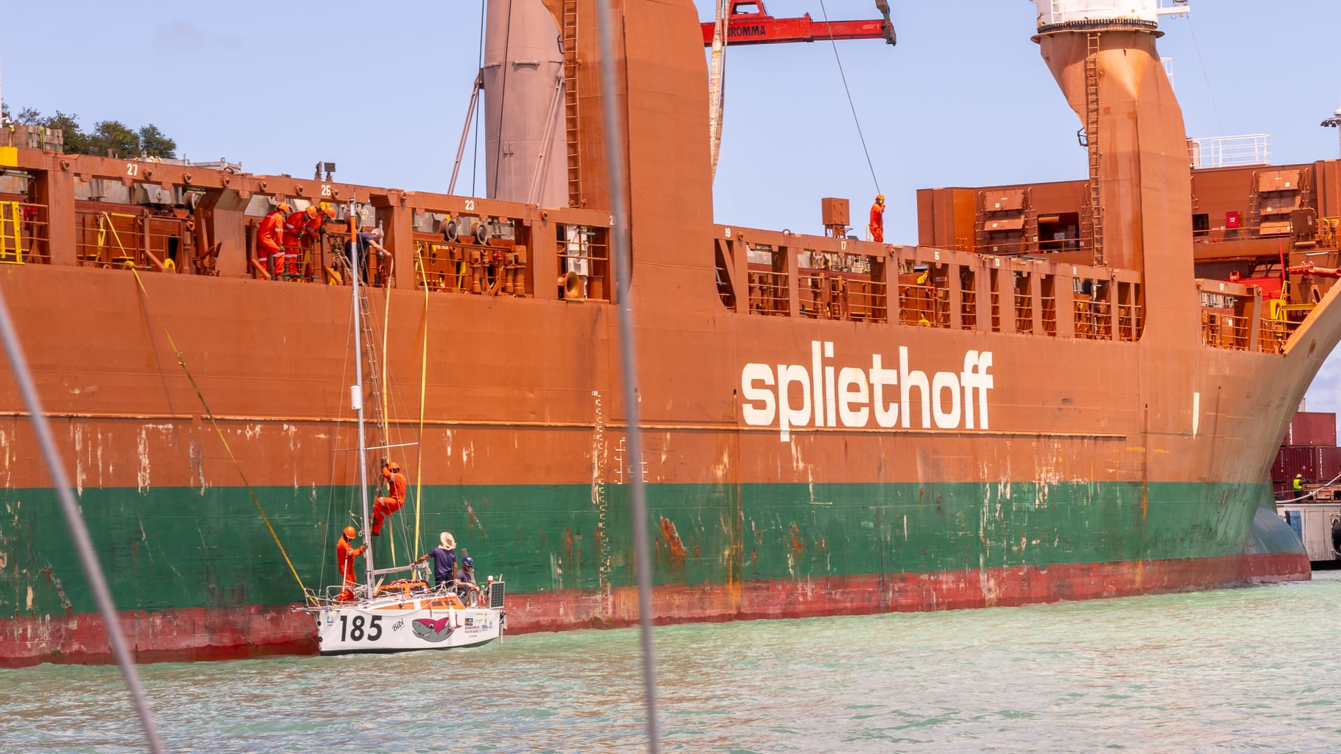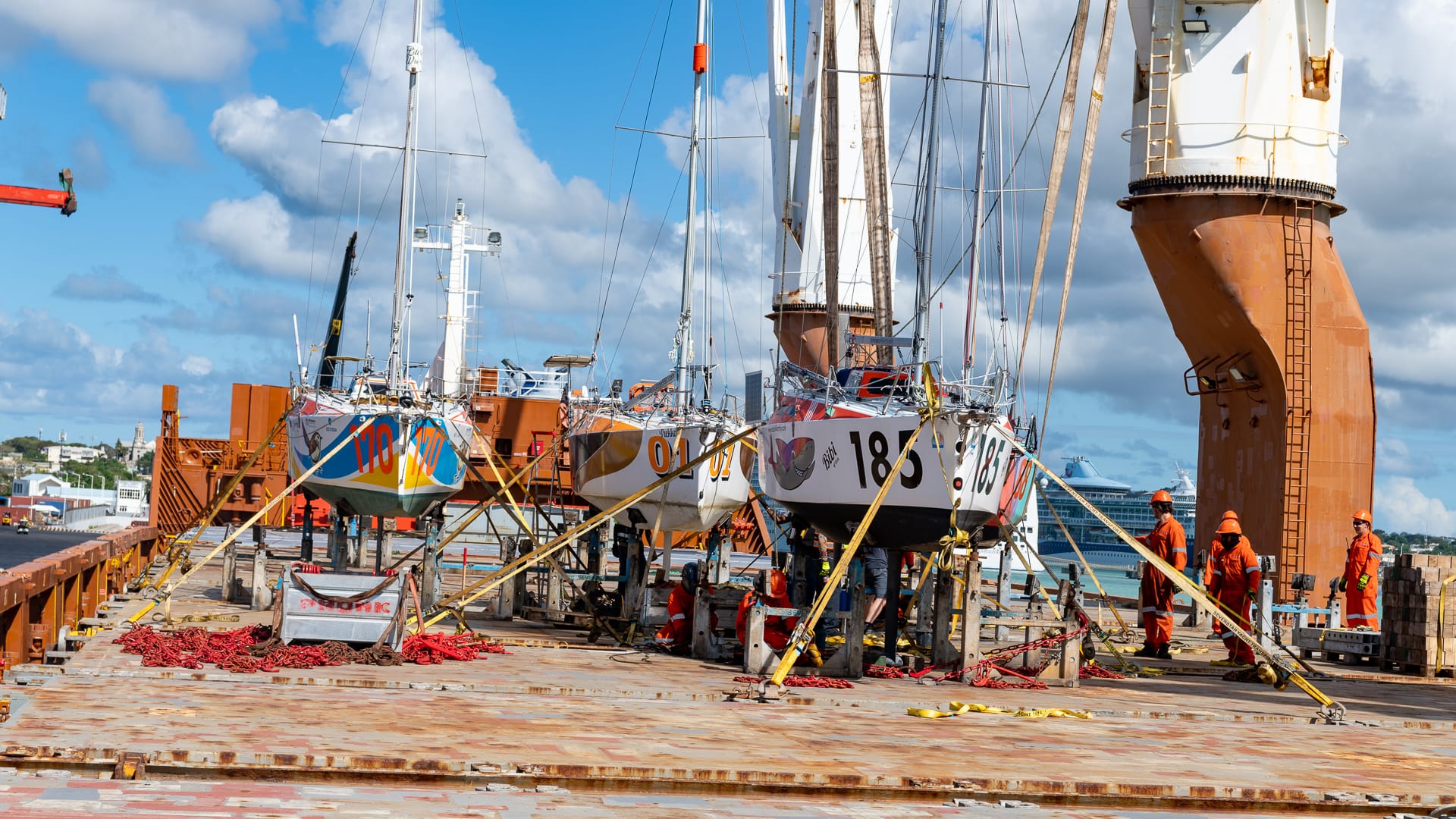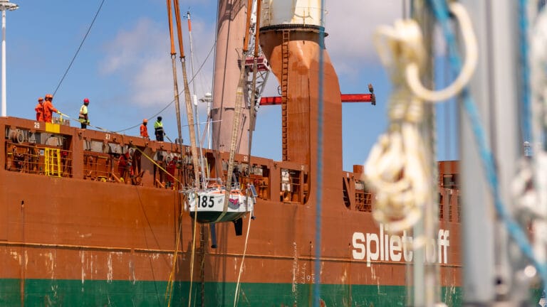 Noon came around, and we still had no loading time, so everyone went off for lunch. Subsequently, we were told we could head over to the cargo ship, and shortly thereafter, the loading process began. Although we were #2 in line, another 5.80 snuck ahead of us, and it took quite a while before Trekka was hauled on board and the loadmasters began chocking her and welding the frames to the deck.