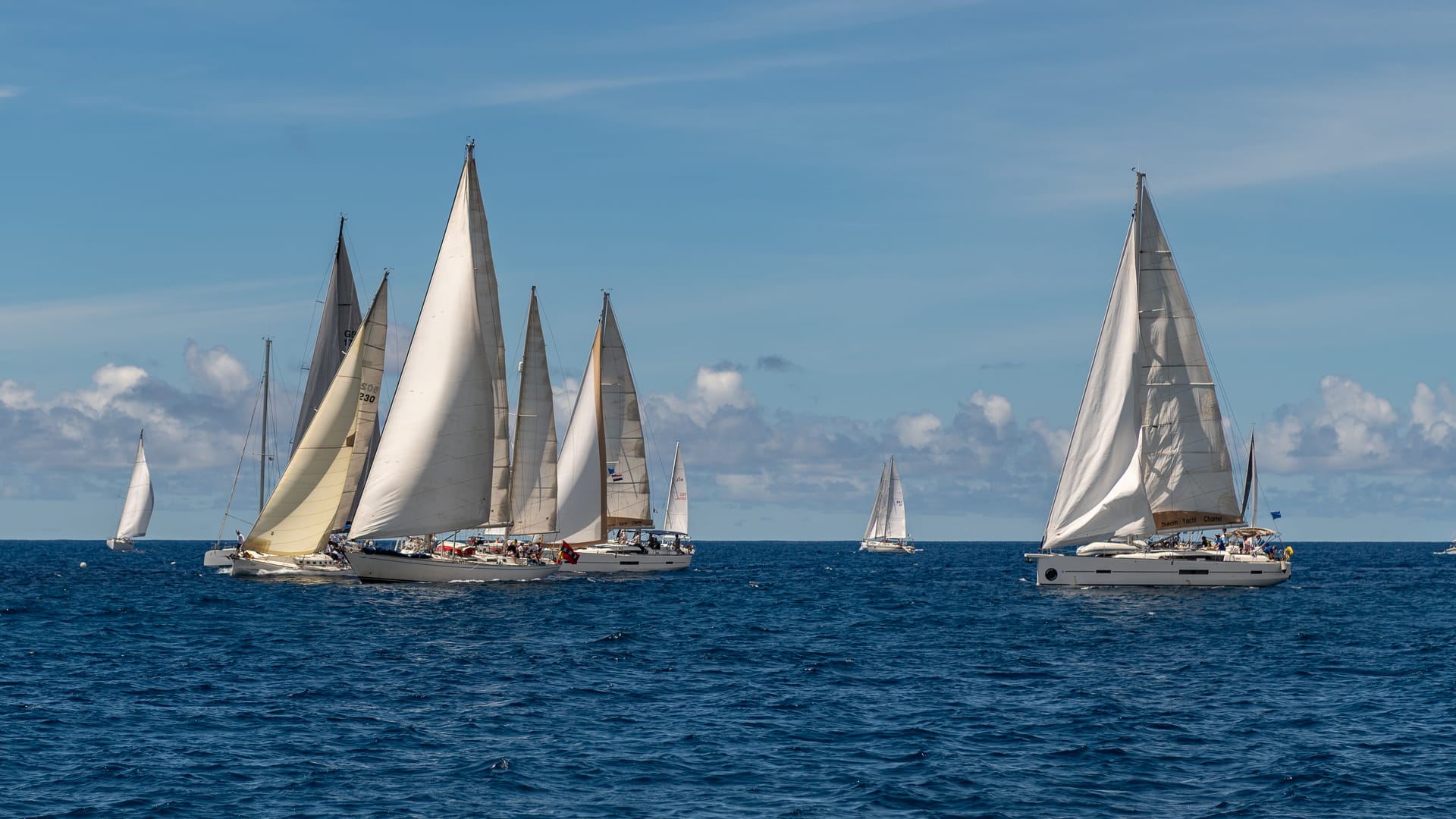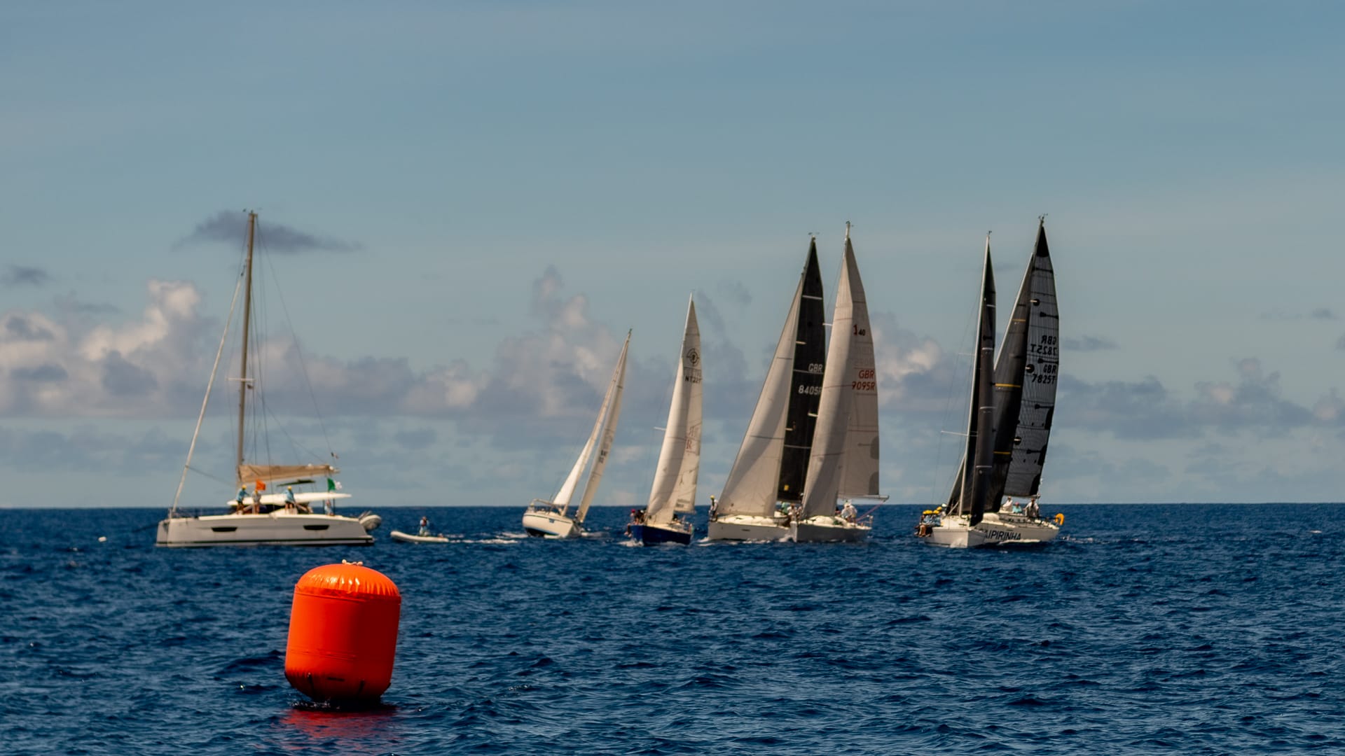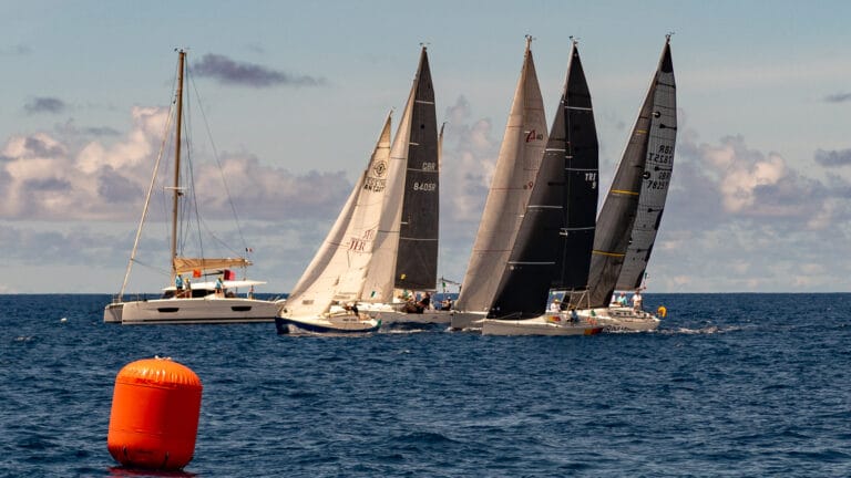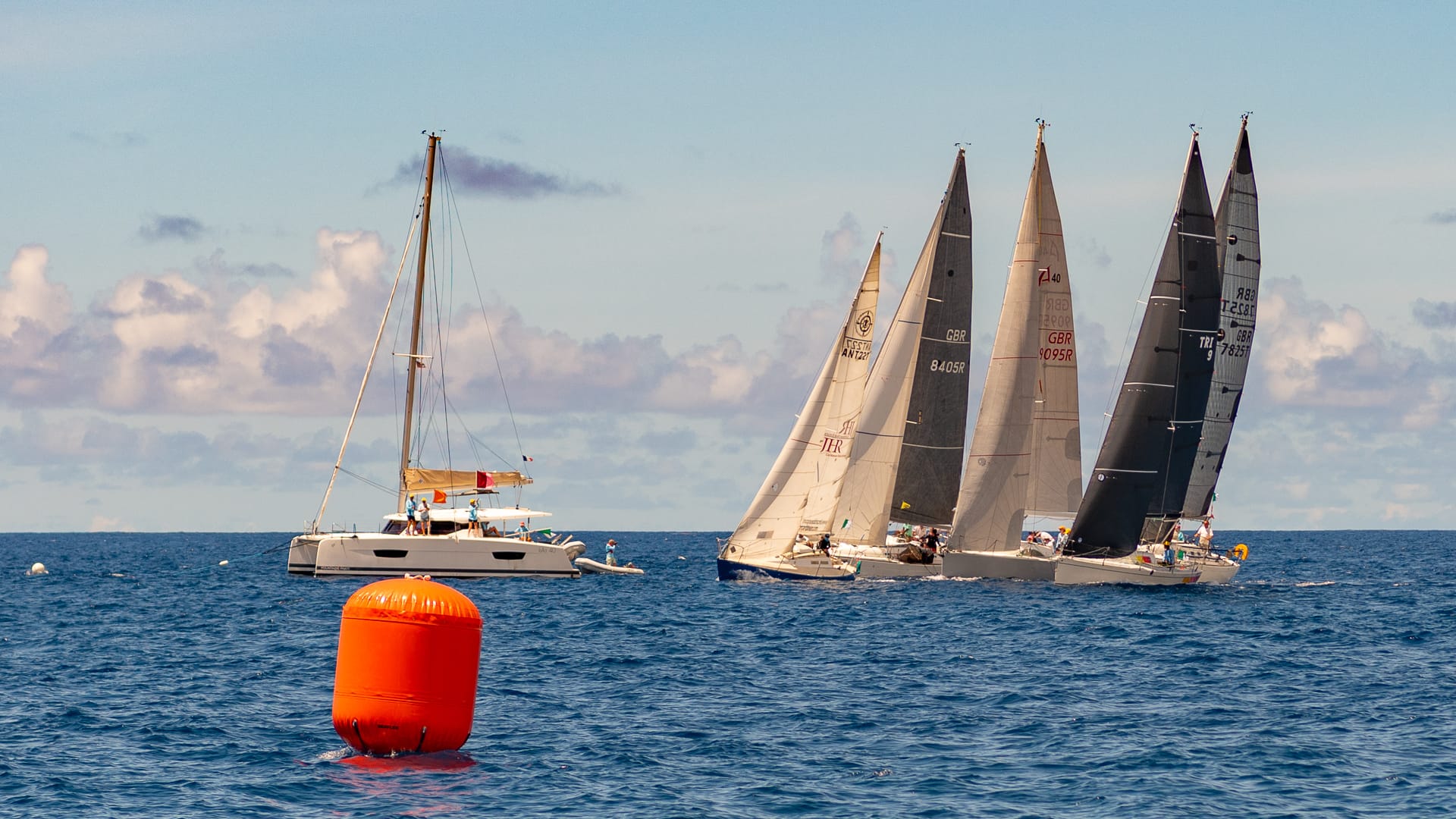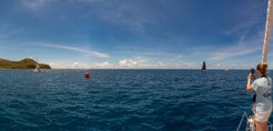 Today marked the beginning of the Antigua Sailing Week, and the starts were held outside of English Harbour, with the destination a set of buoys off Green Island. This is an upwind course and a bit of a slog against the waves in normal conditions. Luckily, the waves weren’t bad, and the light wind made for comfortable, if slow, sailing.