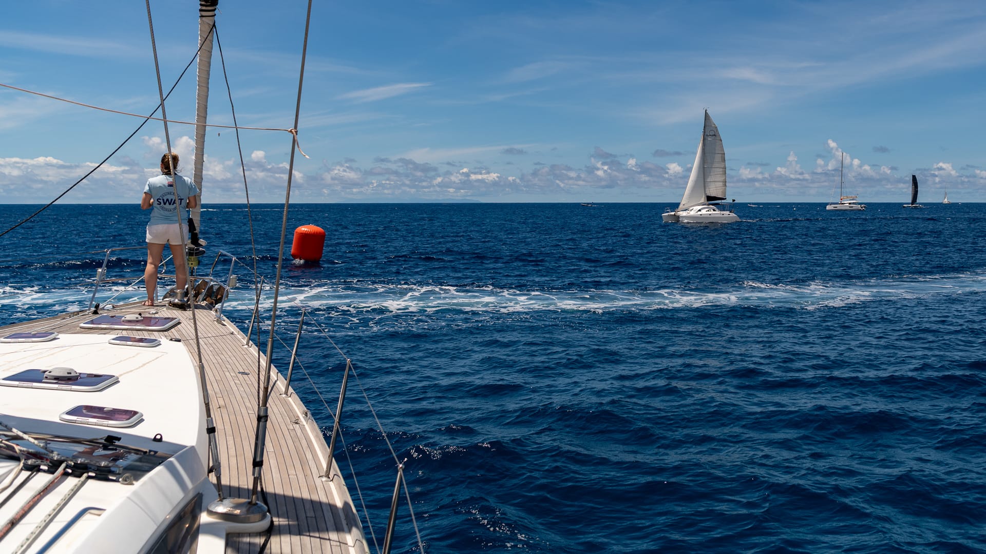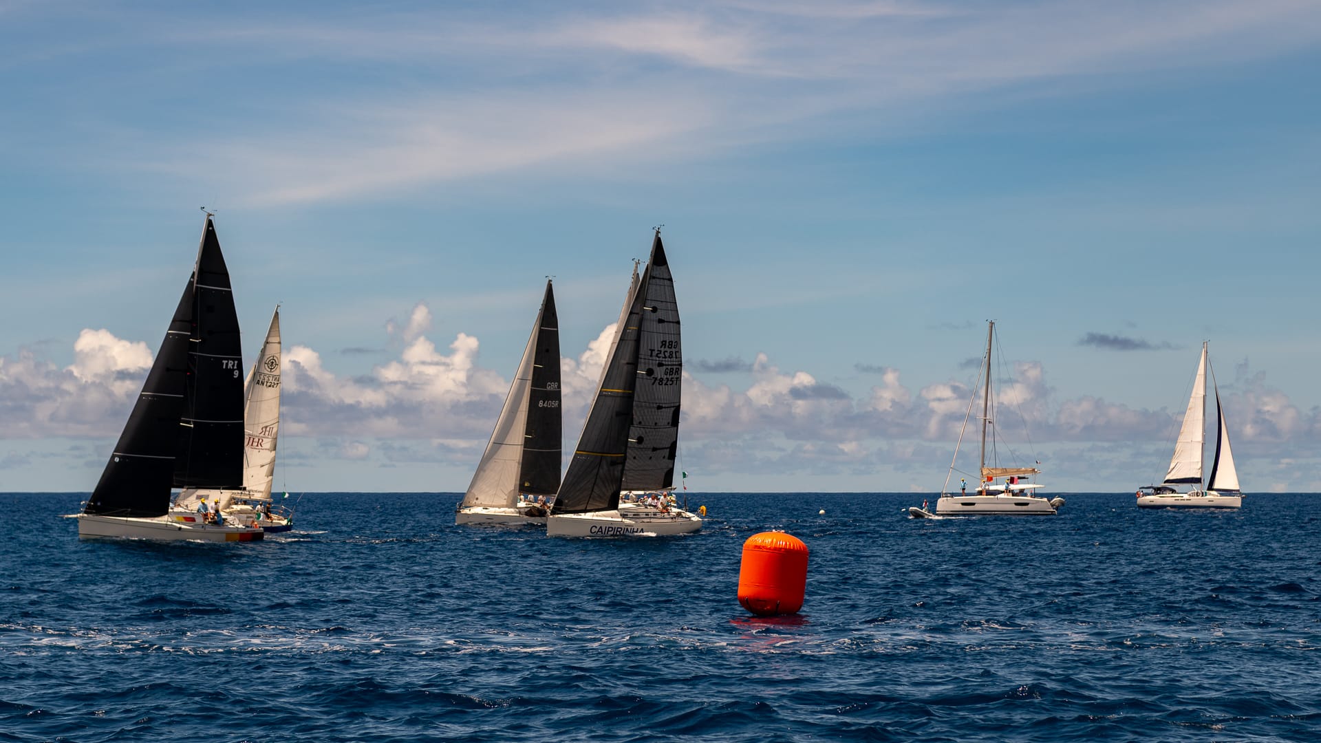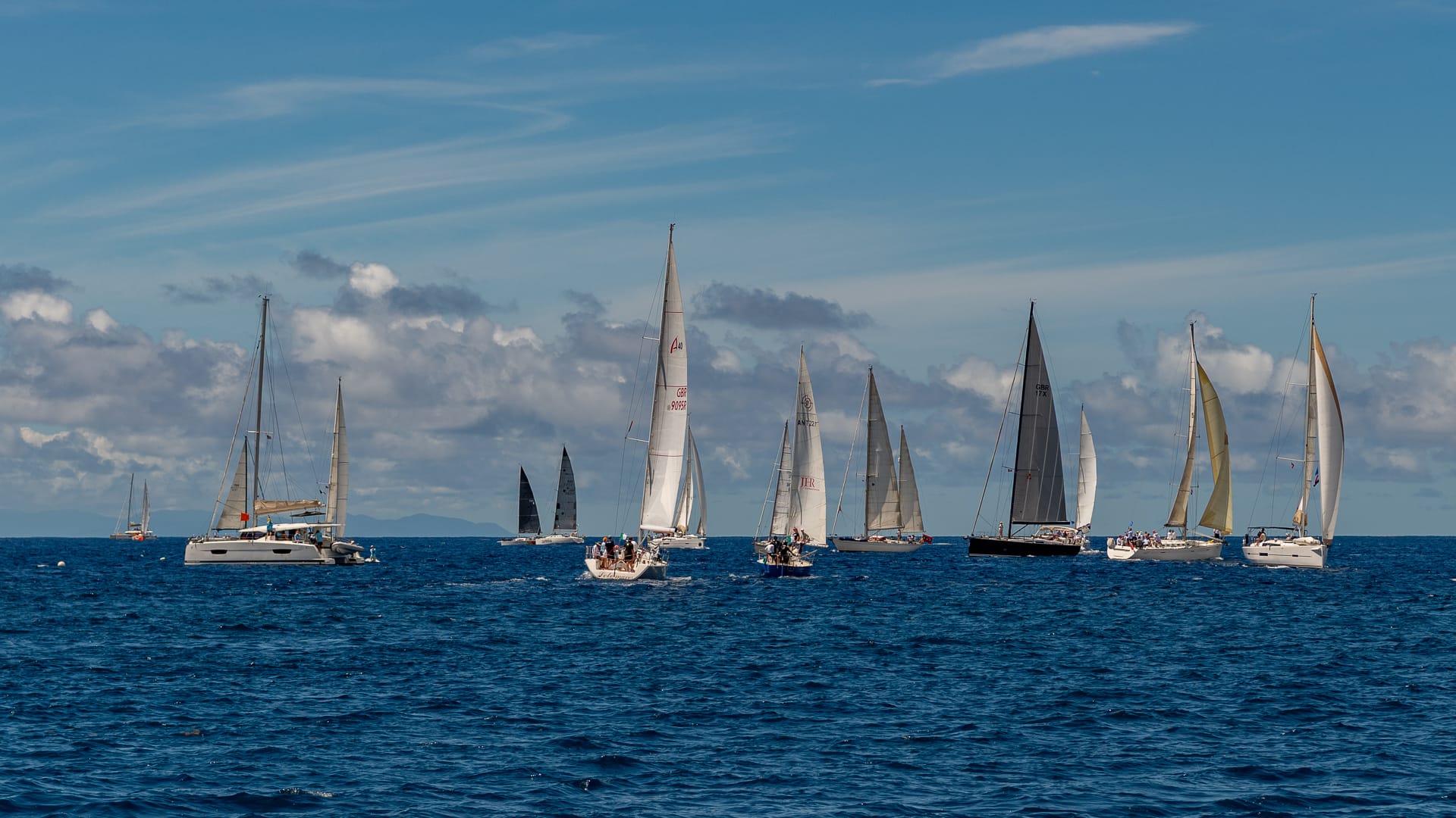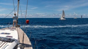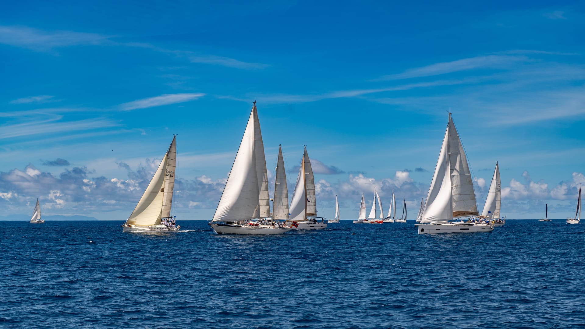 Today marked the beginning of the Antigua Sailing Week, and the starts were held outside of English Harbour, with the destination a set of buoys off Green Island. This is an upwind course and a bit of a slog against the waves in normal conditions. Luckily, the waves weren’t bad, and the light wind made for comfortable, if slow, sailing.