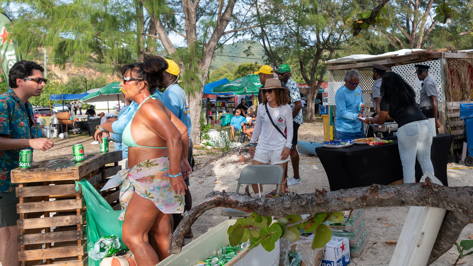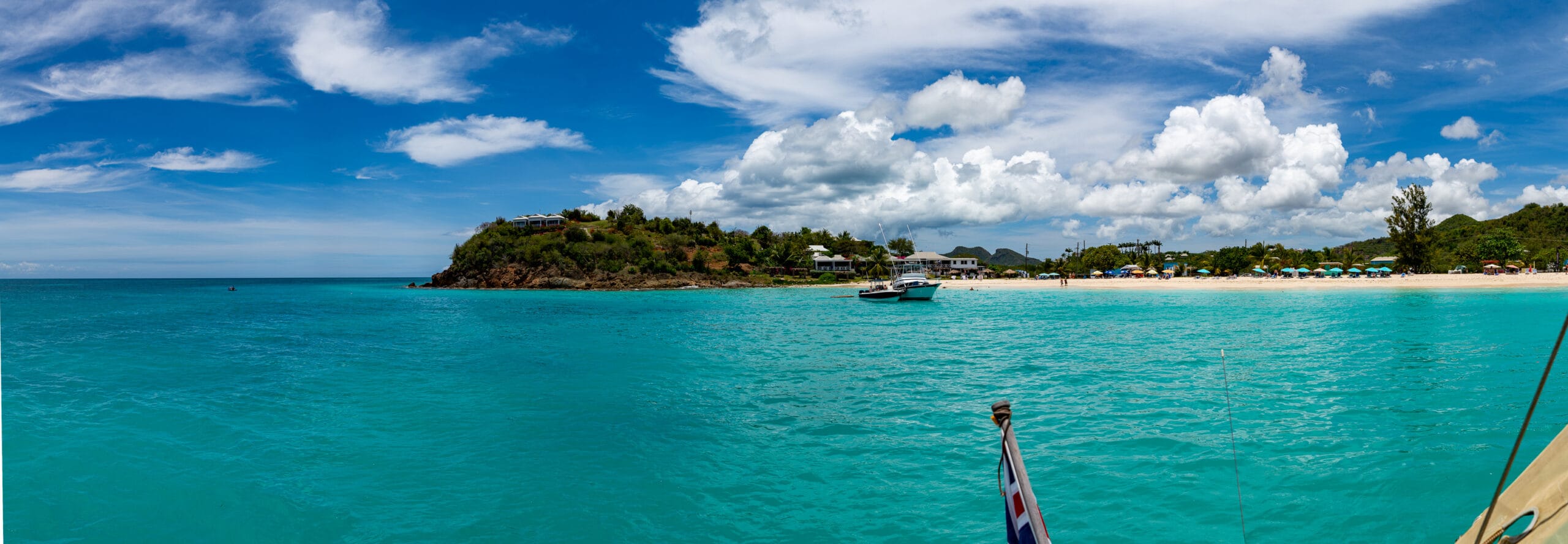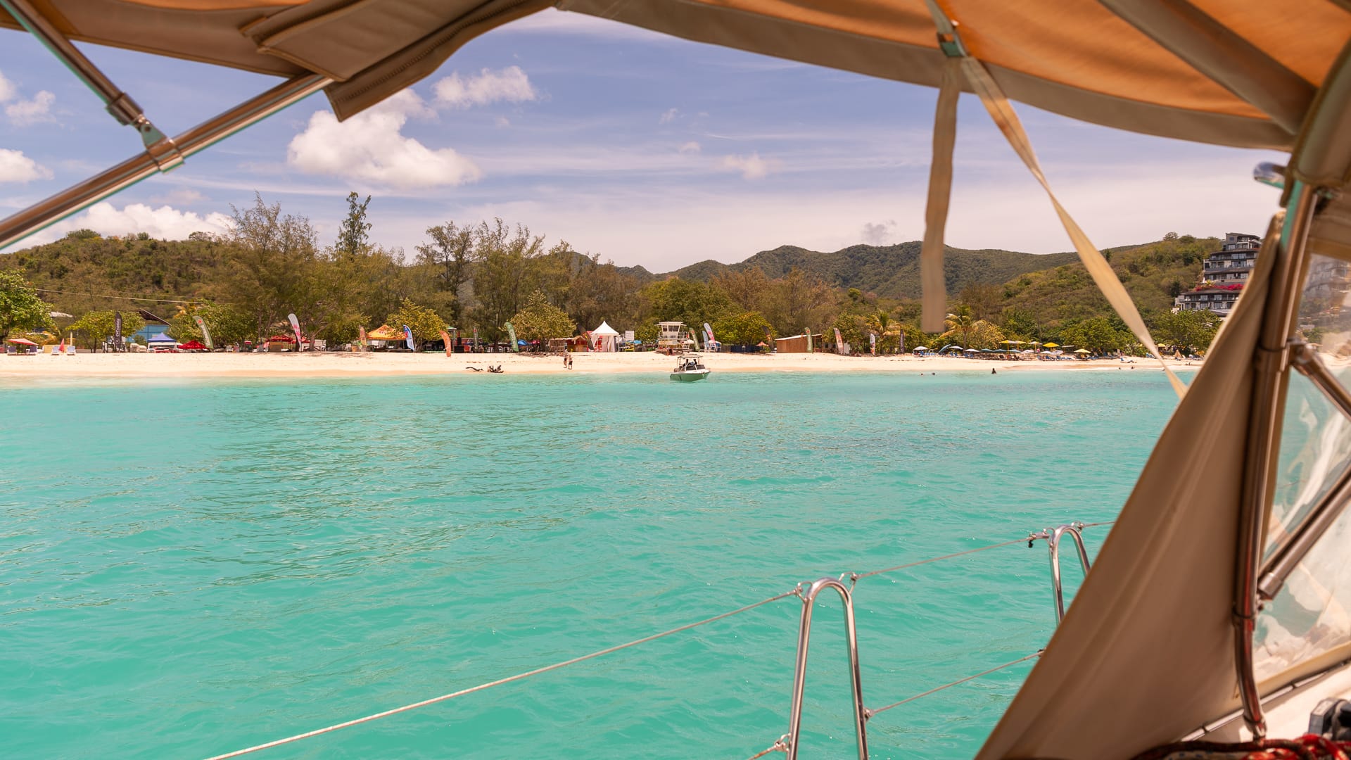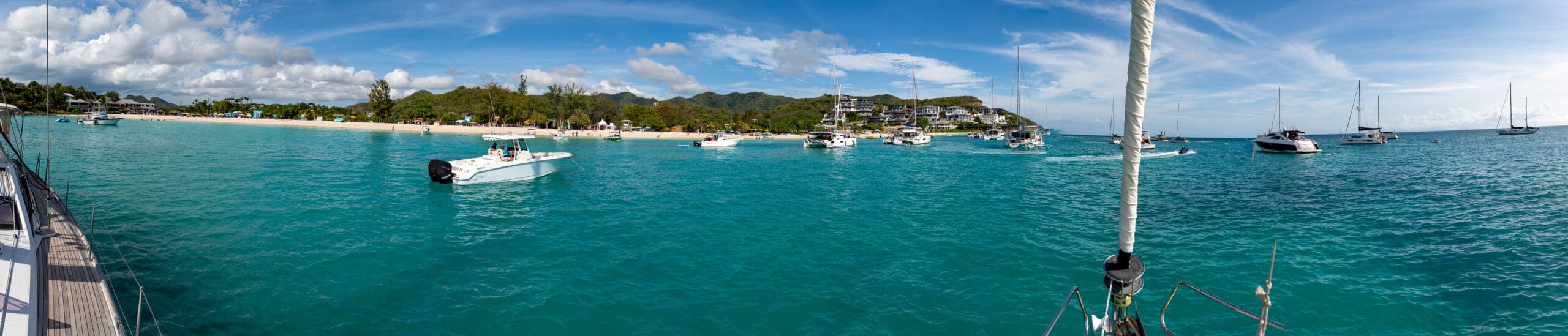 The winds were very favorable, and I was able to take a shortcut between the mainland and Boon Reef. When I arrived at Ffryes beach just before noon, there was already a lot going on ashore, but the music hadn’t started, and the anchorage was still mostly empty.