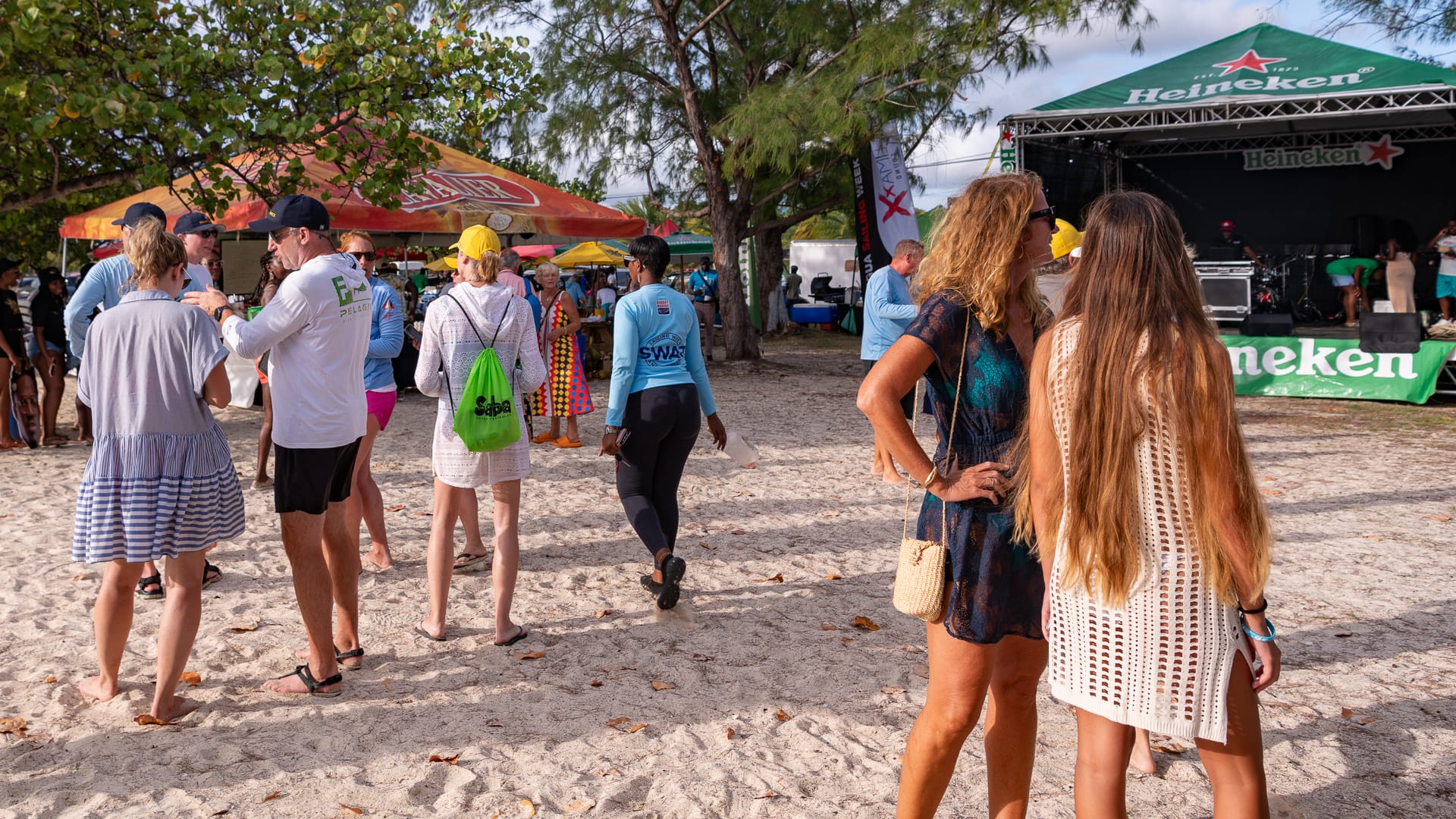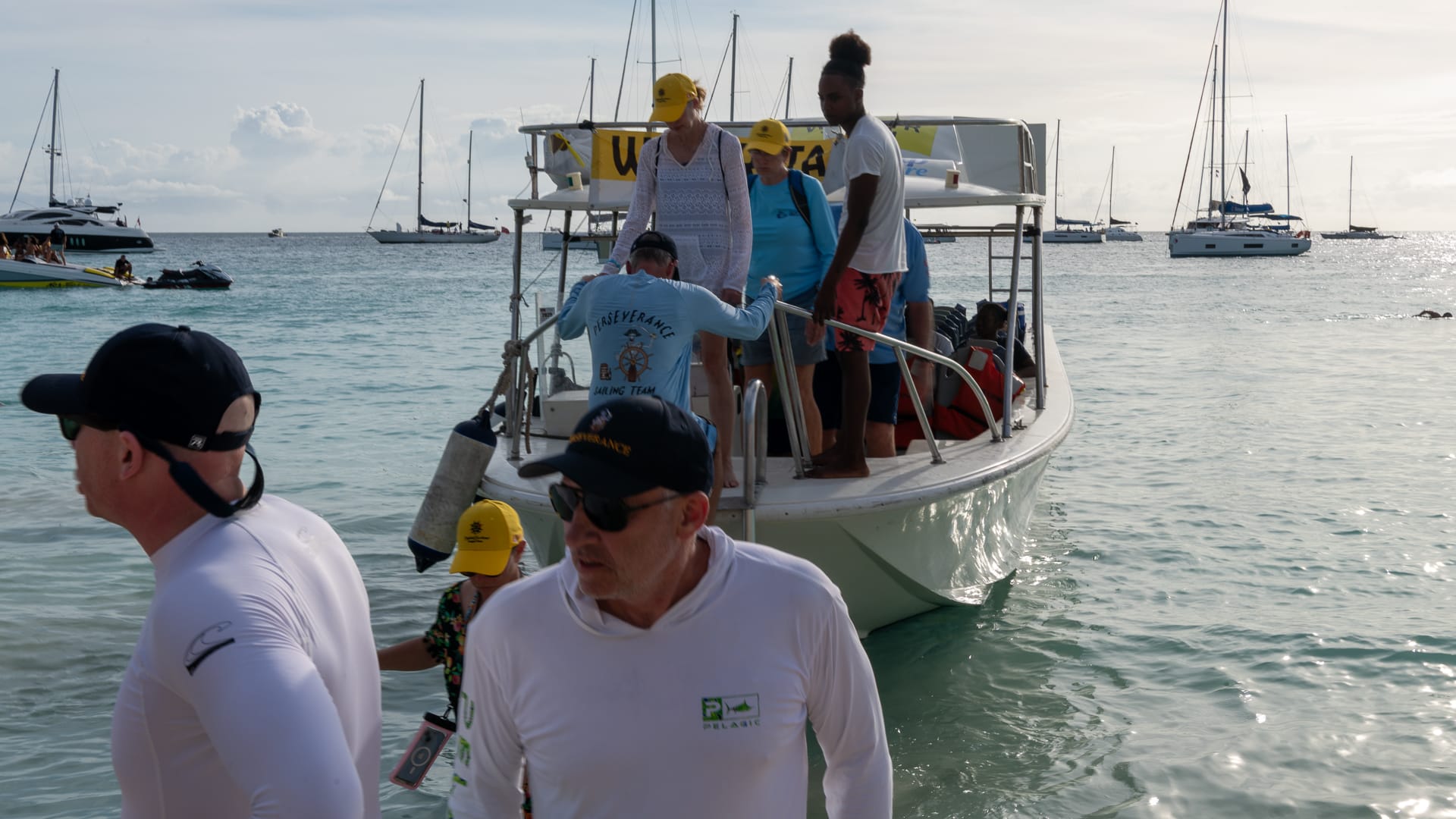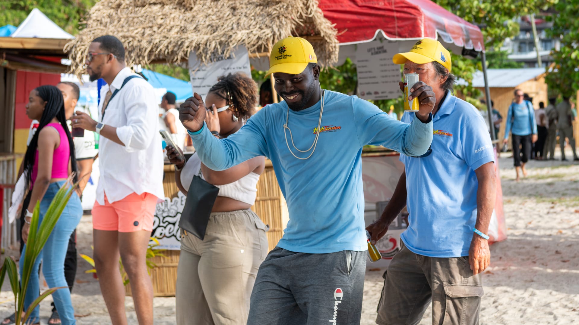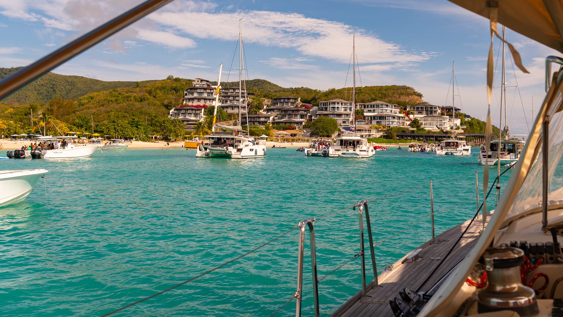 The winds were very favorable, and I was able to take a shortcut between the mainland and Boon Reef. When I arrived at Ffryes beach just before noon, there was already a lot going on ashore, but the music hadn’t started, and the anchorage was still mostly empty.
