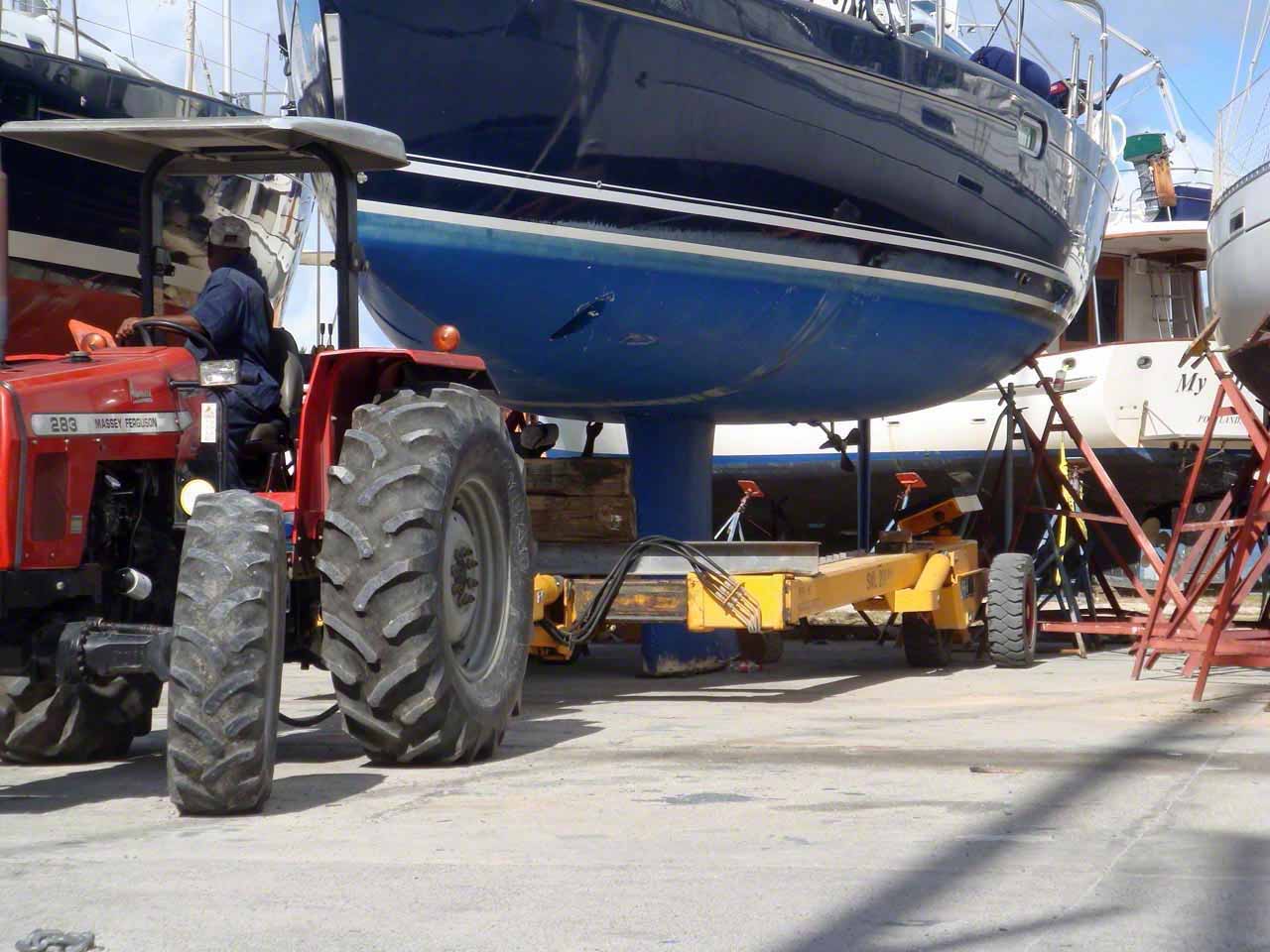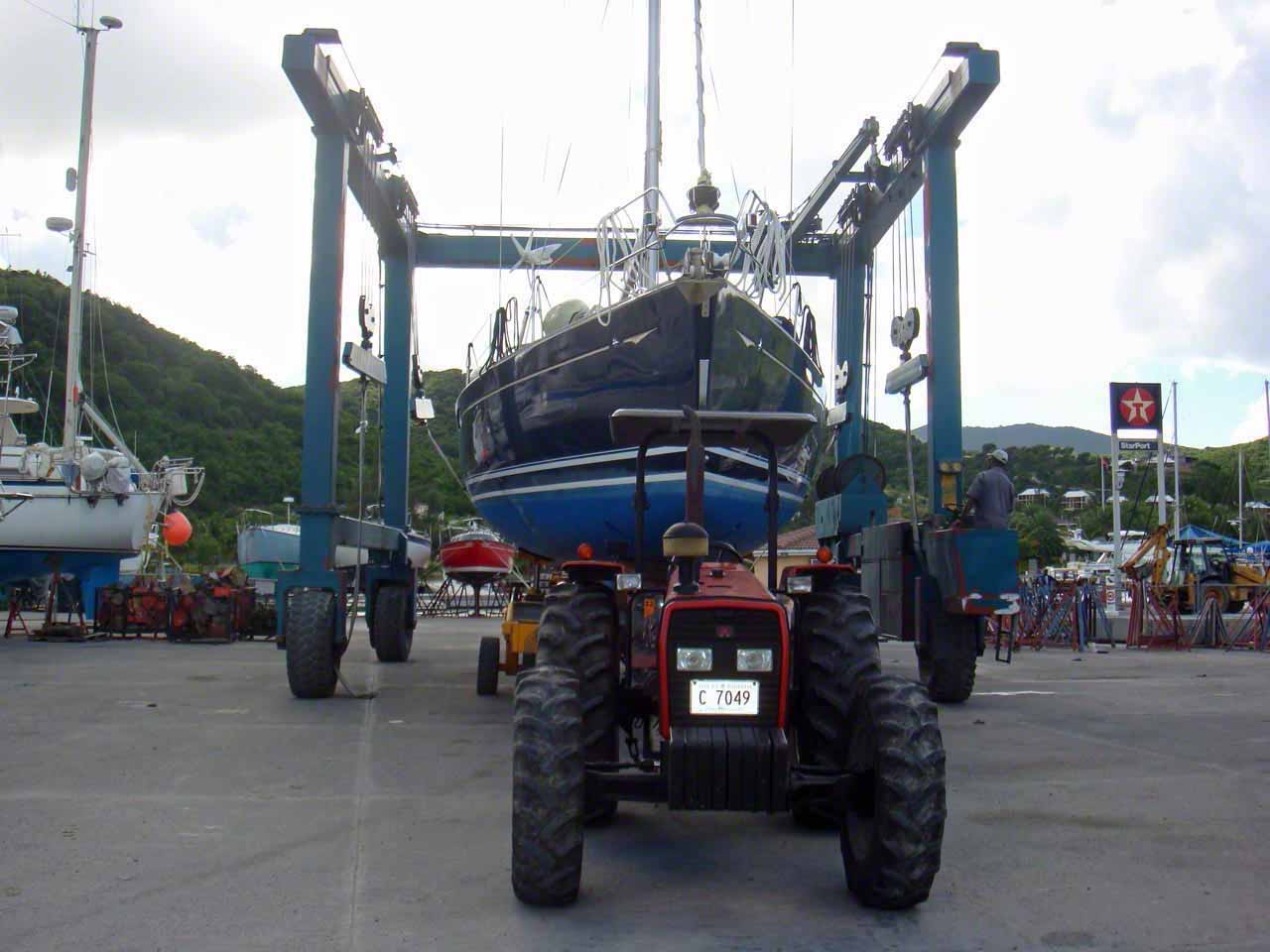 What a long day with very little achieved! I had grand plans of splashing Zanshin I, moving her to the docks and then getting the bimini up and the insides cleaned out. Unfortunately, the day didn’t quite pass that way. It all begin well enough, with the crew on land starting earlier than the planned 9:30 AM time frame. It was surprising how quickly they got going and removed the chocks and pulled the boat behind the tractor towards the Travelift, which would then move the boat to the dock and put her into the water. But we hit a major snag, which almost ended up in an altercation between the yardmaster and myself. As can be seen in the 3rd and 4th pictures, the wind generator doesn’t allow the Travelift to position the two hoisting straps correctly. The 3rd picture shows him up on the cherry picker looking at the clearance (none). He told me that I’d mounted the wind generator after being lifted out and I was just as adamant that the boat had been hauled with the wind generator already installed. We cooled down after a bit of back and forth and decided that we’d get on the picker and remove the wind generator An hour later all the screws were removed yet the wind generator refused to budge. I thought we could just remove the blades but 30 minutes of removing all the screws there showed us that I was in error. After over 3 hours of delay, they asked me if they could put the straps in a unmarked location aft of the marked hoist points to allow clearance. I acceded, since I figured that it must have been the only way to have the boat hauled in the first place, and if the boat didn’t snap in half upon haul out it wasn’t going to while going back into the water. The clearance was just a couple of inches, so I had had to get up on the boat and climb upon the aft railing to hold the wind generator away (look at picture 3 again, pretty high and the boat is just suspended on 2 big straps! I have no fear of heights and I was thinking to myself that in the USA this would have been a major disaster due to job safety regulations that wouldn’t have allowed anyone up there). At least I finally got splashed and, with the assistance of William the dock master, managed to get into a slip without getting a ding on the boat or the dock. But then we need almost an hour to get the power cord system fixed up and by the time I was finally ready to work on the boat it was past lunchtime and I’d already gotten my first sunburn and was bleeding from scraped knuckles, cuts on my fingers and some strange but painful laceration on my leg. It is now 19:30 and I haven’t done much inside the boat but just opened up my first Carib beer in 6 months and am feeling much better already.