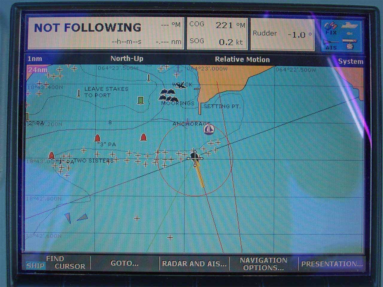 I’ve been into the Anegada channel several times with Solitaire, which didn’t have as deep a draft as Zanshin I and was therefore a bit apprehensive about entering. I had noticed that the tide was high when leaving the North Sound (and it was probably a spring tide due to the full moon the day before) but still had seen depths of “0” under the keel on Solitaire‘s depth sounder in channel, but to all accounts the channel should be 8 feet or more everywhere.         With all the electronic gadgetry aboard I used the Raymarine chart plotter, which had 3 red and green buoys and a well marked suggested route through the channel. While motoring to first pair of entry buoys which I couldn’t see I saw the second set, oddly enough I went right past them and they were well away from anything on my chart plotter. The depth sounder showed different depths to what the GPS and plotter told me and I didn’t feel comfortable with the angle that I was approaching the island at. I turned around 180° and idled on autopilot while I went below to consult the paper chart. On that chart there were only 2 red and green buoys (one of the greens has since decided to relocate and is no longer on Anegada) and I covered over the chart plotter and returned to the buoys I could see and used the suggested 084° bearing to enter the channel. According to the GPS the real entrance was right at the infamous coral heads called the Twin Sisters. I idled along the channel, as my depth sounder read a constant 2 feet, sometime going as low as 0.5 feet but never more than 3 feet; I figured if I hit ground at 1-2 knots I could easily back Zanshin I off the sand. After clearing the second green I turned out towards the reef and anchored in 8 feet of water, my depth sounder reading 1.5 feet. When I dived on the anchor I checked the depth and found that my sound was off by a bit and that I had 3 feet under the keel – I’ve since re-calibrated the sounder to give me a true reading.