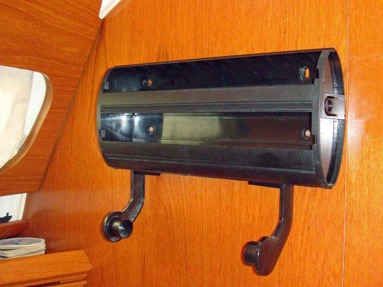 Since the sun was burning down outside and there was hardly any breeze, I started work below decks. The first thing (after shopping for water and turning on the fridge) was to attach my new knives and knife rack. I forgot the device that I had gotten to keep the knives in the rack during heavy weather, but I’ll manufacture a new one here and just remove the knives when underway until then. The two knives on the right in the picture are the only 2 knives that were originally aboard Zanshin I.