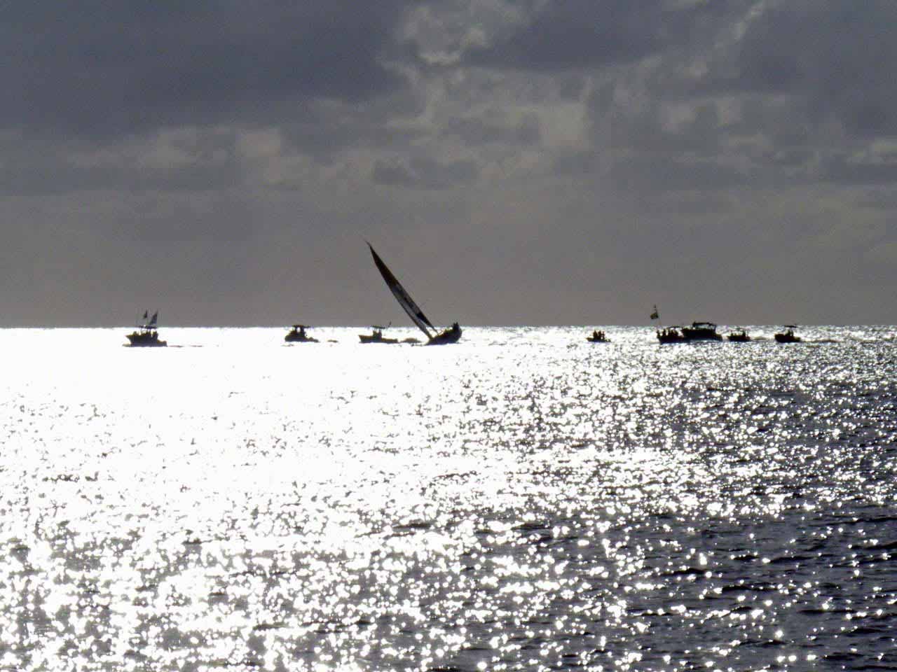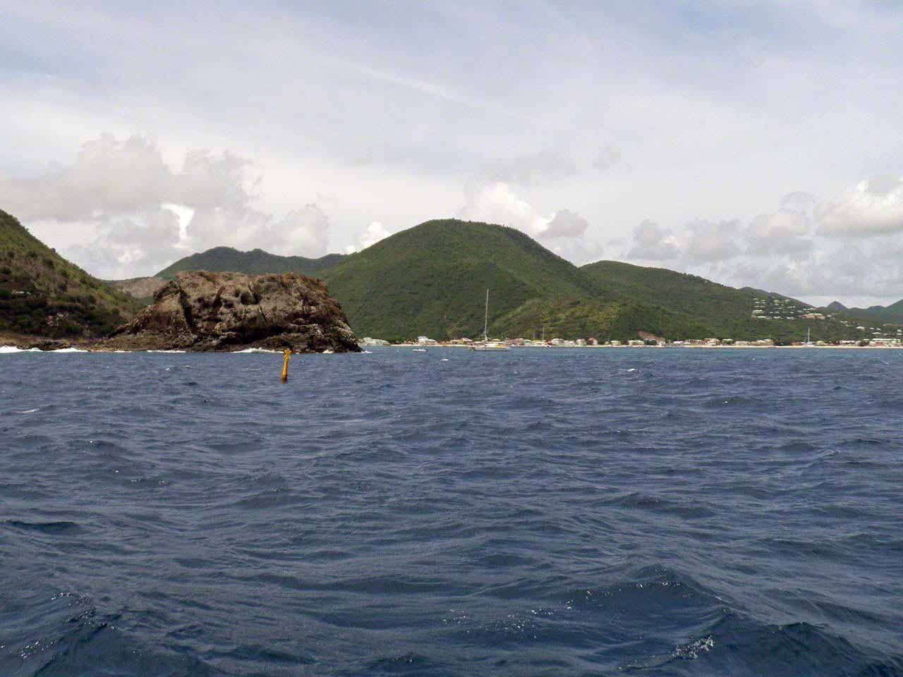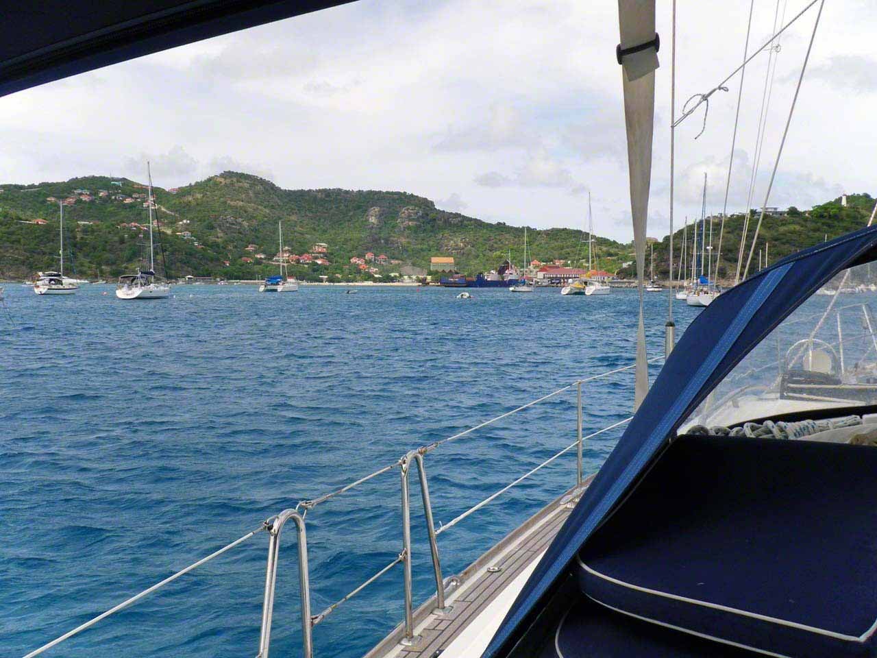 We cleared out of St. Martin early and had a leisurely breakfast before saying goodbye to Bruce on Sold the Farm and heading off towards St. Barths While I didn’t look at the weather, Bruce gave us a detailed report and the winds were, as predicted, 15-20 knots from the ENE with a short-period 4-6 foot Atlantic swell coming out of the same direction off a disturbance far to the north. While we pounded going against wind and waves from Marigot along the west coast we were partially protected by Anguilla but once we set sail at the north end of St. Martin we quickly hit over 8 knots and no longer pounded through the water. With 3 reefs in both genoa and mainsail the boat was just powered enough to make for a comfortable 4 hour passage with a respectable spot of speed. Björn did the whole route planning, passage, anchoring and buoy navigation for the trip