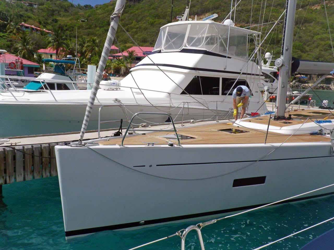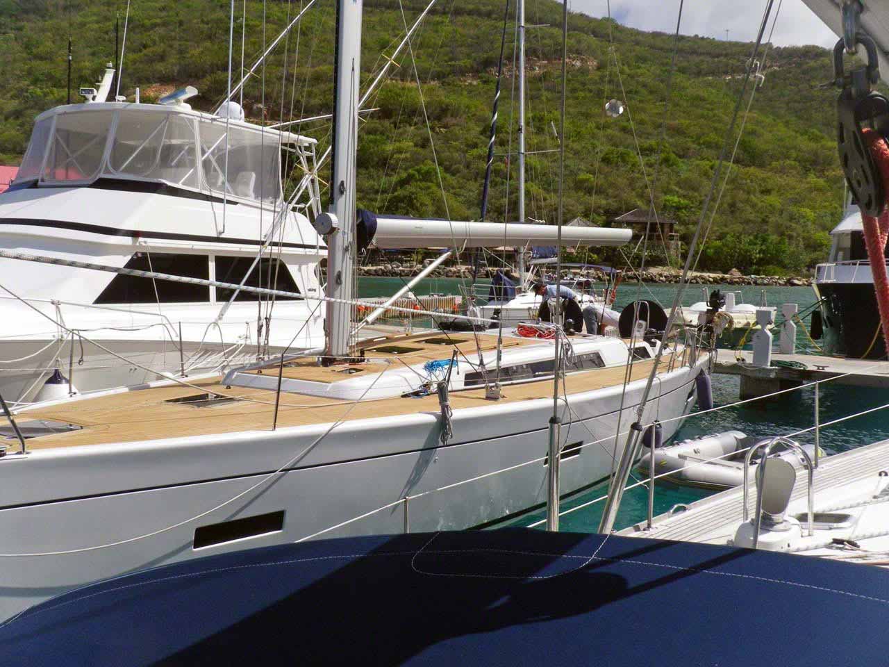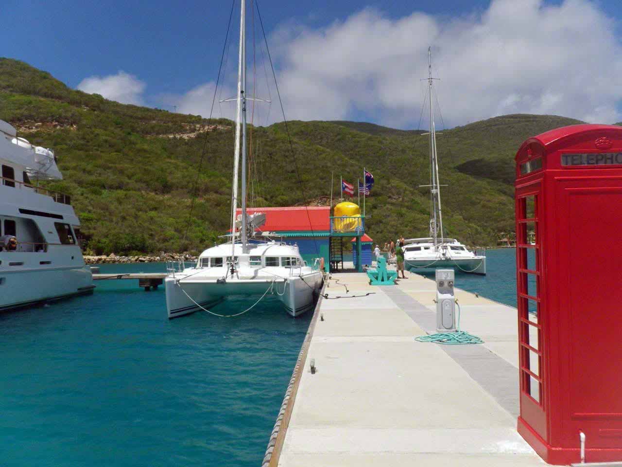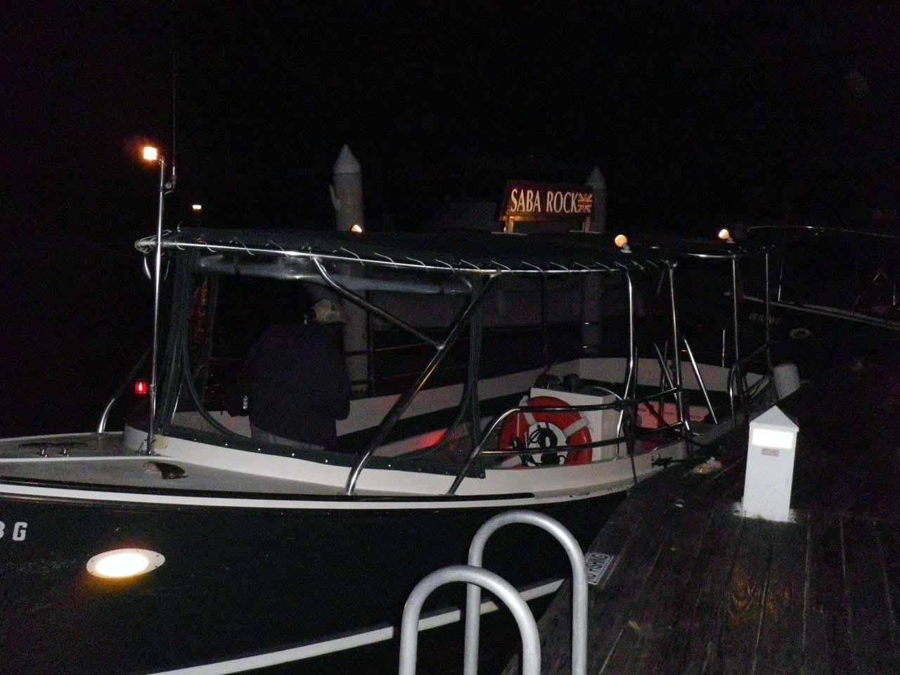Somewhat later I went outside to get the sail onto the dock and flake it and 3 people who were walking by on the docks came over to assist me and we made very short order of the work and I asked if they would accept the two bottles of extra dry sparkling wine that I still had in my fridge. They accepted on the condition that I assist them in drinking it so we headed over to their charter boat, the “Bonjour Matelot”, and proceeded to drink it. Somehow the afternoon went by quickly with Lisa, Michael and Phil and my reserve stocks of Stella Artois disappeared quickly. Several drinks and hours later, we all headed off on the Saba Rock ferry to have dinner there instead of participating in the big BBQ event at Leverick. Several people came by along the docks with whom we spoke and the sleek Grand Soleil went to the fuel dock but had a seized fuel cap which we attempted, with no success, to get open – it resisted both the magic effects of my PB-Blaster penetrating oil and the combined strength of 3 people and a long lever arm.