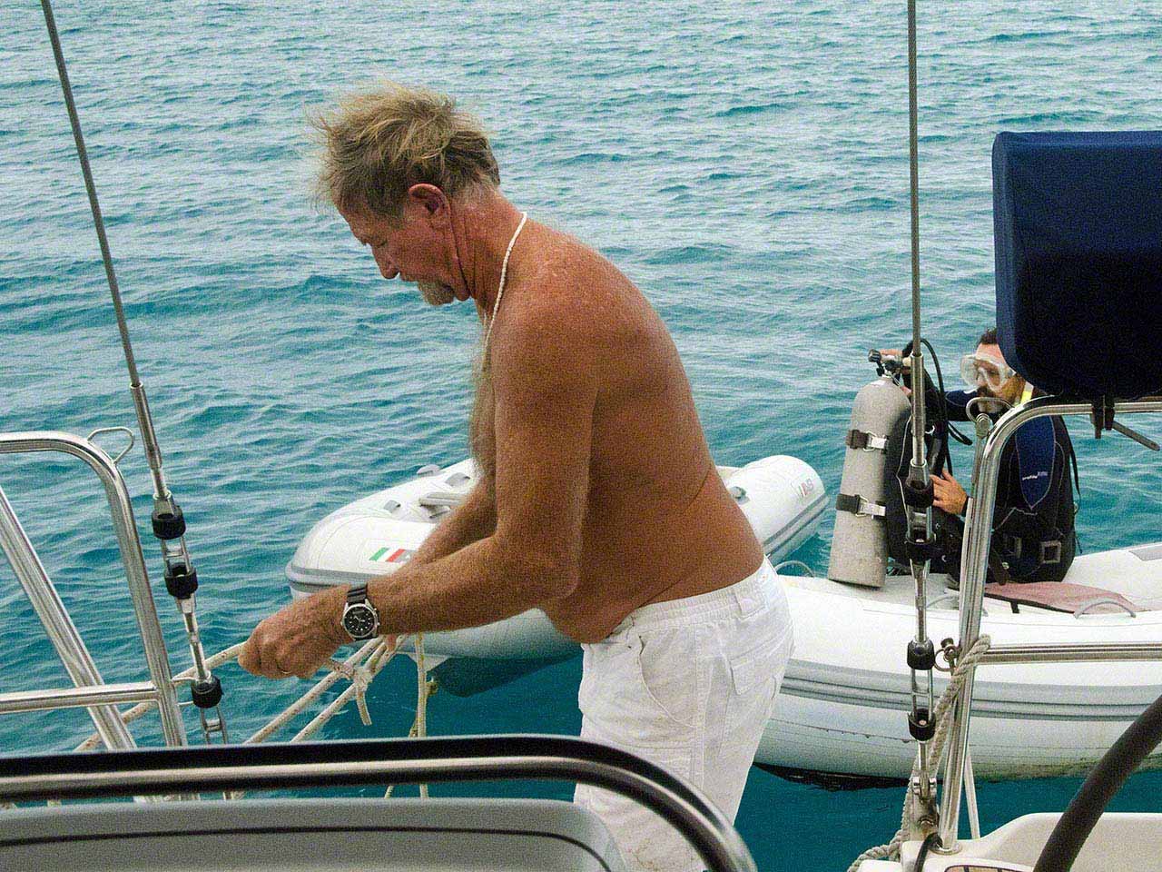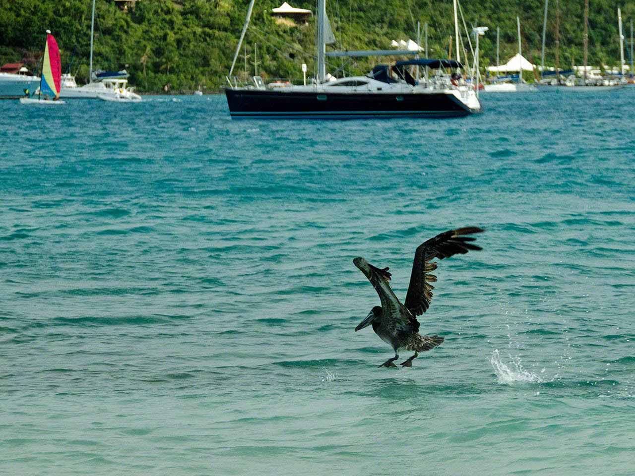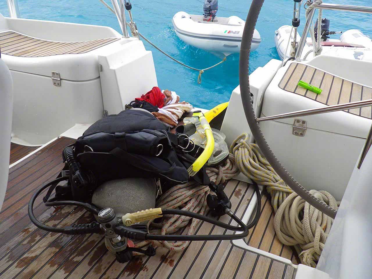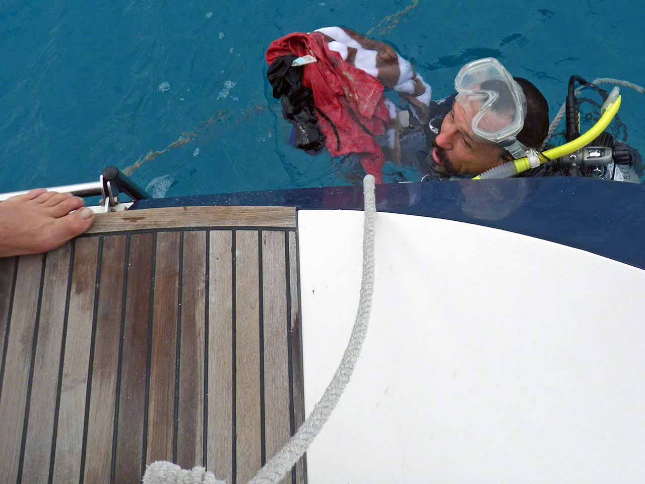 I weighed anchor at about 08:30 and Rob joined me for the short motor over to Leverick Bay, where we picked up Michael and Pamela, already attired in their wet-suits, and got a tank of air and proceeded across to the mooring field on Prickly Pear. We picked up the mooring that Michael thought was the correct one, as it was beside his marker buoy. He then dove on his marker in order to tie a sturdier line on it but it turns out that the buoy was no longer attached to anything and was being held in place by the weight of the line; it had been drifting around the field for a day and no longer marked anything. The light wasn’t great and the current made for murky conditions so Michael spent a good time looking for the dinghy with no luck. We then took another mooring, one that Michael and Rob were certain was the correct one, and Michael dove again. After a total of an hour bottom time (30-40 feet) he was back on the boat with no dinghy, but some assorted pirate treasure from the bottom. As he was low on air we decided to call it a day and return the next day with two tanks and that I’d dive as well.