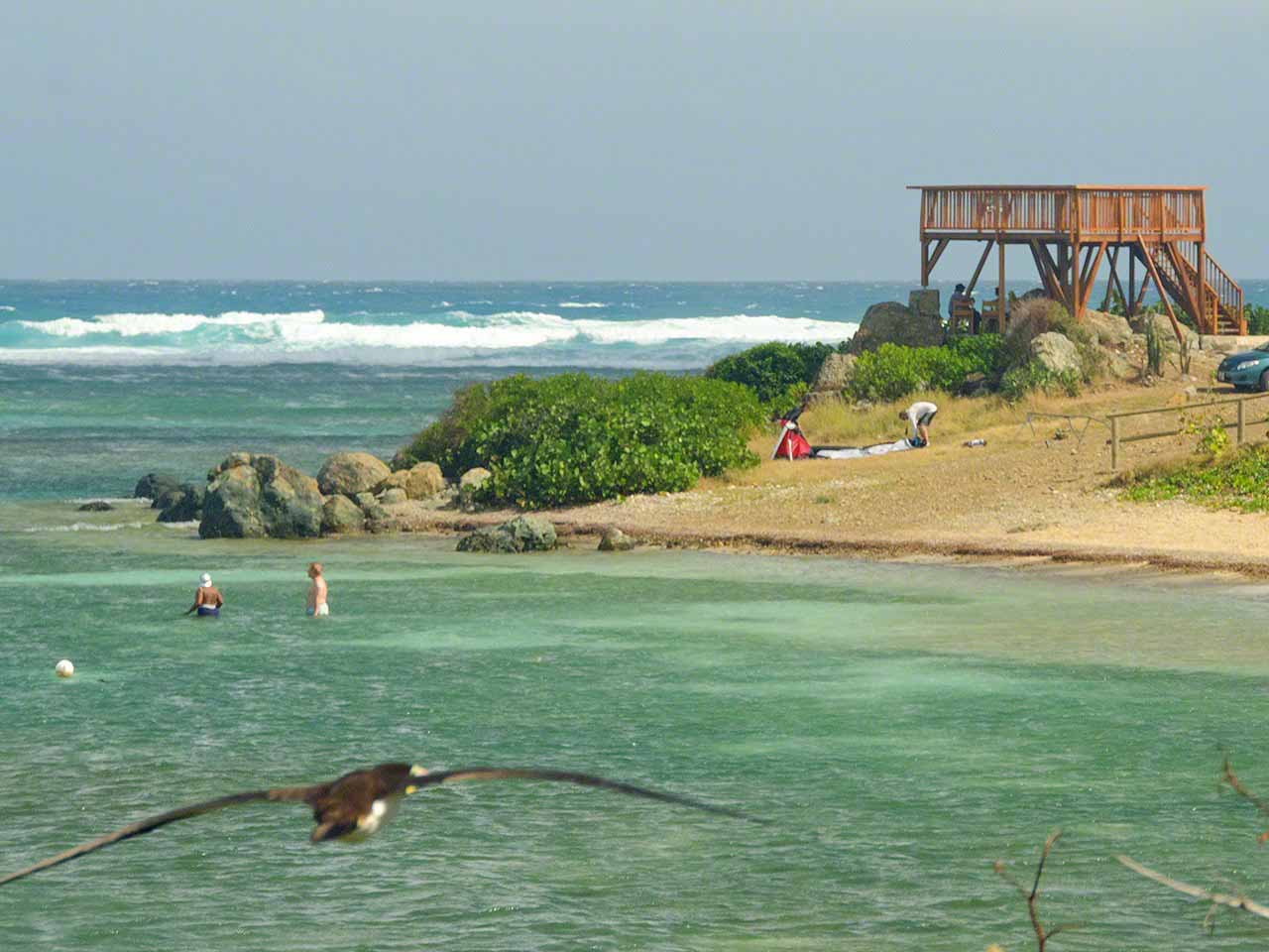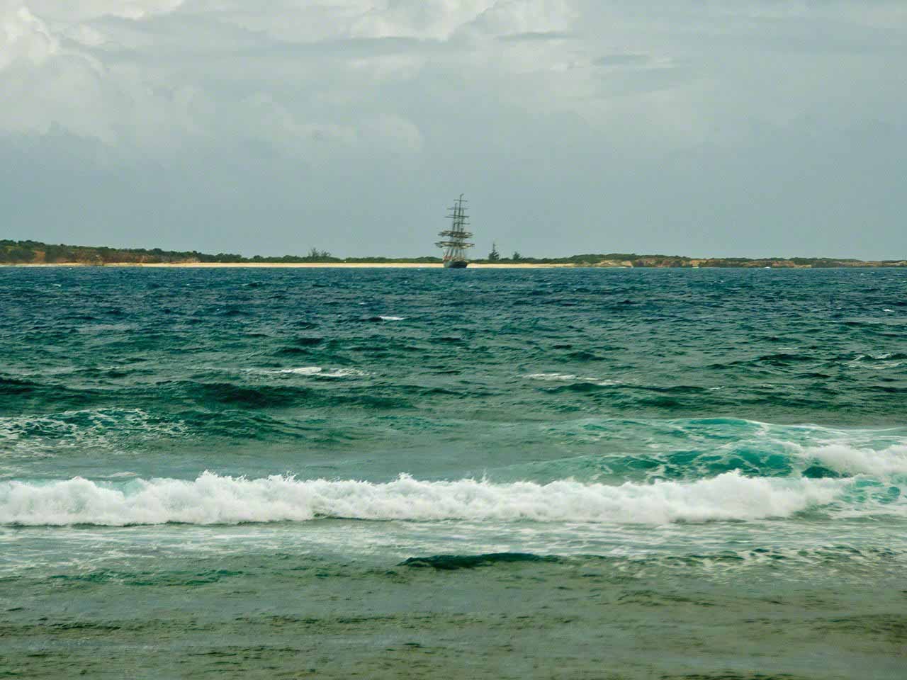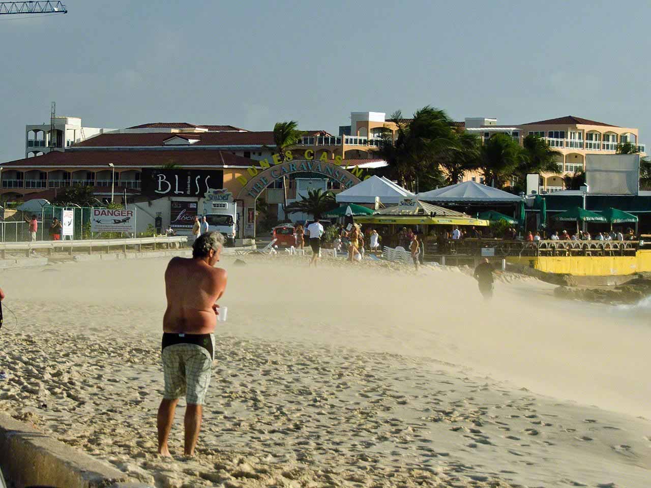 We did some shopping at the typical “yachtie” haunts – Ace Hardware, NAPA and then had a late lunch before hitting Island Waterworld, our final shopping stop. We managed to get past the Dutch bridge at 16:25, just prior to the bridge opening and then changed our plans and wanted to see the Air France Airbus land or take off from the infamous bar at the end of the runway to Princess Julianna Airport. Unfortunately, the jet was already there (I’d mis-remembered the arrival time) but we had some fun at the beach while waiting for the 17:30 departure. Rob was using a small digital camera which had some sort of random delay built in, so each time he set up for an artistic shot framing a tree, beach and an approaching aircraft he got a wonderful picture sans jet.