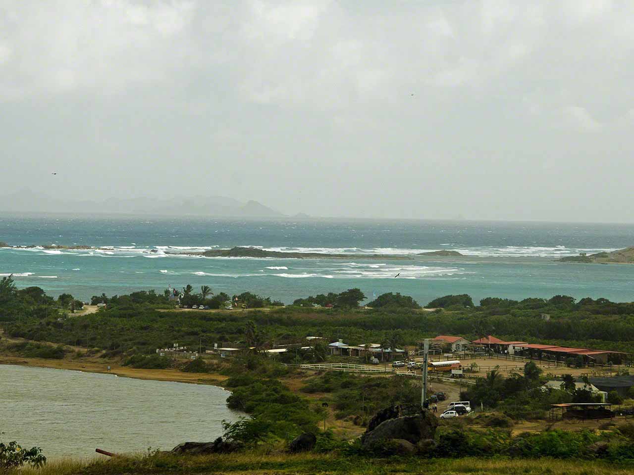 The winds were howling around the island at 30 knots today, so it was time to do shopping and a tour of the circumference of the island with Lauren & Rob. We started by passing the airport, then driving by the new development projects at Cupecoy and threading our way past the hidden villas on the NW side of the lagoon to end up in Marigot, where we successfully found a parking slot and had breakfast at La Sucrière before continuing on our journey. We bypassed Grand Case and visited the NE coves and shore. Continuing on our trip we looked at the difficult cut getting into Oyster Pond and decided that no boats were going to go in or out, since any skipper experienced and skilled enough to transit the channel would know better than to even try to leave the safety of the harbour.