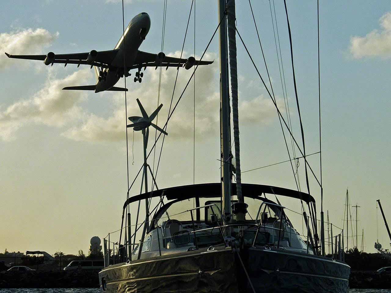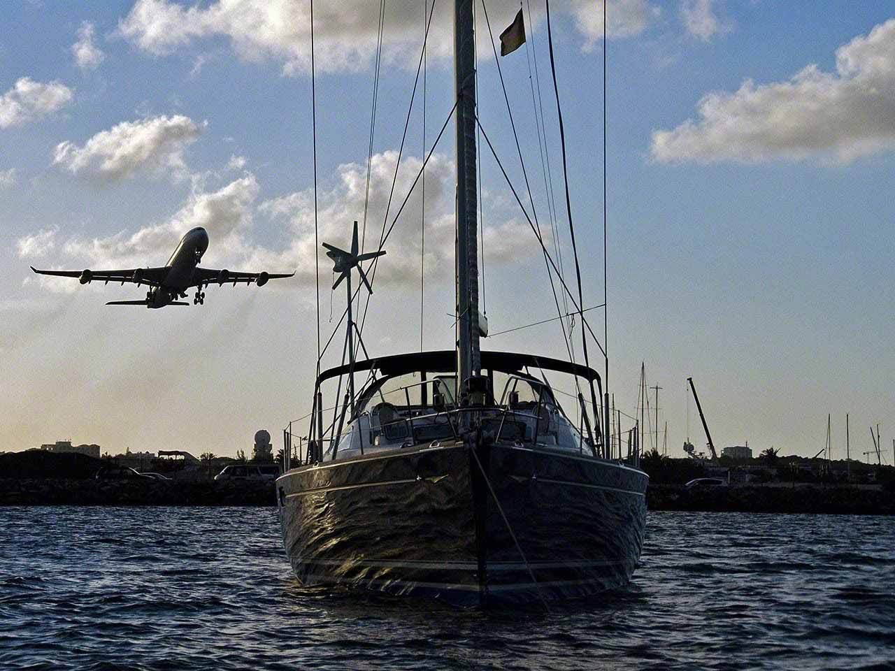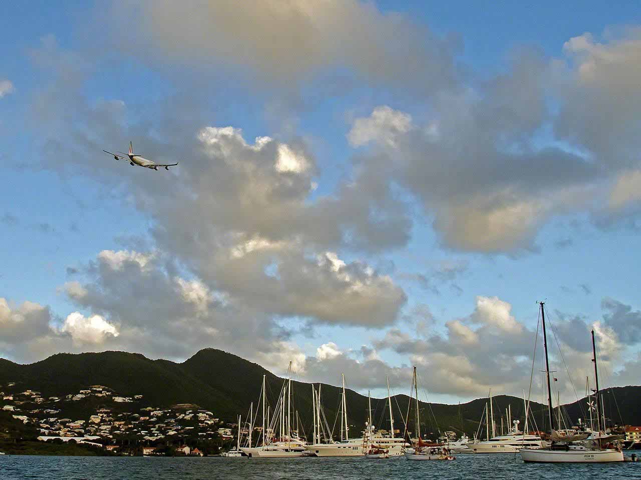 I dinghied over to the French side for a breakfast at La Sucrière and to connect to the internet this morning and it does look like my cargo vessel has arrived and my cases should be ready for pickup in the next two days; a day after that I’ll finally be able to depart. I don’t have any news about the generator, but I don’t really miss that while I’m alone as the wind generator takes care of my power and I run the engine for an hour every two days to get hot water and charge the batteries with another 50-60 amp hours. I really should install my LED anchor light as that will cut down on my energy use significantly. The weather is cloudy and windy with occasional threats of passing showers and I cannot get myself into gear to do anything productive. I’m postponing heading upwind to the stores to get an oil filter so that I can complete the oil change as I don’t want to get wet and somehow I have so much small stuff to complete below decks that I don’t know where to start and the net result is that I turned on the notebook in order to write some blog entries. I headed off to Island Waterworld and Budget marine to purchase oil filters and visited Quantum (who had come by in the afternoon to measure the winches/wheels for making covers) to accept their offer under the provision that the work would be finished during the week and returned to the boat in time to get ready for a shot of the big Air France airbus A360 taking off with Zanshin I in the picture.