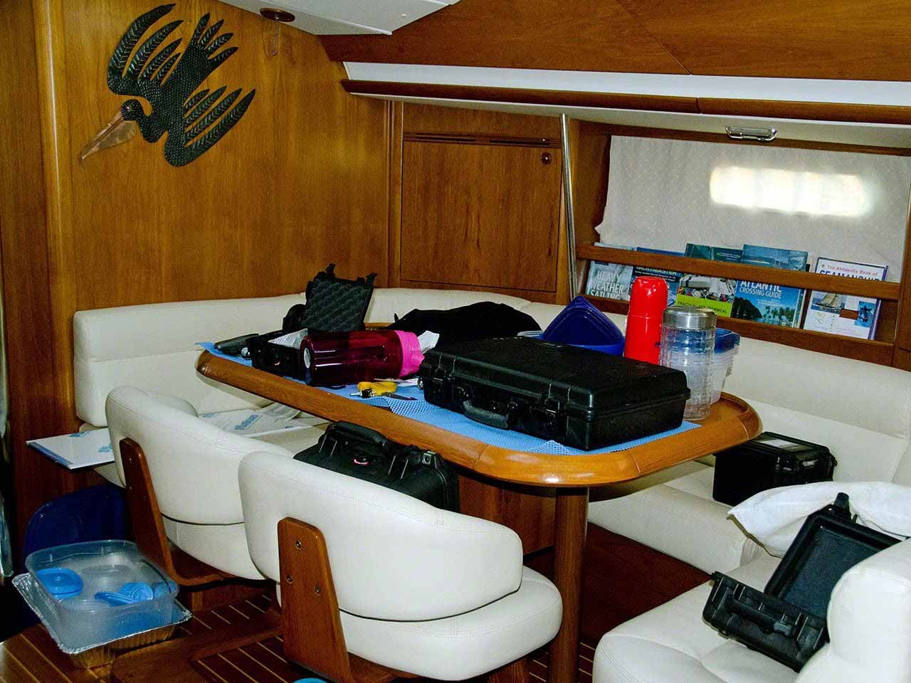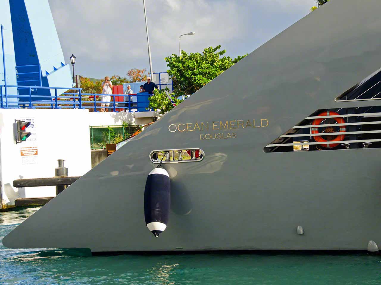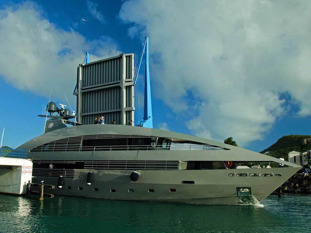 The day started with an 07:30 coffee and listening in to the radio network on VHF. Looking around the main cabin I’m not sure that I can get ready to leave in the immediate future, but I’m going to do my best to get ready for departure as it is time to leave for anchorages more blue. Apart from a morning trip ashore to pay for the canvas work (Quantum Sails did my 4 winch covers, 2 wheel covers and that for the NavPod and chart plotter) and then to the French side to pick up my laundry, get a croissant and coffee at La Sucrière and fill up the dinghy gas tank I was aboard all afternoon, alternating between doing inventory/repacking into the Peli cases and working topsides cleaning the old lines so that I can store them for future use. Although it doesn’t seem as if I’ve made much progress in the cabin I know that I’ve made significant progress towards completing storing and cataloguing everything. In the late afternoon I went topside and saw a very strange looking large yacht, which turned out to be the Ocean Emerald, heading towards the bridge on the Dutch side for the 04:30 opening. I used that as a welcome excuse to get off the boat and dinghied over to the C&I dock at the bridge in order to get some pictures of this odd looking mega yacht transiting from the Lagoon to the outside world. I’m still not sure what to make of the yacht – while the curves and splines are elegant I don’t know if I’m pleased or disgusted by the yacht’s form. After the welcome diversion of the bridge opening I returned to cleaning and drying the old lines and storing my “stuff”. I fired up the barbie for a grilled early dinner and tried to watch one of the many movies that I had on my disk drive but wasn’t interested enough to watch it to completion and finished reading the book I was reading; the next one will be a book I’ve been loaned titled “Pirates Aboard!” which goes over case studies of pirating and theft on cruising yachts.