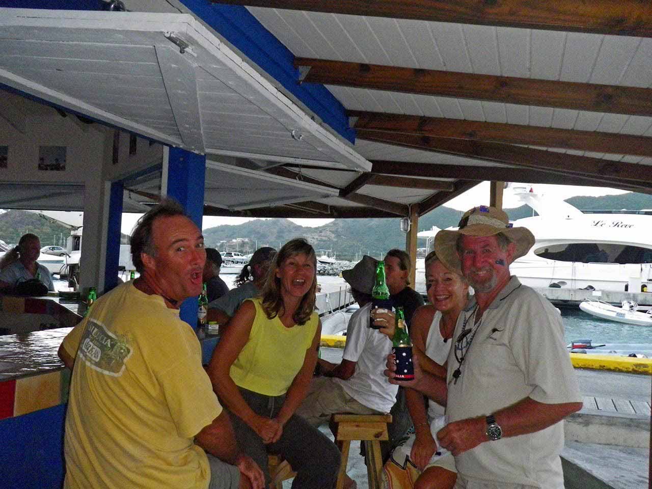 Today started off early, with the 07:30 radio giving good news about the wind and waves for the next couple of days. In addition, today is Australia Day and it will be, in the words of a true Aussie, a “real piss-up” tonight. I went to return the rental car for the 08:30 time and place we’d arranged at Lagoonies, but she was an hour late and I got off the dinghy dock just in time to see a couple of the bigger yachts enter the Simpson Baie lagoon at the tail end of the 09:30 opening. After that I went to (another) car rental company to clear up a case of double-charging me for my 1-day jeep rental to pick up the cases and it turned out that I was wrong, the extra charge was for a previous rental and they just submitted the bill a week late and it coincidentally was charged to my credit card on the same day. Then I cleared out of Sint Maarten with destination St. Barths and am back aboard the boat, all that before 10:30am. If the rest of the day is as productive I’ll have all my tasks and chores done before the piss-up tonight! Heinz-Dieter of Pinta and I had planned on cleaning our dinghies at a small beach inside the lagoon that he knew of, but he changed his mind and decided not to clean his until shortly before he was going to leave but showed me the beach and also helped me with the outboard engine and turning the Caribe dinghy over on its back. I had some sort of bottom paint left on that did an acceptable job of keeping down the growth, but still had some scraping of barnacles to do and then used a Scotch pad and sand from the beach to get the rest of the gunk and crud off the bottom. My main impetus for the work was to avoid the stink of dead and rotting growth when I got the dinghy aboard for the passage. The afternoon was spent busily completing work aboard the boat and I got Zanshin I almost ready for departure, including finally finding a way to get the large square Peli 1640 case into the aft cabin. I had tried a couple of days earlier with no success as it wouldn’t fit through the door. I measured the doors again to see if the case might fit if I removed the top and was surprised to see that both aft cabin door had different sizes and I’d tried the one that was 2cm smaller. With the lid of the case open I managed to squeeze it in. After the case I cleaned up the main cabin and went shopping for fresh provisions ashore, and by that time it was 17:00 and the Australians were all raring to go and celebrate. We had heard on the radio network that there was to be a party at a restaurant on Isla del Sol and we dinghied over to the dock, to be met by a friendly employee who asked us to wait for the main gate security guard to come and allow us entry. After a while he came by on a golf cart and then it turned out that they wanted picture ID and would keep it until such time as we wanted to leave; it would seem that they wanted to keep out the sailing riffraff and cruising hoi polloi from their exclusive docks where all the mega yachts on steroids were resting. This wasn’t to our liking, and by this time there were quite a few Australians and sympathizers on the dock but we all opted to leave rather than going to our respective boat and retrieving identification and subsequently leaving it at the ramshackle gate and we headed to Barnacle’s which was rather busy but with only a few Australians scattered about. I made the mistake of staying there far too long (23:00, which is the cruiser equivalent of pulling an all-nighter)