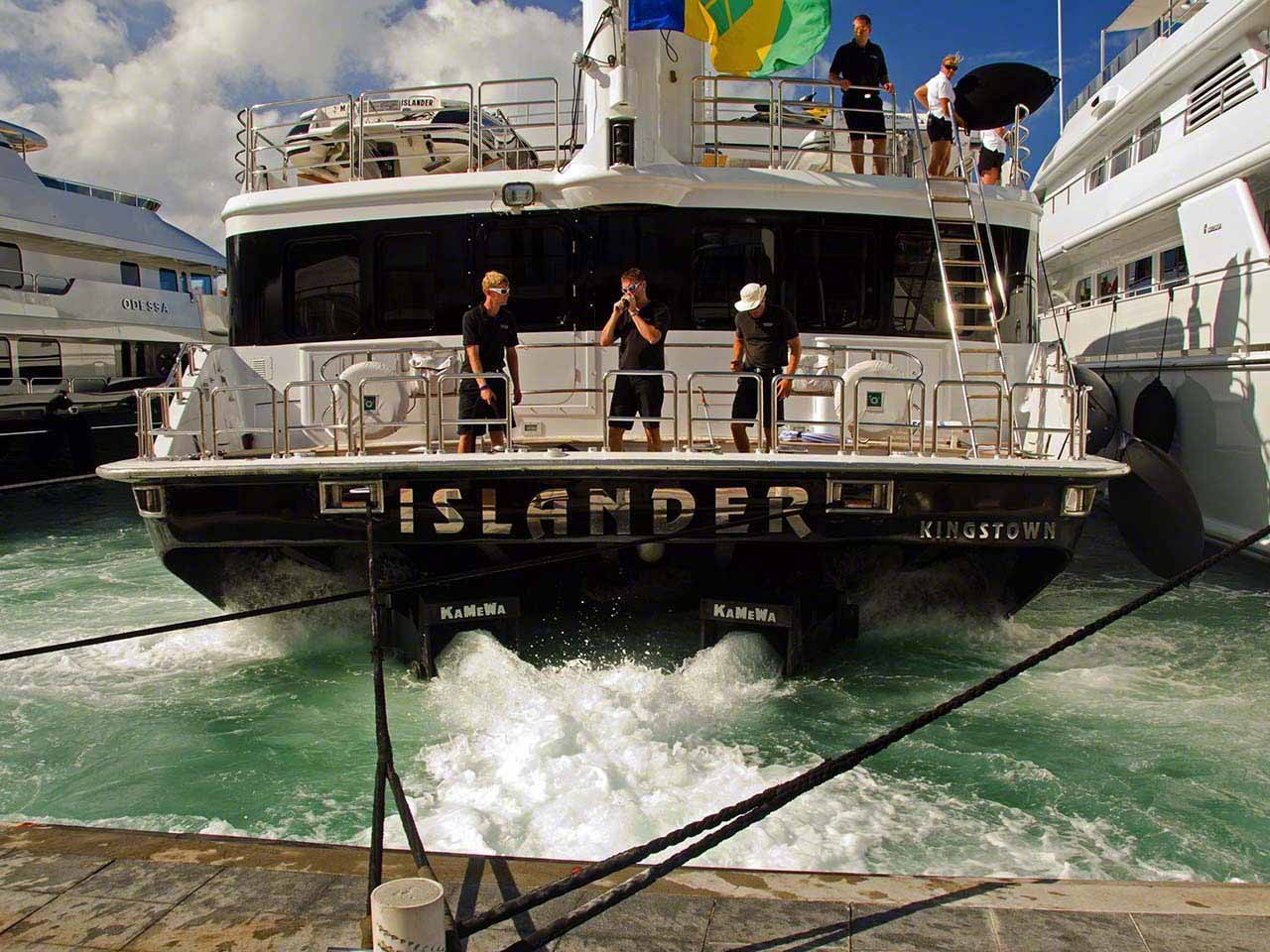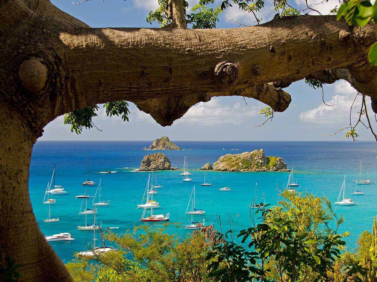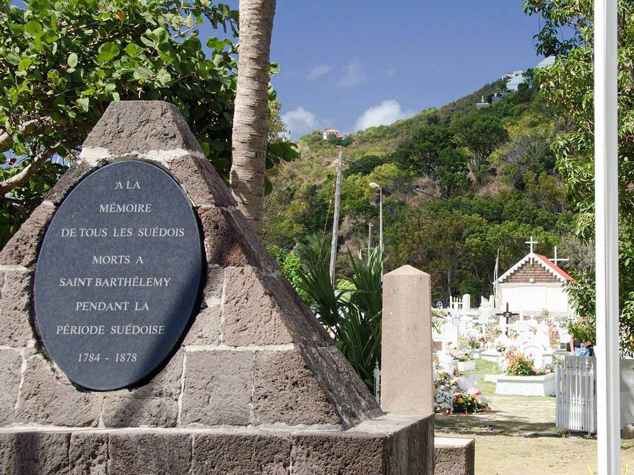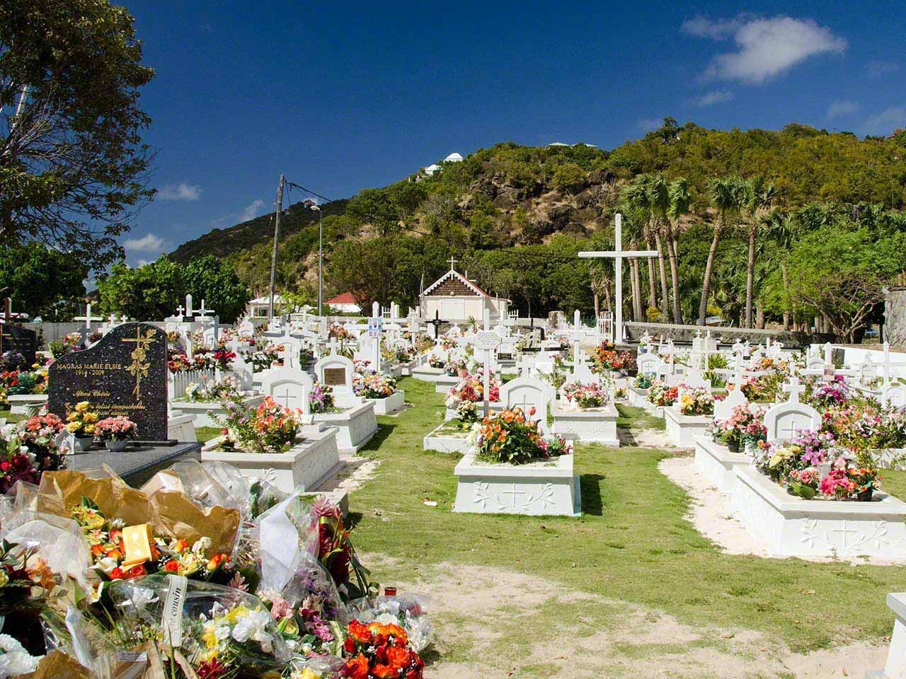 I had planned on walking around Gustavia and revisiting the airport for some pictures that day and our two boats motored to Gustavia and anchored in the outer harbor in the morning hours. I cleared out and Arita cleared in & out and we had a small breakfast with coffee and croissants and Rob paid the bill before I did and I think he only narrowly escaped having a coronary; the prices in St. Barths are evidently at the upper end of the scale; but we did have some excellent Fiji water and coffee. After Rob had arranged the second mortgage and indentured servitude of his next male born child with the restaurant owners, we took off on our wanderings and I set up my camera and tripod at the roundabout over the St. Barths airport in preparation for taking a video of an aircraft coming in on final and landing. After our return to Gustavia via the old cemetery with its myriad of bright and colorful (and plastic) flowers we returned to our boats and I intended on returning to Colombier immediately as the anchorage outside of Gustavia is quite uncomfortable in the swell, but the large catamaran anchored behind me turned out to be Palarran and belongs to David, a fellow sailing forum member on the internet. After getting a grand tour of the huge catamaran I returned to my boat, motored to Colombier and set about getting my outboard and dinghy aboard. By the time that was done the sun was setting and I had a tasty dinner with the rest of my baguette and managed to finish my book in wee hours of the night. I remember thinking to myself that my batteries would be charged by the morning as I could hear my wind generator buzzing away all the time, but when I looked outside I realized that there wasn’t a great amount of wind but that the boat anchored about 100 feet downwind of me had an Air-X Marine wind generator on board, which was doing a fine job of keeping up their reputation as the loudest wind generator on the market.