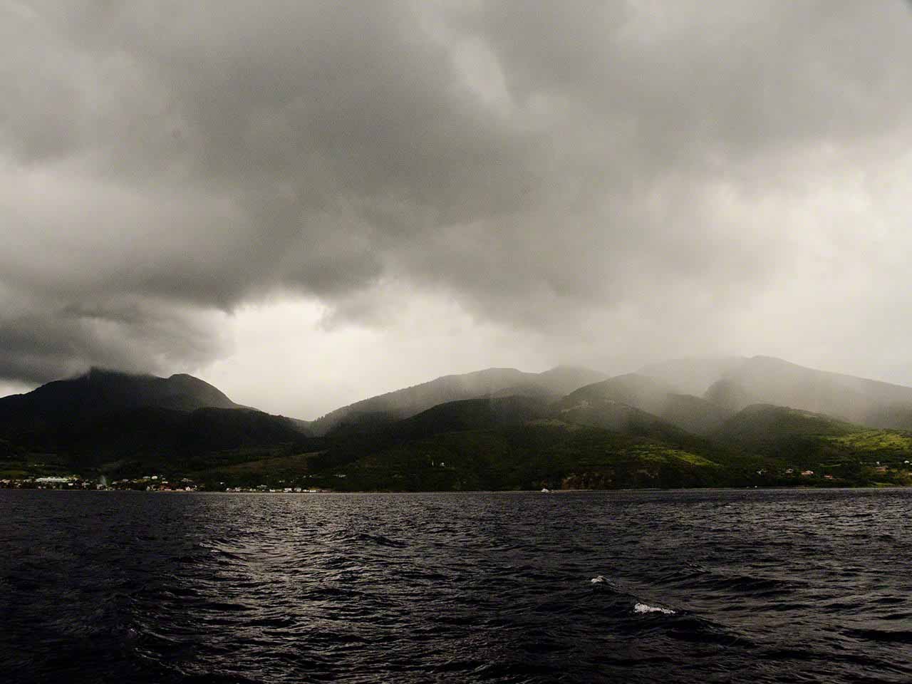 Although the immigration official had told us she’d be in the office at 07:30 it wasn’t until about 08:15 that she showed up and since we’d already cleared out she just took another copy of our papers and whacked an exit stamp into my passport (remember the librarian’s stamp in one of the Indiana Jones movies?) and we were out within minutes. Getting Arita‘s kedge anchor up was easy but I had to don my snorkeling gear in order to help Rob get my second anchor up, it had dug itself very deeply into the sand and was very difficult to dislodge. Nonetheless we got it out and it is just before 9am right now and we are ready to depart. Our plan was to sail straight through to Basseterre or perhaps Île des Saintes with an alternate of Deshais, but we discussed another option this morning to sail to Nevis (a short and easy sail) then get up in the wee morning hours and sail from Nevis to the Île des Saintes, breaking a 24-hour trip into two segments of 31NM and 92NM. We might change plans while underway. We did change plans, the seas were significant and the winds higher than predicted, so it was decided to head into White House bay on St. Kitts and ride out the weather there. The anchorage is very protected and has excellent snorkeling and hopefully I can cadge a ride tomorrow and get a rental car.