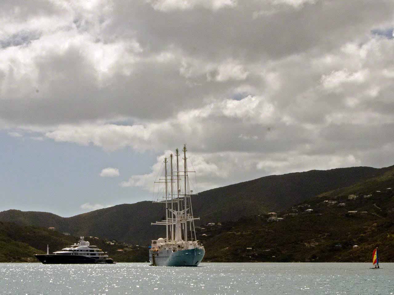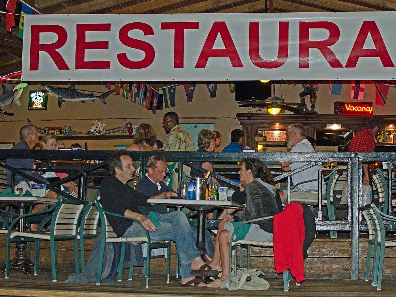 Despite having had a bit too little to eat and too much to drink the night before, I didn’t wake up with a throbbing head but a throbbing food. I had gotten a splinter in it when going ashore to clean/check the storm sails the day before and the splinter had snapped off when I tried to remove it, but I couldn’t locate the rest of it yesterday and hoped it would just grow out in peace. But this morning I couldn’t walk on that foot, as the splinter is right in the pad where all my weight is placed on it. I couldn’t find the splinter, but used a MacGyver method of turning my binoculars into a microscope to locate the entry point and then used a fine needle (from the whipping kit) and some tweezers to complete the operation. I’m limping a bit now, but the source of the pain is gone and it should clear up quickly. I had to remove everything from the big fridge earlier today, as I think that the steaks that I had purchased had leaked blood into the bowels of the fridge and it smelled decidedly nasty this morning. After draining the stinky fluid from the fridge I used some Joy detergent and Pine Sol to clean up the fridge and rinse all the bottles and replace them. Then I realized that the fridge drain goes into the sump of the bilge, so I had to and clean out the bilge area as well. Ahh, the trials and tribulations of being on a boat. Yesterday I help a fellow cruiser whose 4-stroke had cut out on him in the middle of the channel by towing him to his catamaran. Just now I heard a dinghy zoom by and then suddenly go quiet and when I went topsides to check it turned out that it was the same French gent with a passenger and his motor had died just 100 yards downwind of my boat, so I hopped into my trusty dinghy and gave him another tow. He’d stated that he’d cleaned up the carburetor but that perhaps he had bad fuel which caused his renewed problems. 17:30 – My foot is still throbbing, so I must have missed some of that dock splinter and hope that it will grow out or otherwise stop hurting soon, it makes it difficult to walk around on the boat when it is rolling around a bit in the wakes of passing boats and the bit of swell that is working its way through the protecting reefs. I did get some cleaning work done and set aside my personal belongings just in case Zanshin I does sell now or while I’m away, but today I really wasn’t feeling too energetic and managed to spend a lot of time doing stuff but getting nothing done or completed. My lethargy continued on to dinner and I opted to go ashore to Saba Rock for a meal instead of cooking aboard.