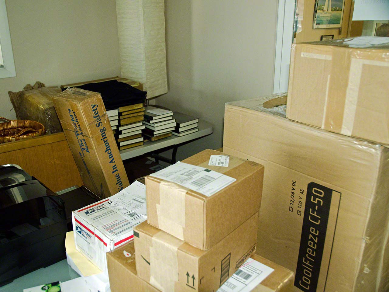 I had though that Chris was joking when he said that the items I’d ordered had filled up a whole room in their offices but when I saw the packages stacked high I realized that he was being (semi) serious. A lot of the “stuff” was in fact not mine, but belonged to Carmen and Bernd, my friends and crew who own Mau in the Caribbean and had used the opportunity to do a lot of online purchasing.