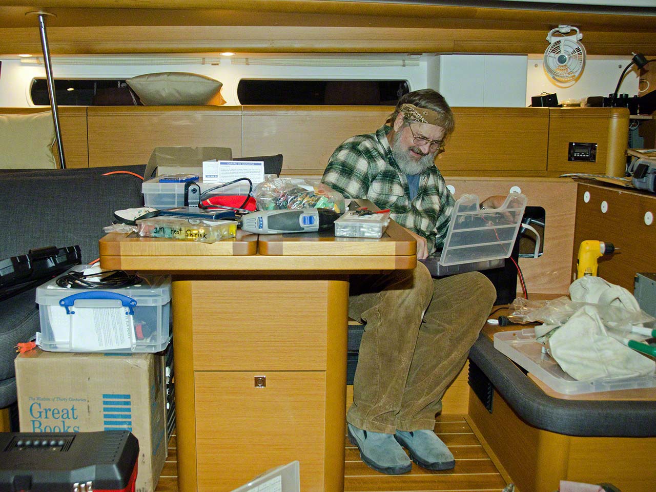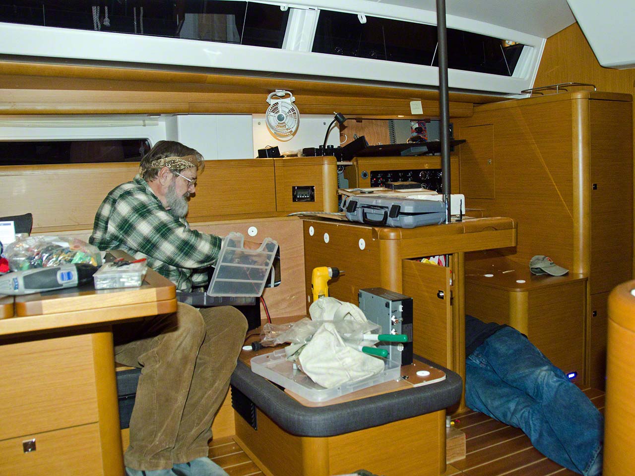 The work on the SSB went along well, despite Bill arriving later than planned due to traffic problems involved with a local marathon race and insufficient detour markings to show drivers which route to take to get past the runners without driving over them. Luckily Zanshin is big enough to make acces to many things aboard much simpler than usual, although it still helps to be a small, long-armed contortionist with no problems with claustrophobia.