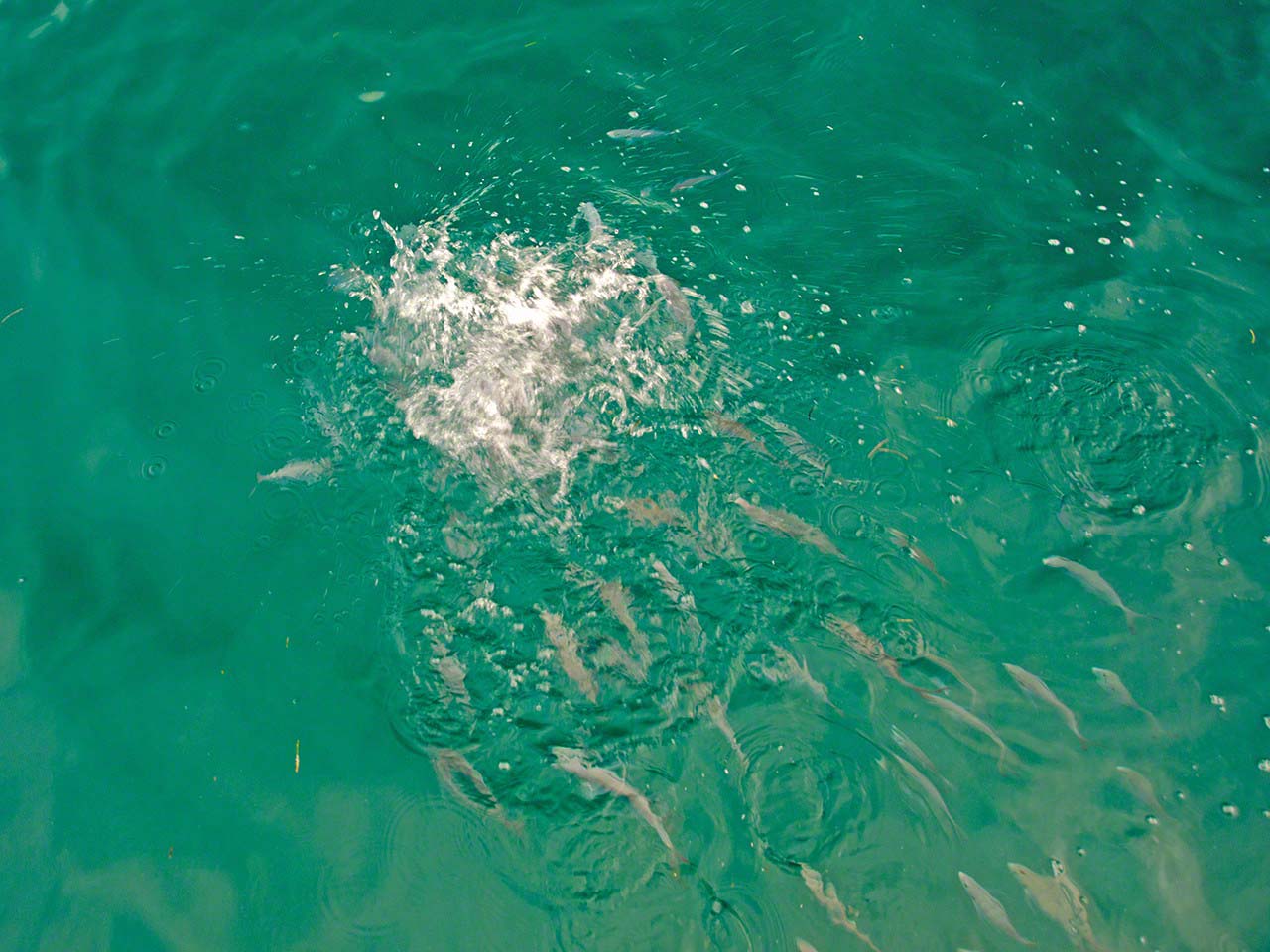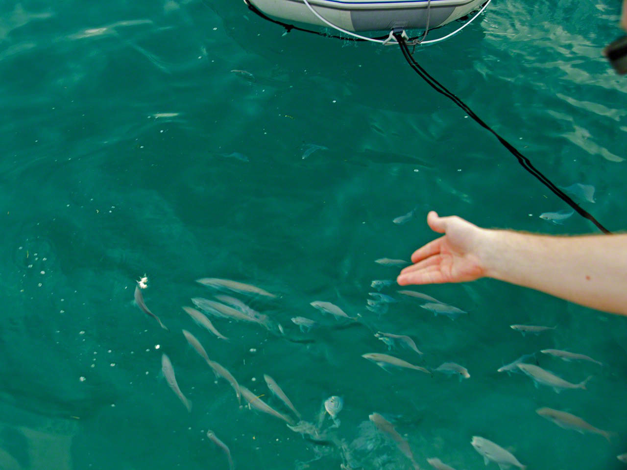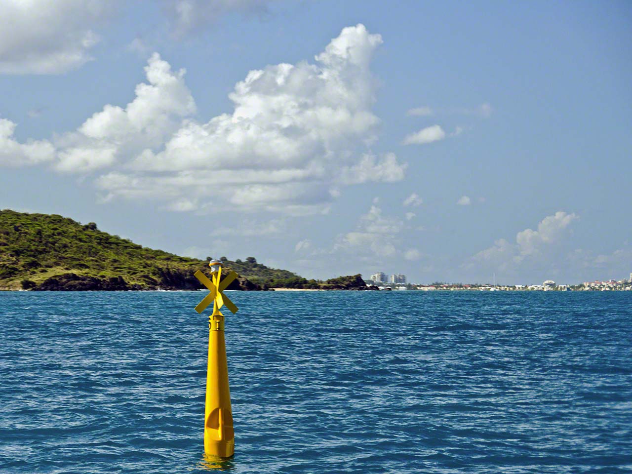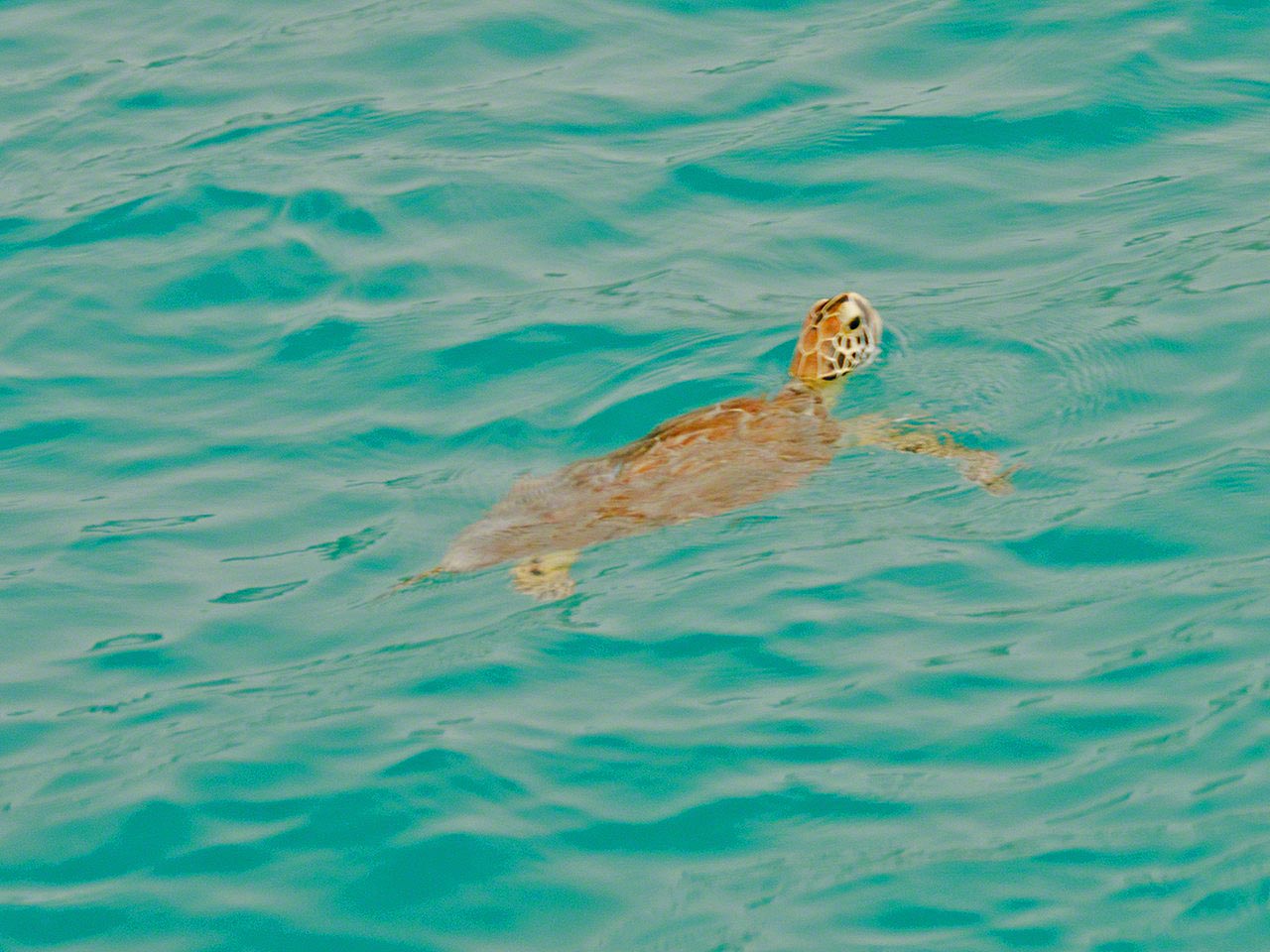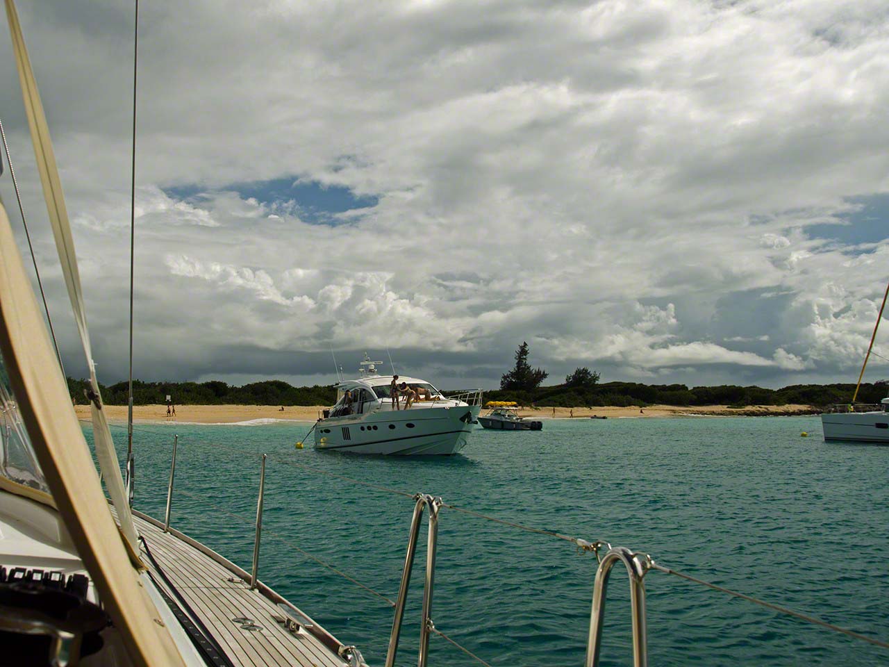 After Wolfgang made breakfast, we departed for a sail to the Île Tintamarre to the northeast and as it was a light wind day we had full sails out and had to work rather hard to tack upwind to get there, going almost to Anguilla on the northerly tack and misjudging the angle so that we had to put in an extra set of tacks before arriving at our destination. I was lucky in that I managed to set up the boat and pick up a mooring ball solo on my first attempt on this new boat, but I think that luck was involved. Tintamarre was busy, but there were still moorings and space available and we had a tasty lunch and took snapshot after swimming around for a bit. The weather didn’t look just right for sailing onwards to Île Fourchue so we returned to Grand Case for the night – the winds were fickle this day and we ended up motoring the last mile due to insufficient breeze from behind.