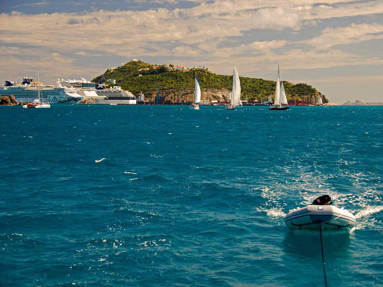 Today was spent sailing – the long leg from St. Barths around the southern tip of St. Martin into the bay at Philipsburg then from there around the coast to the Dutch bridge for a quick drop of the hook and lunch and from there to Grand Case. The last part sounds simple, but in actuality we sailed way past the top of St. Martin to the coastline of Anguilla and then back due to the wind direction.