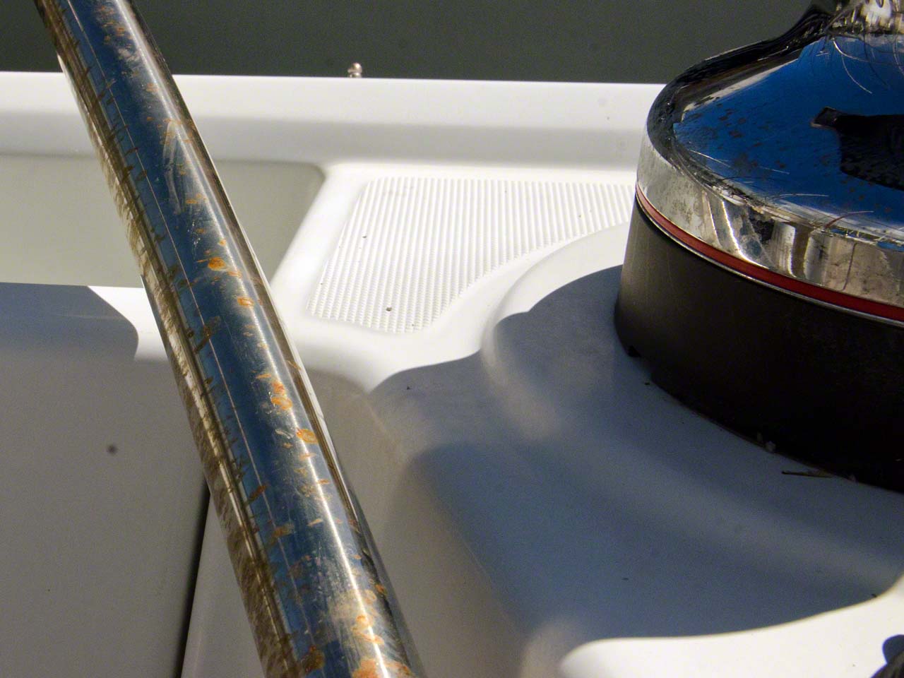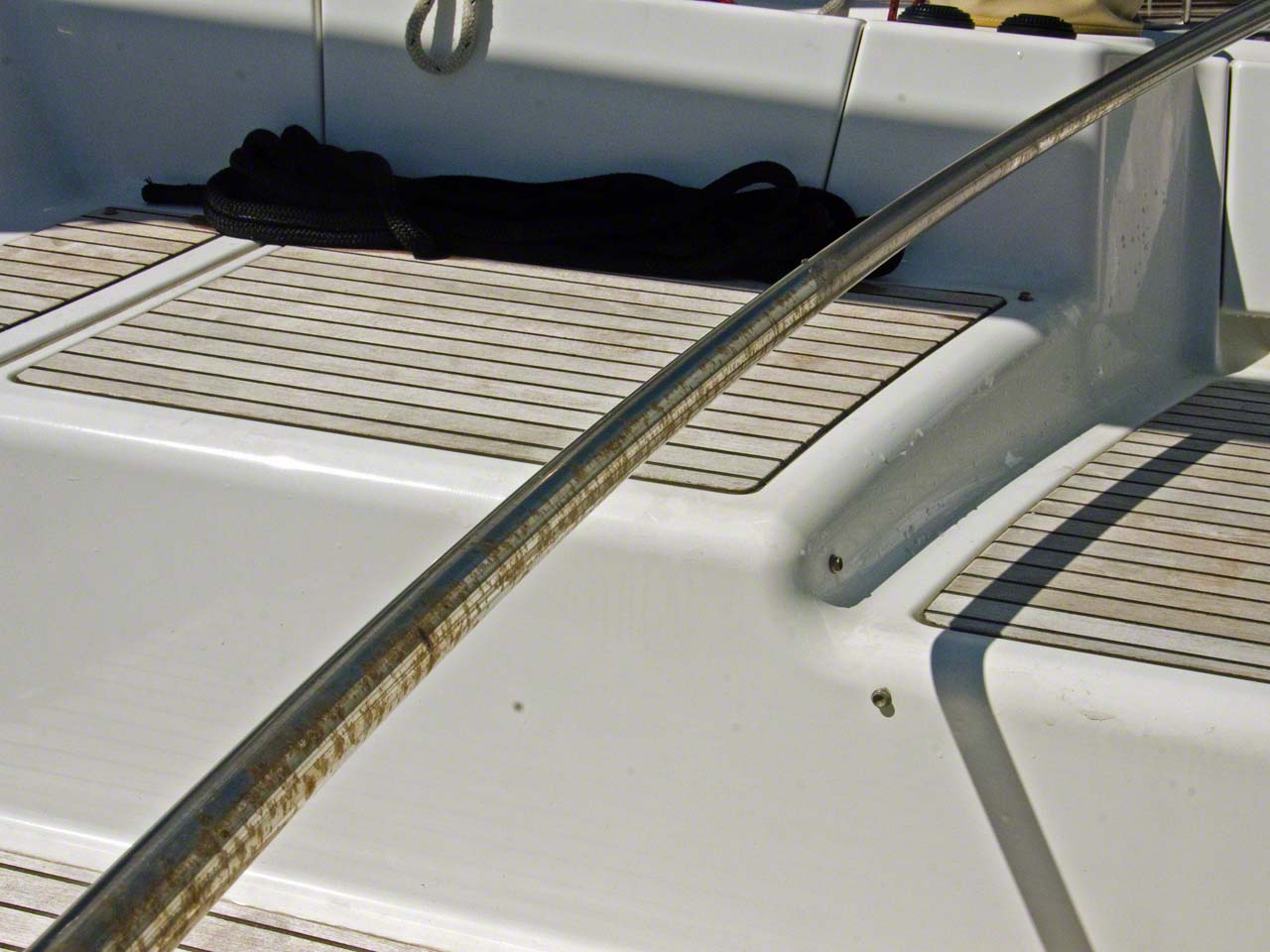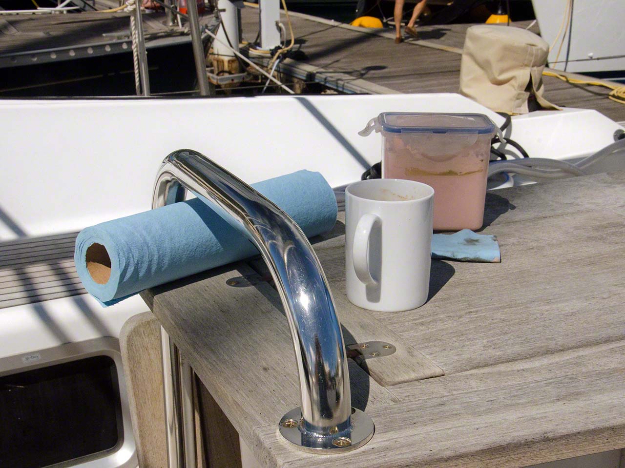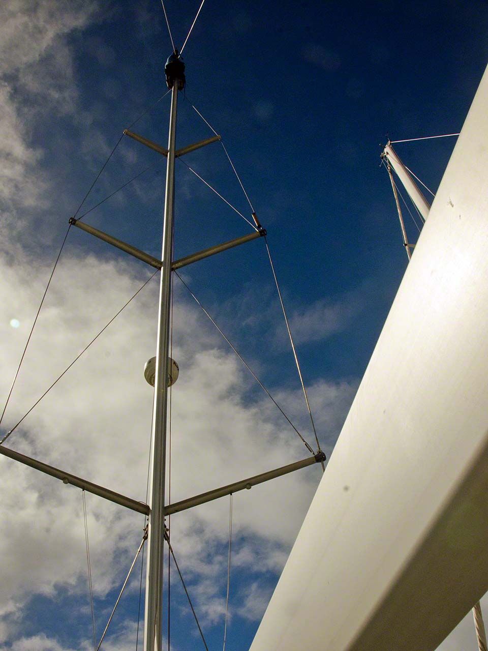 Sleeping in the comfort of a hotel room was nice, and the room offers an escape from the heat and sun while I’m starting to get the boat ready. On the old Zanshin I could manhandle the genoa and, if the winds were light, I could pull up the sail alone as well. On the new boat the genoa is too heavy to carry up from the cabin to the deck, so when the crew from Richardson’s Rigging came by I asked them to correctly retension my backstays (which I’d had to remove for the Travelift), then to help me get my genoa onto the furler and finally I decided to have a professional go up my rig to check everything. After they’d done that I started to see if I could get my shore-power cable attached so that I could work belowdecks during the day in air-conditioned comfort.
