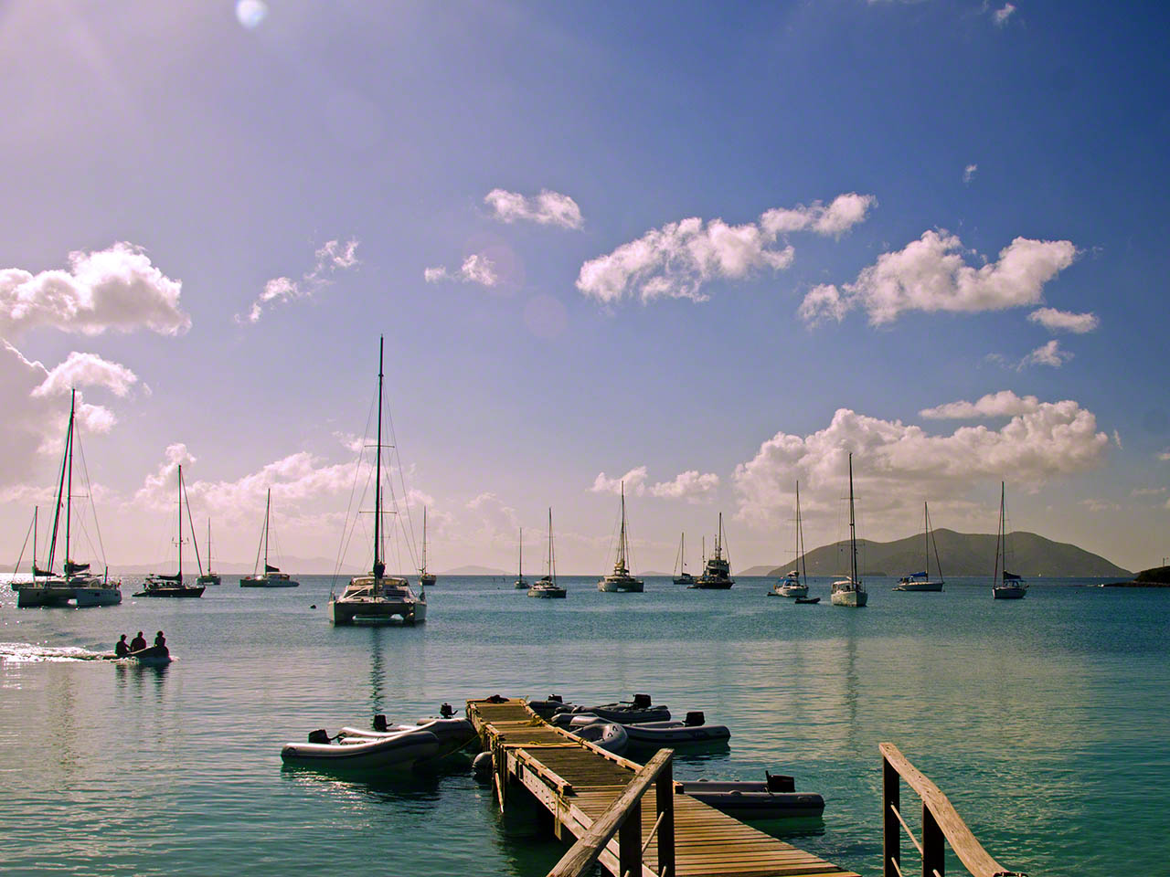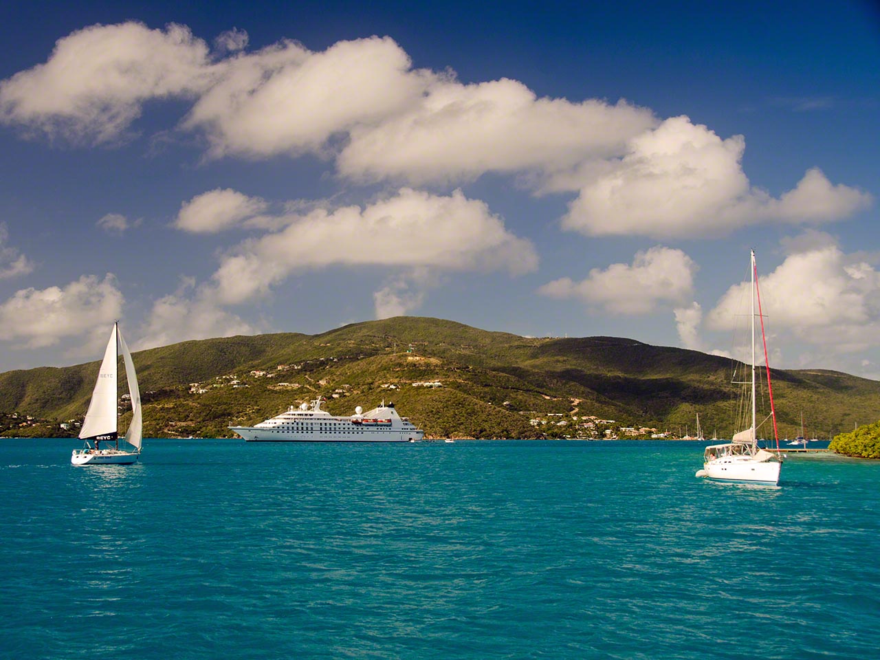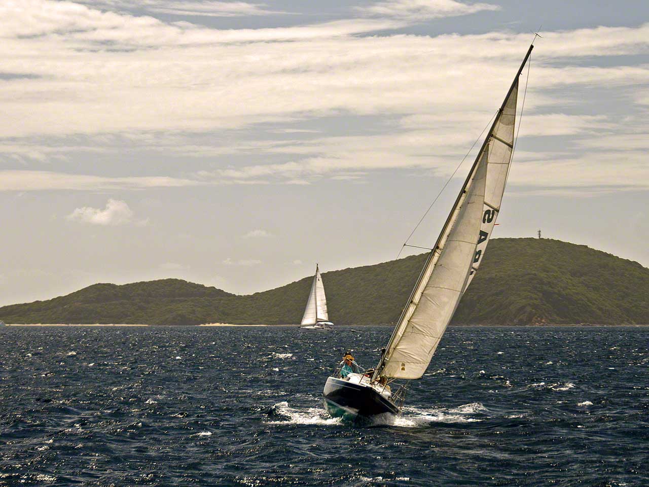 I opted to leave the comfort of the North Sound and sail to Jost van Dyke for the evening and thought I would take a lunch break at Monkey Point so I headed on a comfortable downwind stretch between the Dog Islands towards Trellis Bay and from there between the islands to the Point; but then I changed my mind and took the outside route and opted to tuck into Cane Garden Bay as there was no northerly component to the swell which can make for an uncomfortable anchorage much of the time. The sailing was perfect with speeds between 4 and 8 knots and a respectable average despite the downwind run (Some big mega yacht running a full spinnaker was doing 11 knots according to AIS, but I wasn’t going to try to match with 110 foot LWL). I arrived at Cane Garden Bay in the early afternoon and traversed the entrance channel which had only one little green buoy rather than the 4 listed on the chart, but with slow speed, good light and the depth sounder it was a piece of cake, as was taking a mooring ball in the calm anchorage water. This act was a feat of concentration on my part, as the big 60 foot catamaran just ahead of the mooring ball had several nubile ladies prancing about and I found that the one wearing only a little thong was somewhat overdressed, but I’m not an aesthete.