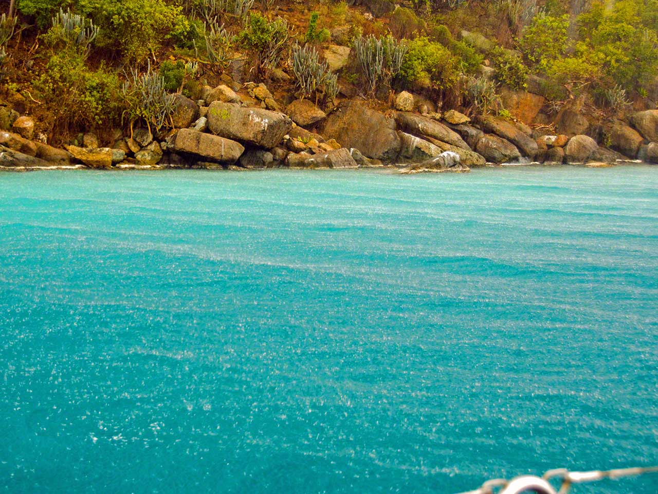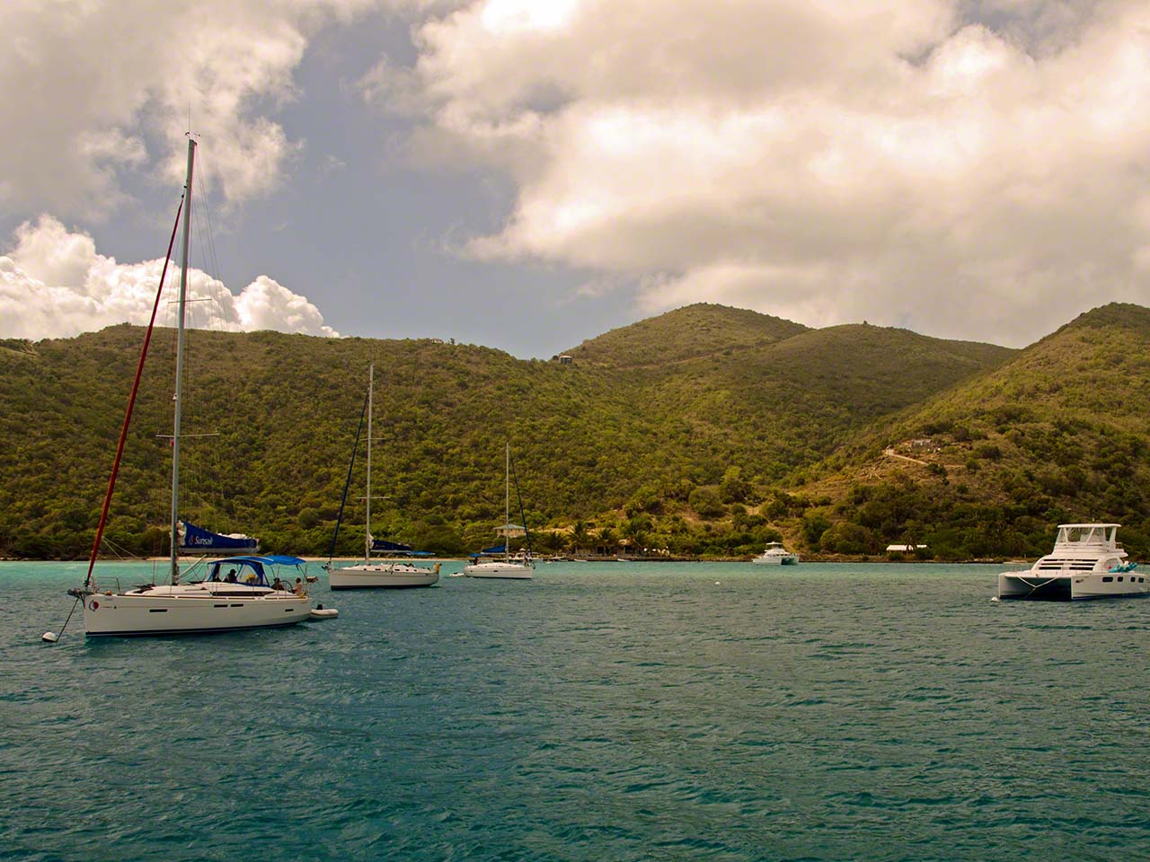 The big storm that hit the U.S. northeast coast finally made itself felt here in the BVI, bringing in a swell from the NE that arrived in Cane Garden Bay about 3 in morning, making Zanshin roll around significantly every couple of minutes when the boat swung on the mooring and put itself broadside to the incoming waves. When I got up in the morning the surf was already breaking outside the bay so I knew it was time to head elsewhere. I set sail for Sandy Spit but when I got there the swell had picked up even more and despite the protection from the reef the few boats there were already rocking around, so I opted to tuck myself in at Diamond Cay / Long Bay off Jost van Dyke for a couple of hours before heading to Great Harbour for the evening. In the mid to late afternoon some heavy winds and squalls came through the anchorage so I kept on putting off my departure until it was late enough in the day to make me revise my plans and I decided to remain for the night. Foxy’s Taboo ashore looked closed and there were only 4 boats in the Bay so I assumed that they weren’t going to open for business and I thawed out some hamburgers and corn-on-the-cob, threw out the remaining salad, and chose to use the galley below rather than fight the BBQ in the high winds outside.