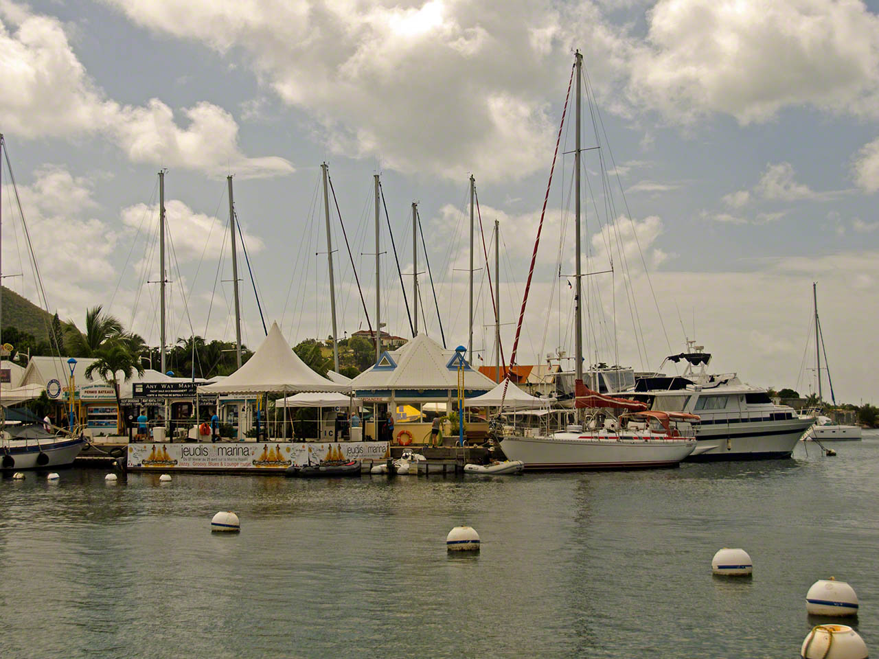 The north swell has finally arrived in Grand Case with a vengeance. The long swell period and high surf is great for those on the beach this morning, but getting ashore in a dinghy is no longer an easy matter. I had a kedge dinghy anchor on some rode made up, but the 4 bladed anchor wouldn’t hold at all and I was lucky enough to have a couple in a dinghy with a kedge anchor that held allow me to tie off the back of theirs; I said I’d be at least 2 hours and they said that was how long they would be staying as well so all was well. I walked off to Octopus Diving and used their phone to arrange a 3 day car rental and once I’d taken care of rental formalities for the ubiquitous Hyundai Getz I risked life and limb in traffic and headed to Marigot in order to perform the clearance. I was fortunate to grab a parking space from someone leaving and the clearance only took 10 minutes and I was suddenly legal. I decided to use my time to dash across to Island Waterworld in order to get a real kedge anchor for the dinghy and purchased a small 2Kg one (stainless steel, but only because they had no others) and returned to the dinghy dock in order to exchange anchors. The new anchor bit immediately and was going to do a good job keeping my dinghy off the concrete dock and I met and spoke with a couple who had just arrived at the dock. I mentioned that I was heading to Island Waterworld and within 10 minutes I was in the car and taking Duncan along.