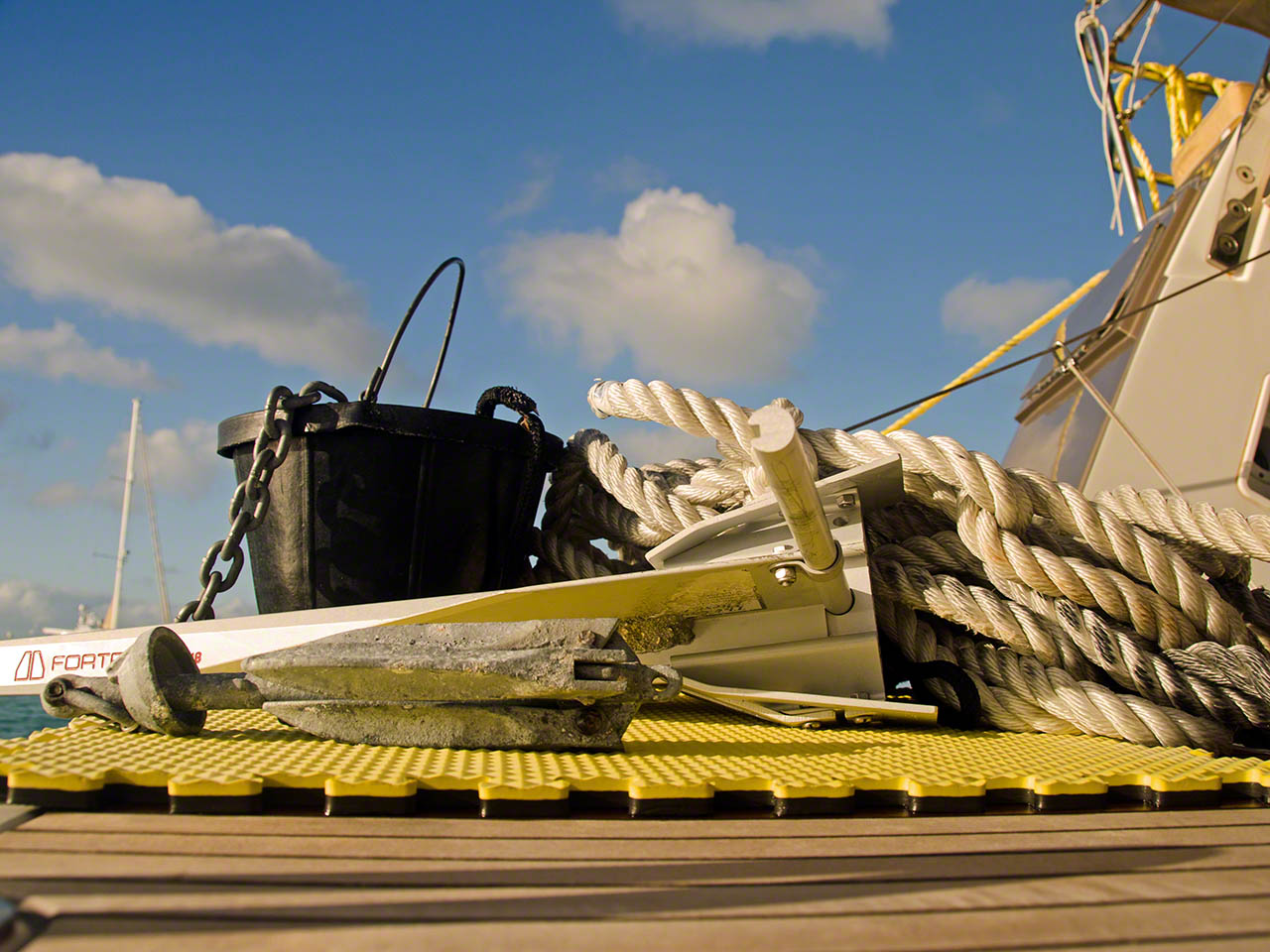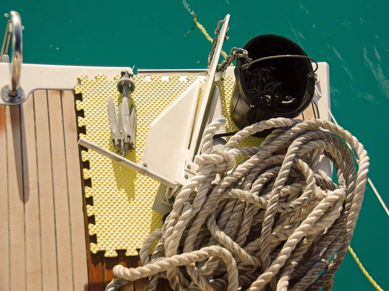 After completing phase I of the LED project, I decided to get the kedge anchor back aboard. I got in the dinghy, untied the kedge line from the aft cleat and then hand-over-handed the line into the dinghy until I got to the chain and then things got complicated. I tried to use the buoyancy of the dinghy and the big swell to get the anchor off the bottom but despite what must have been 200-300 pounds of lift through the dinghy the line wouldn’t budge the anchor! By now Zanshin had aligned differently to the wind so I couldn’t re tie the line – about 20 feet were missing. I couldn’t tie the line to the dinghy and swim to the boat, as I’d not lowered the swim ladder and wouldn’t be able to climb aboard. After contemplating the next step for a bit I opted to untie my dinghy anchor from the line and add that to the kedge line, this gave me barely enough length to tie the line to the cleat. I then climbed back aboard and got snorkel and fins and swam to the anchor, which wasn’t too successful as the visibility was bad and once I got to the chain part I couldn’t locate the anchor. So, back aboard I got the dive gear ready and dove in – the anchor was buried to it’s shank in a little underground hill of sand and sea growth and I couldn’t budge it, since there was still pressure on the line. So I swam back to the boat, untied the dinghy, tied the line to the kedge anchor line and waited to see if I could untie my knot in the few seconds slack line but gave up, tied my diving gear to the dinghy, swam back to the boat and clambered up to release the taut line from the cleat and then swam back, got back in the diving gear and worked very hard in trying to free the deeply buried Fortress anchor. It took about 10 minutes and a lot of leverage, moving back and forth and more leverage to free the anchor from the bottom.