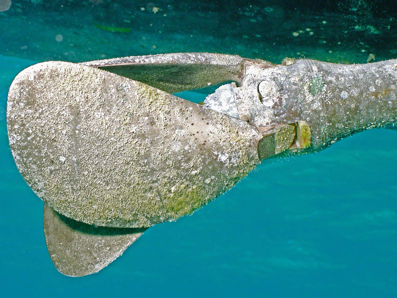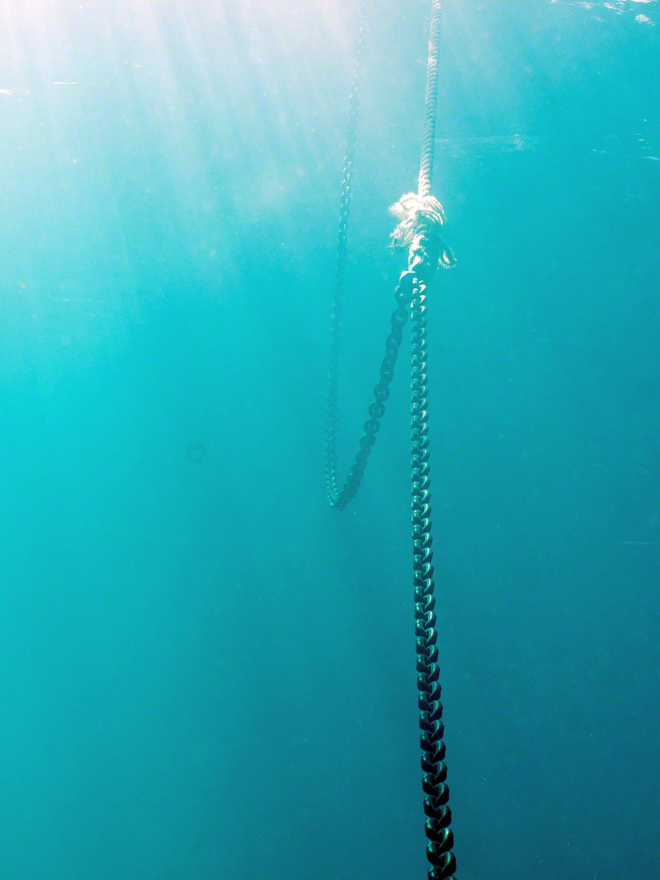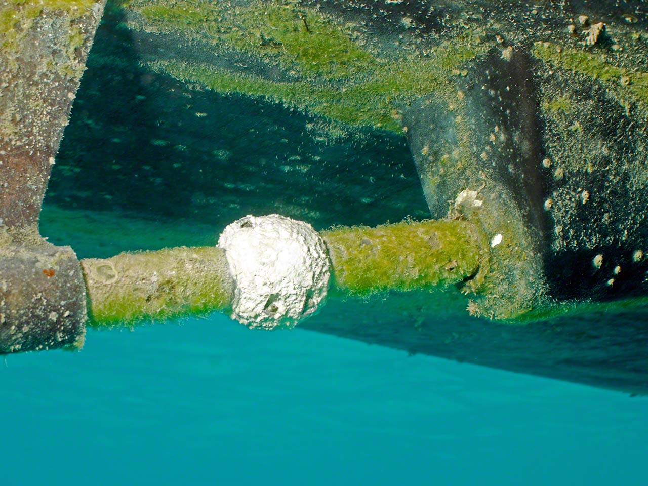 Up I still had over 2000 PSI left in the tank, so after a brief pause aboard, I went to dive on Zanshin and scrape the bottom with the king-size scraper I’d acquired in a French hardware store. I took the camera along to get some shots of how ineffective the U.S. installed bottom paint is in the warm and fecund Caribbean waters and also took some photos of the anchor chain and buried anchor.