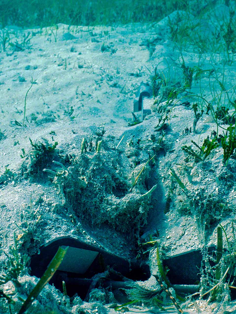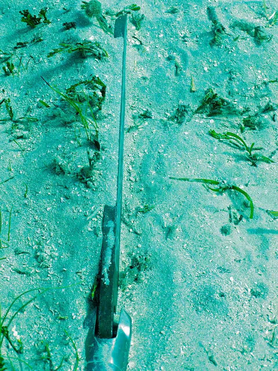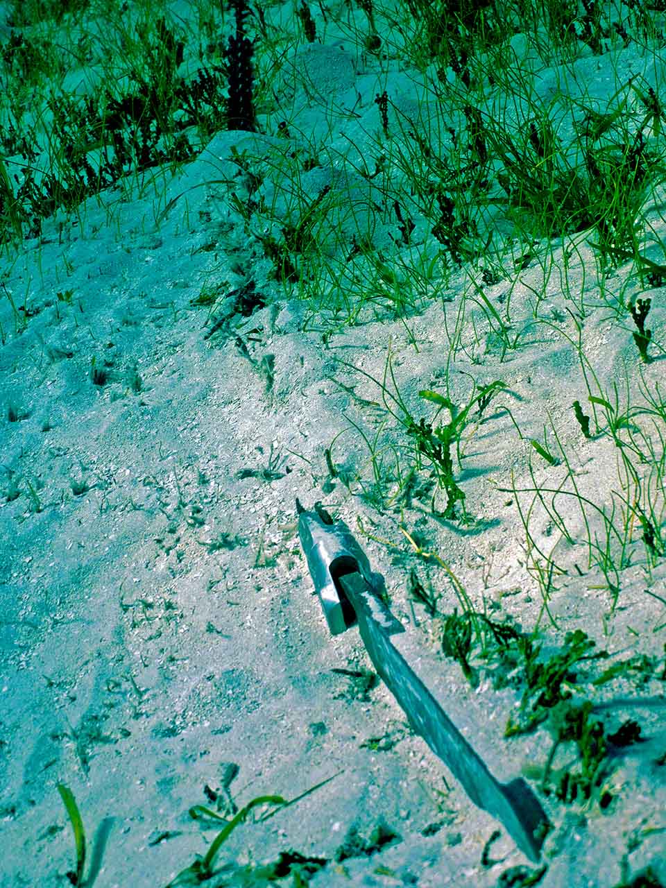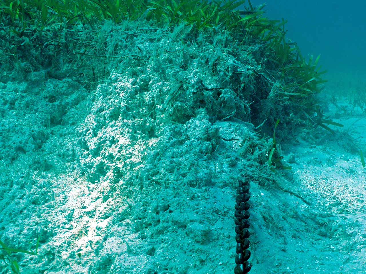 Up I still had over 2000 PSI left in the tank, so after a brief pause aboard, I went to dive on Zanshin and scrape the bottom with the king-size scraper I’d acquired in a French hardware store. I took the camera along to get some shots of how ineffective the U.S. installed bottom paint is in the warm and fecund Caribbean waters and also took some photos of the anchor chain and buried anchor.