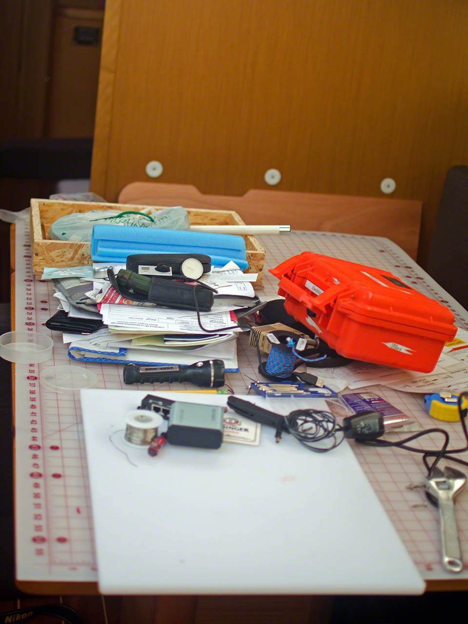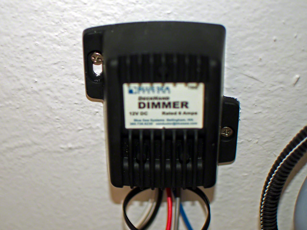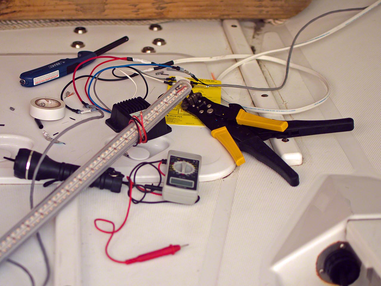 Back aboard I used some small-diameter cable to complete the project, at least until I could get some proper-sized cabling elsewhere. When I tested the connections and settings in the dinghy garage everything worked, but once I completed the project it no longer did, and it took a bit of testing to discover that a crimped connection on the small wire had torn the delicate strands and broken the connection, although it looked perfectly in order; the broken spot was hidden beneath the heat-shrink tubing I’d used. I got that sorted out and worked on the LED strips to make them a bit more weather- and corrosion-resistant and by the time all of that had been done it was in the late afternoon already.