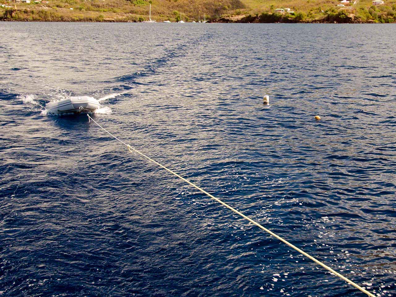 I’d not thought about big seas when I set off, so I just lay the outboard engine onto the floor of the dinghy. But in these big seas and with Zanshin sailing at speed between 7 and 9 knots, depending upon whether crashing through a wave had just decreased the speed or if the boat was sailing unhindered, and my dinghy was getting some very serious air-time, sometimes I could even see the outboard bouncing around inside the dinghy. I had almost 100 feet of line to the dinghy and I spent much of the crossing just watching and waiting for the engine to slip below the surface after a particularly spectacular launch off the front of a wave. There was little else to do, since it was too late take any action to ameliorate the danger.