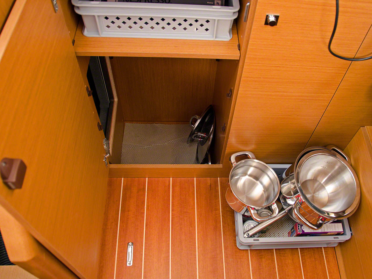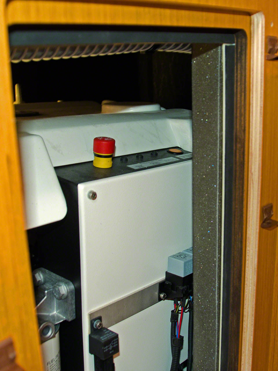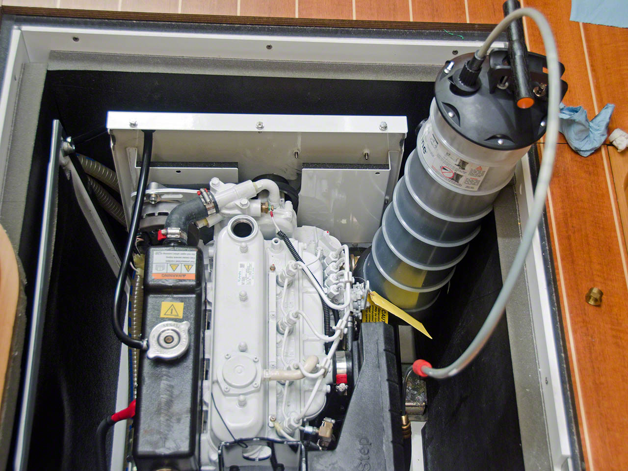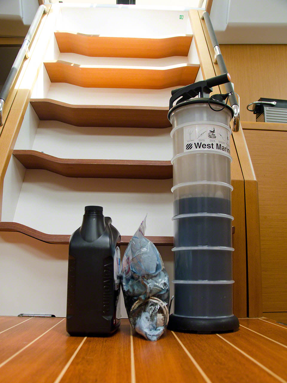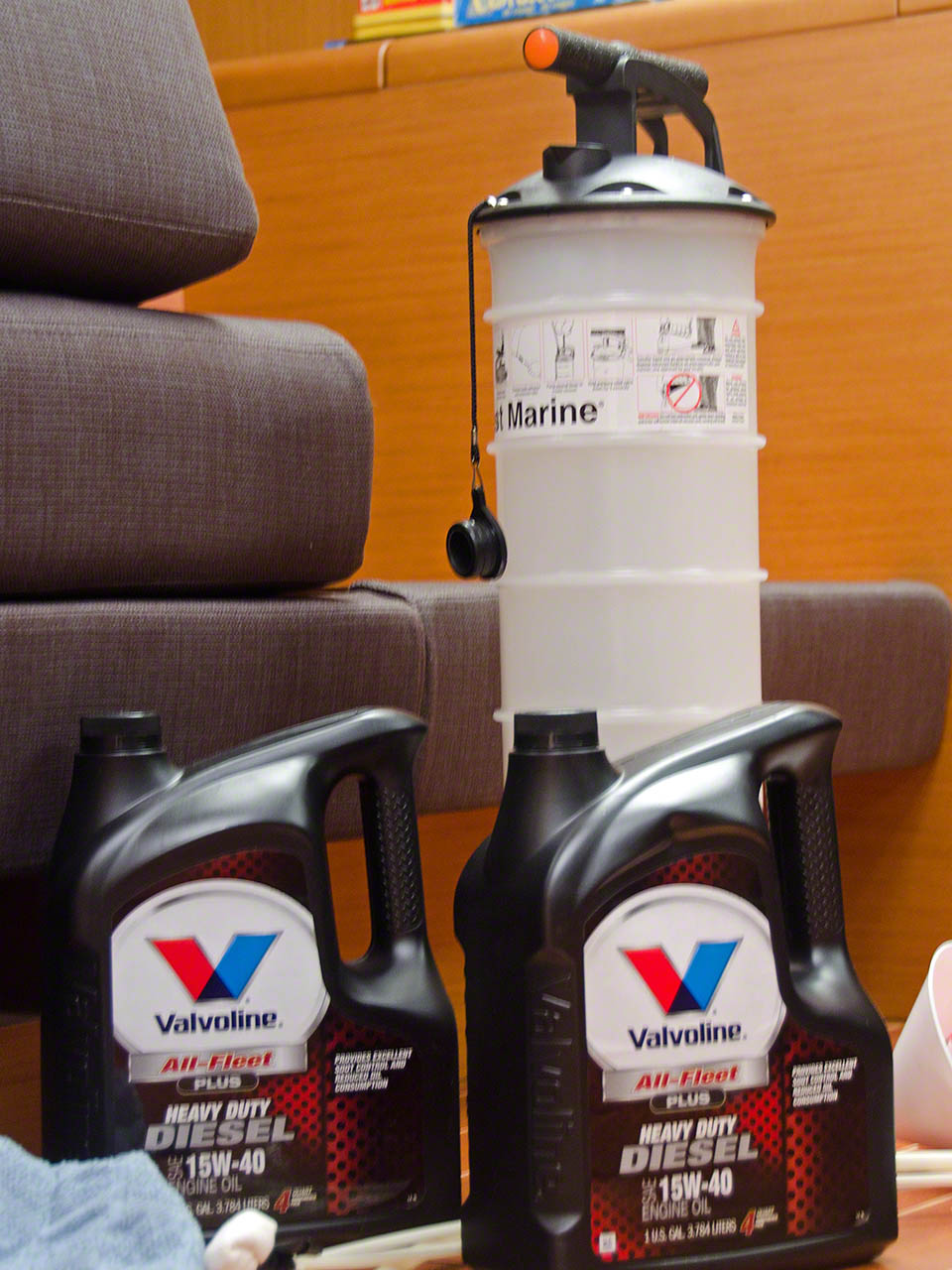 Filling the new oil into the engine and getting level just right was quickly done and I attacked the VW main engine oil change. Since the engine is still under warranty I had to use the single oil that VW approves and that is almost impossible to get here in the Caribbean, but I’d brought sufficient quantities from the USA for two oil changes and top-ups and was good to go. The engine has an oil-change system with an extraction hose and an electric pump; but the switch for the pump is located on the engine electric panel which is rather inaccessible until part of the galley shelving is removed and a side-panel removed. I had to wait for Wolfgang to return from the beach to finish the removal process since the hose and switch are on opposite sides of the engine and I didn’t want to inadvertently pump oil into the engine pan or bilges.