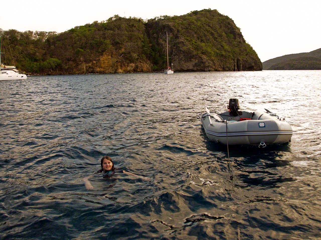 After a calm night at anchor, with just a bit of roll when the winds died in the evening, we awoke to a wonderful Caribbean day and had a big breakfast aboard while deciding what to do with the day. The winds had picked up considerably and we could see chop and whitecaps so we opted to stick with what we knew and stay put. Naturally a beach visit was on the agenda and I wanted to head up to the top of the hill to take a look at the big cross which I assumed (incorrectly) was a navigational mark. I haven’t been keeping up with my diary/blog regularly and somehow cannot recollect what else we did this day – it seemed to consist of breakfast followed by beach and my walk up the hill, tasty dinner and a couple of happy hour drinks and nothing in between. Perhaps that’s a good sign of a relaxing day if nothing else made it to long-term storage!