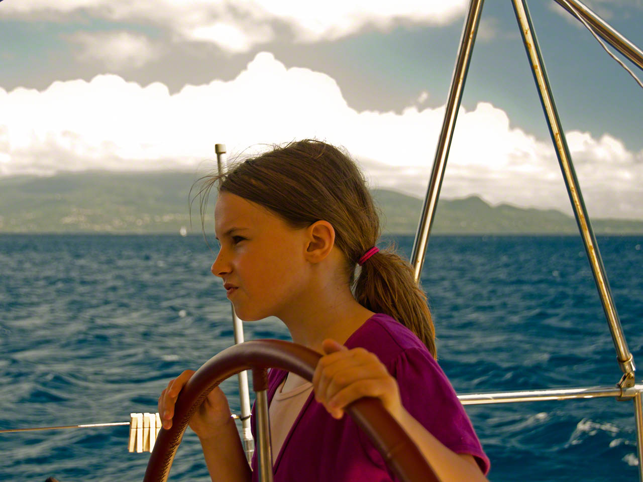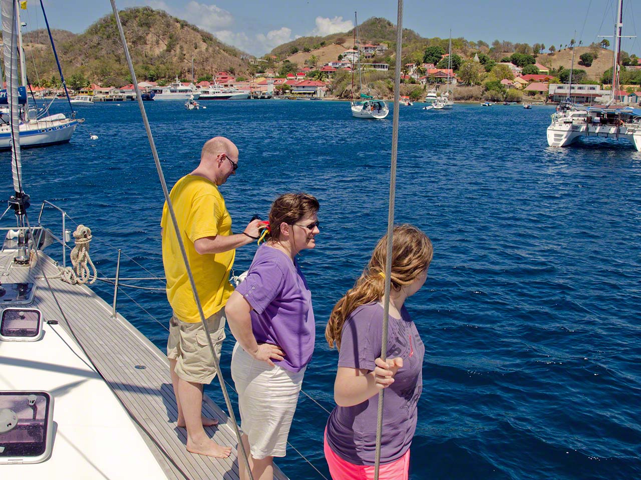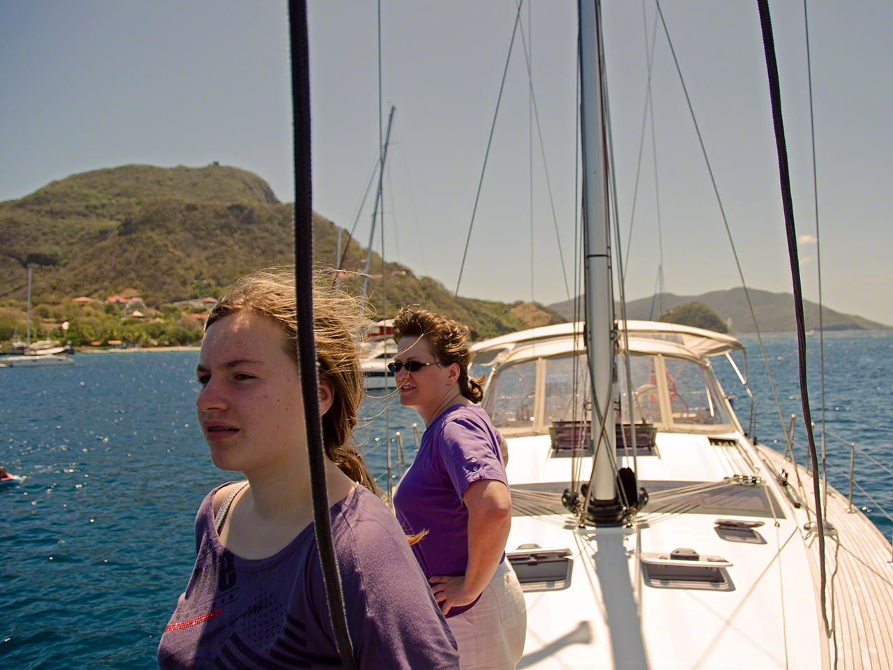 > Today was a big day with lots of activity. The wind and waves had picked up overnight and we decided that we needed to change anchorages for something better, as we hadn’t slept well in the rolly boat during the previous night. After breakfast we decided that just motoring to the next anchorage was boring so we planned on doing a circumnavigation of Terre Haut by sail. It took a while to get the boat ready for travel since we knew it was blowing quite strongly out there. We started off with a little detour to Terre-de-Basse and anchorage behind Point &ag Nègre to see if that was an option for us (it wasn’t) and then circled the island counterclockwise. Going upwind was tough indeed, we had reefs in the sails and were bashing around and hardly making headway on each tack but finally cleared the gap between Terre-de-Haut and Grand Ilet – whereupon we were hit by the full wind and waves. By this time Sophia had the helm and was squealing in glee as she warned us of yet another breaking waves about to hit our starboard side – she was the only one having a huge amount of fun. Although we had buckets prepared we didn’t need them, but it was a close call indeed. Once around the headland and no longer on a close hauled attack course the boat smoothed out and we sped up, until we had the wind from aft and started rolling around a bit.