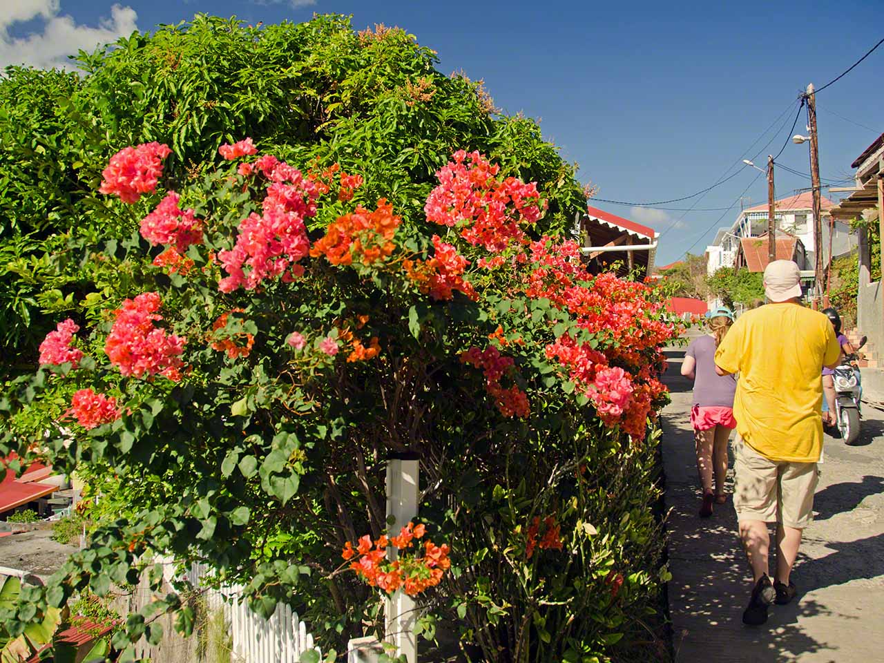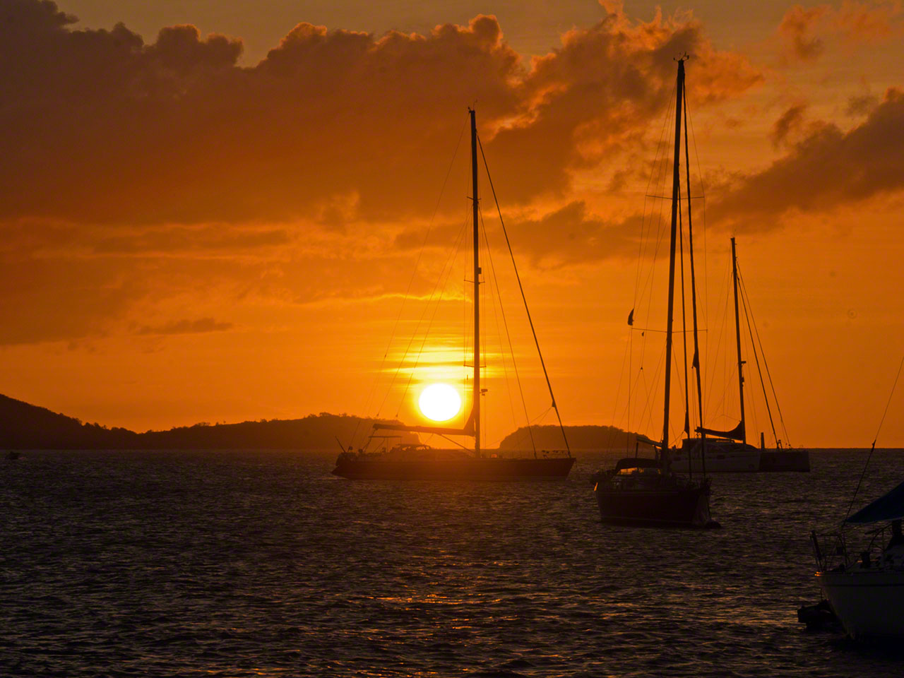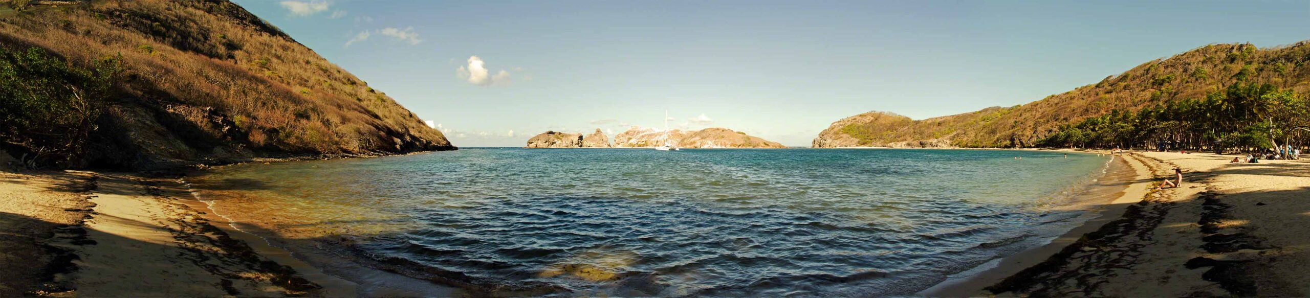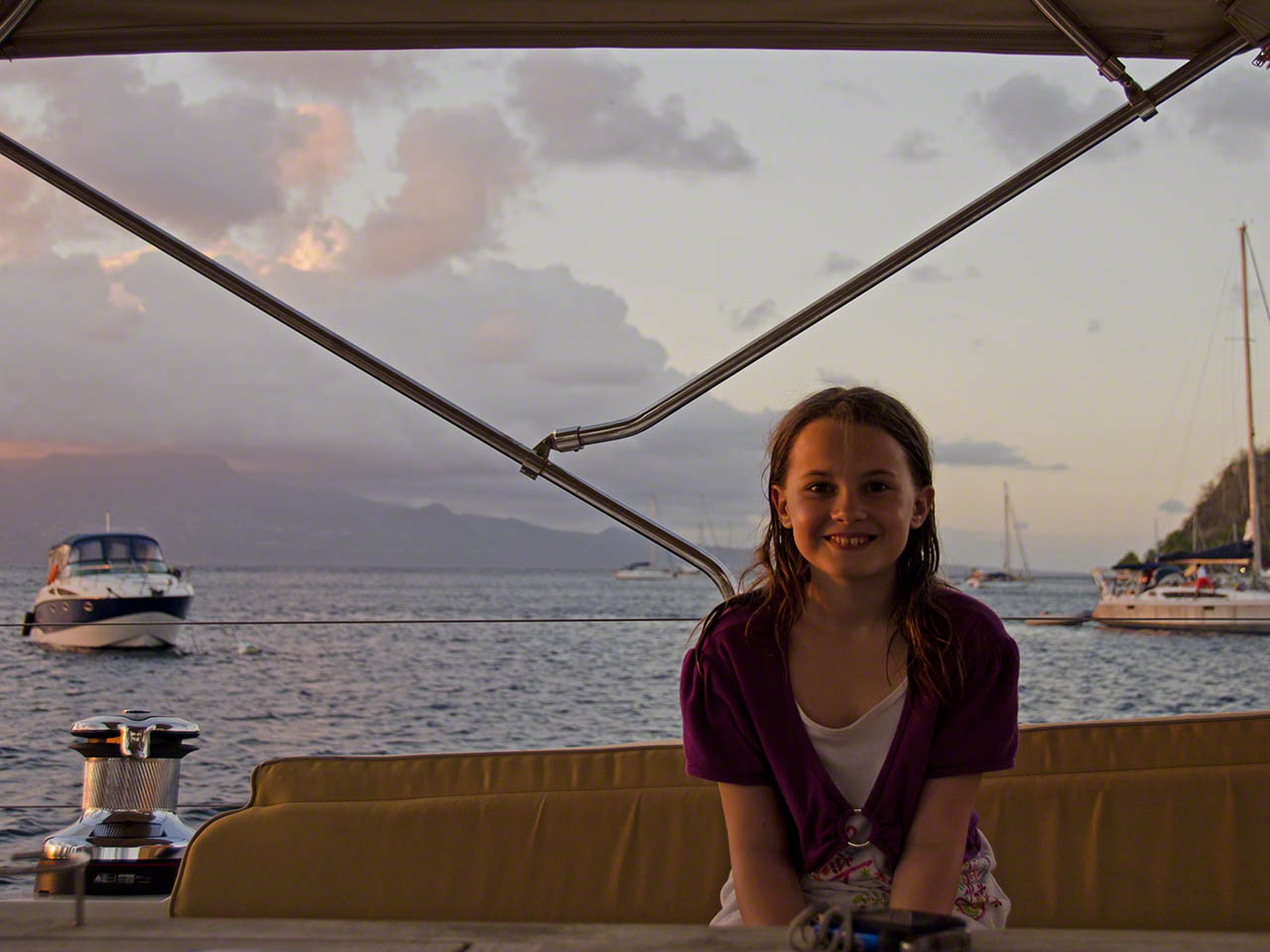 > Today was a big day with lots of activity. The wind and waves had picked up overnight and we decided that we needed to change anchorages for something better, as we hadn’t slept well in the rolly boat during the previous night. After breakfast we decided that just motoring to the next anchorage was boring so we planned on doing a circumnavigation of Terre Haut by sail. It took a while to get the boat ready for travel since we knew it was blowing quite strongly out there. We started off with a little detour to Terre-de-Basse and anchorage behind Point &ag Nègre to see if that was an option for us (it wasn’t) and then circled the island counterclockwise. Going upwind was tough indeed, we had reefs in the sails and were bashing around and hardly making headway on each tack but finally cleared the gap between Terre-de-Haut and Grand Ilet – whereupon we were hit by the full wind and waves. By this time Sophia had the helm and was squealing in glee as she warned us of yet another breaking waves about to hit our starboard side – she was the only one having a huge amount of fun. Although we had buckets prepared we didn’t need them, but it was a close call indeed. Once around the headland and no longer on a close hauled attack course the boat smoothed out and we sped up, until we had the wind from aft and started rolling around a bit.