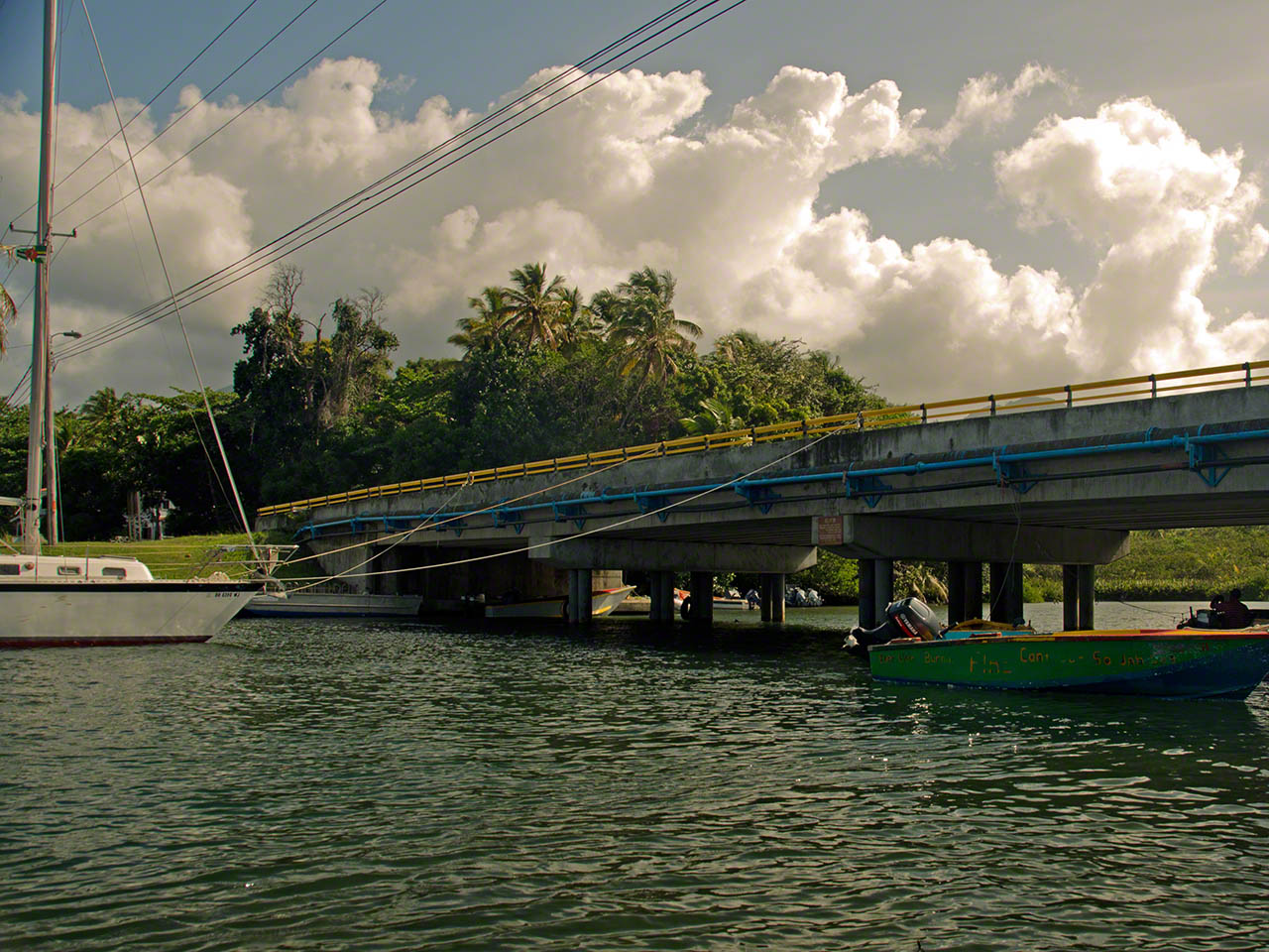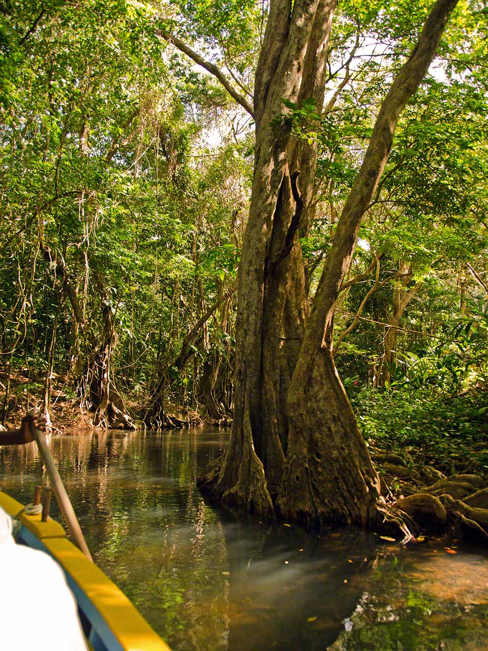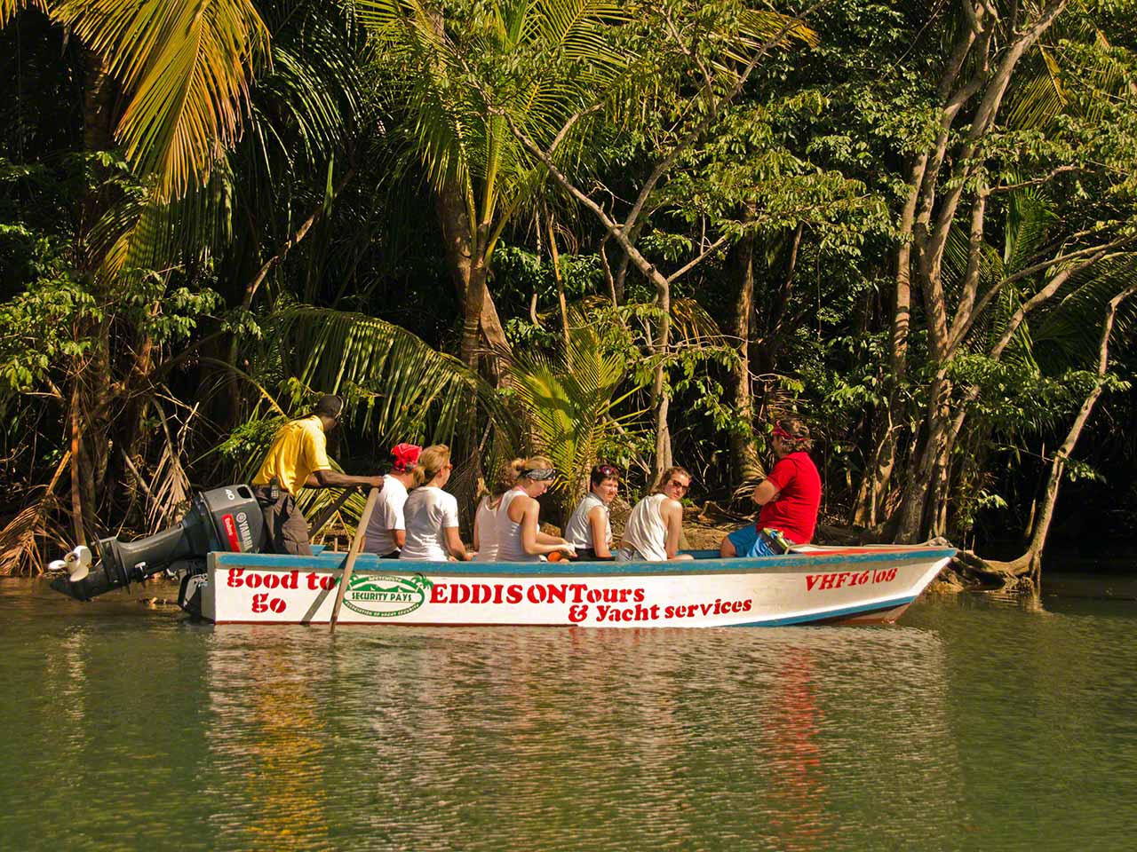Today was our tourist day and the rolling of the night before was soon forgotten during the preparations for the jungle boat trip at 08:00AM. We somehow actually managed to get everything ready (including a big plastic bag for all the different shoes needed) by just after the arranged time and our Indian River Guide and PAYS boat boy, Faustin Alexis, came just at the right time. I’d deployed two fenders off the back of the boat and the transfer to the big wooden panga of both people and belongings happened without a hitch.