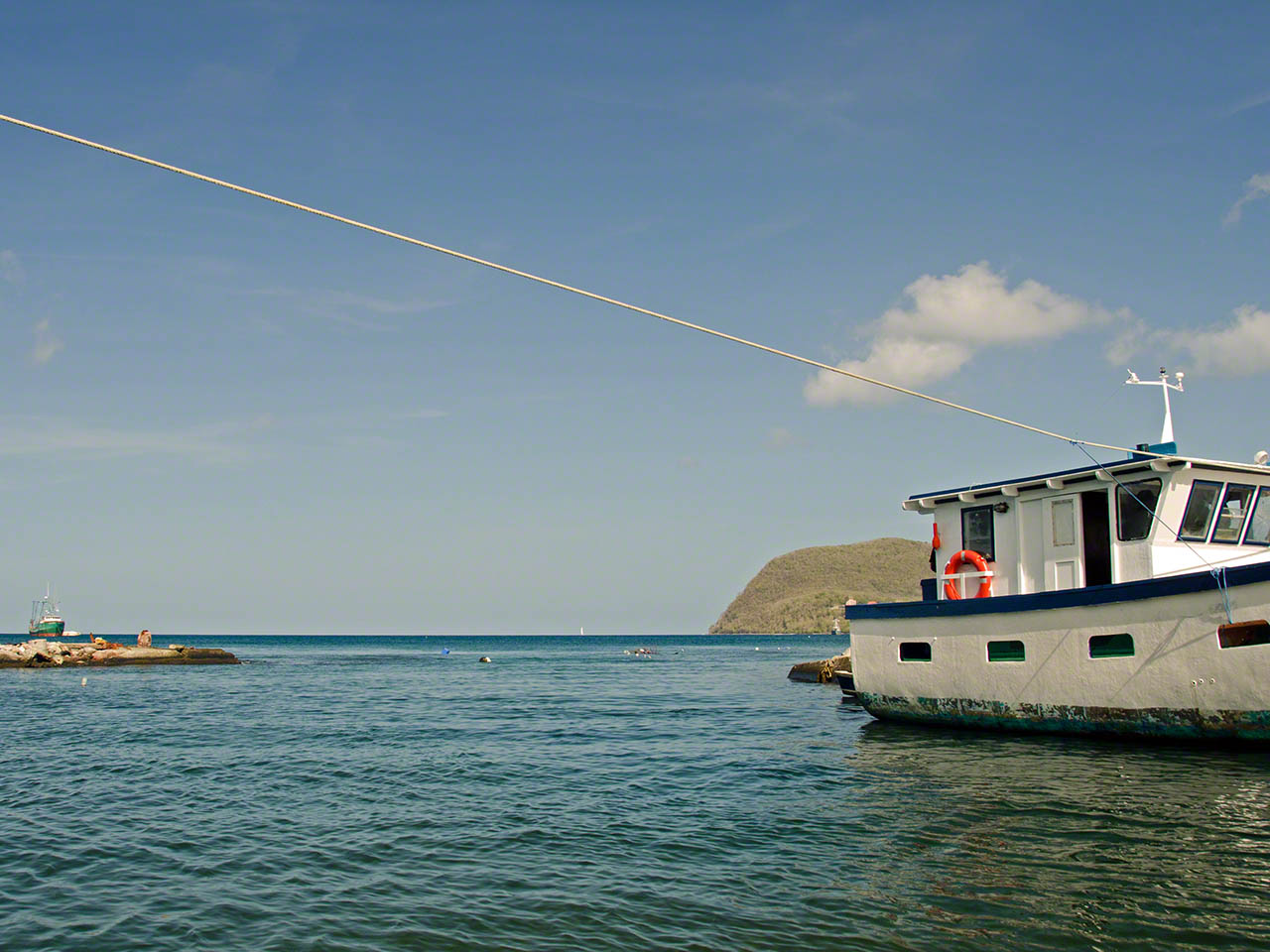 We were back on the boat just after 14:00 and made ready for travel as soon as we could, since we wanted to arrive in the Saintes before dark and hopefully still get a mooring ball. We had a bit of trouble with the lines which we soon sorted out and then laid course on the westerly, upwind, side of Basse-de-Terre and sailed at speed with the wind on the beam doing over 8 knots most of the time; a wonderful and fast passage. The winds had settled considerable from the day before and the waves had done likewise.