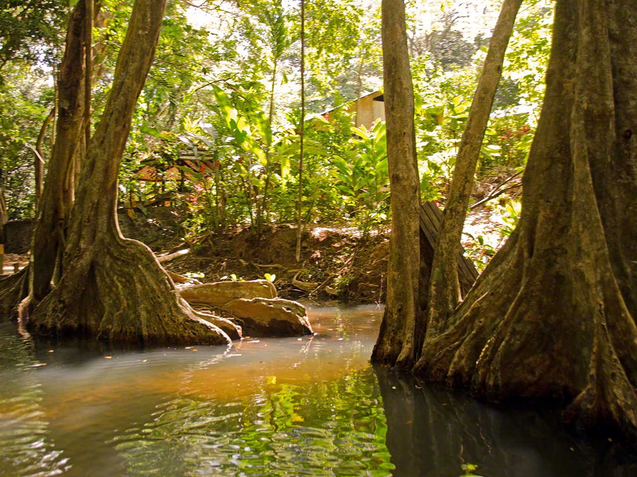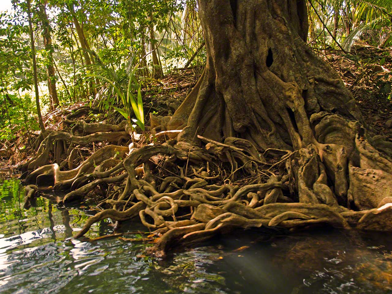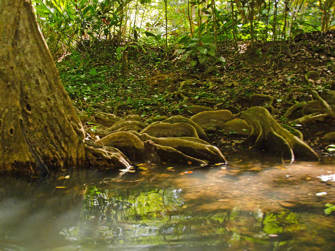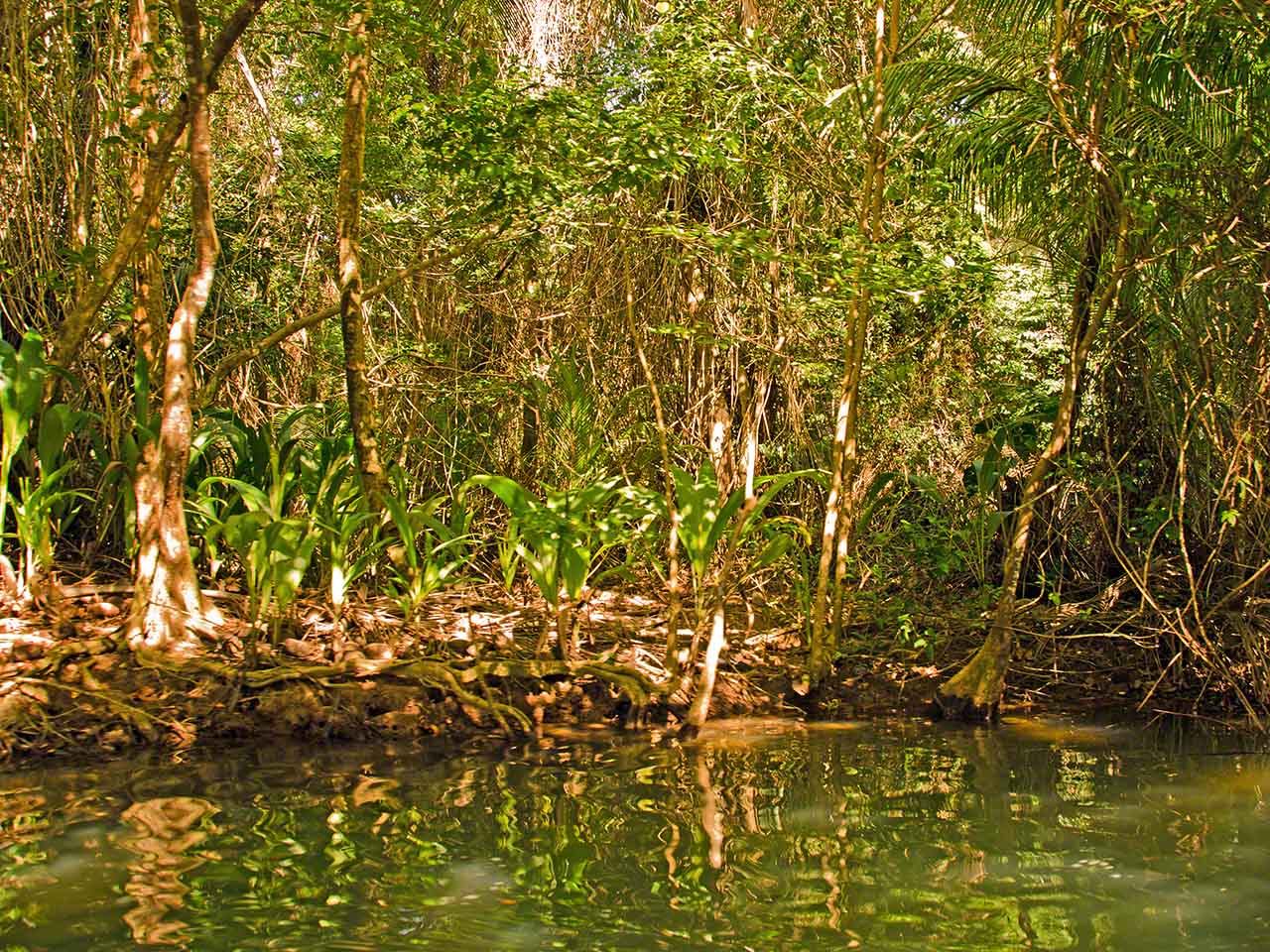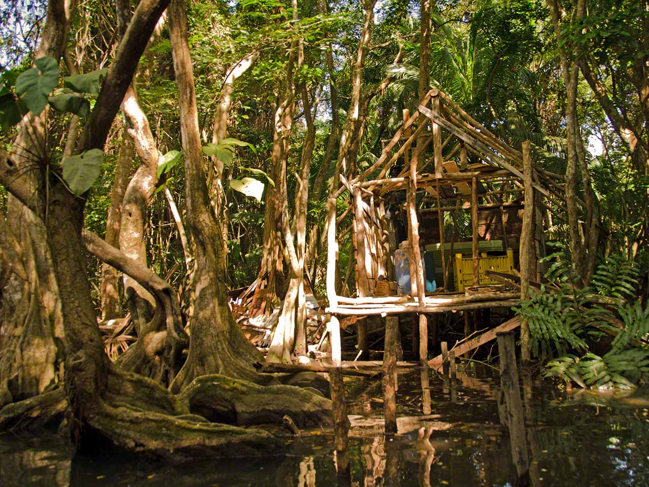 The pictures below show the nice diversity of life along the swampy shores of the river and after reaching the house at the furthest end of the river we walked along a path where Alexis once again explained the crops and plants that we passed. Fascinating was the fruit of the cocoa tree – the basis for chocolate. The fruit had a sweet-sour taste but tasted nothing at all like the end product.