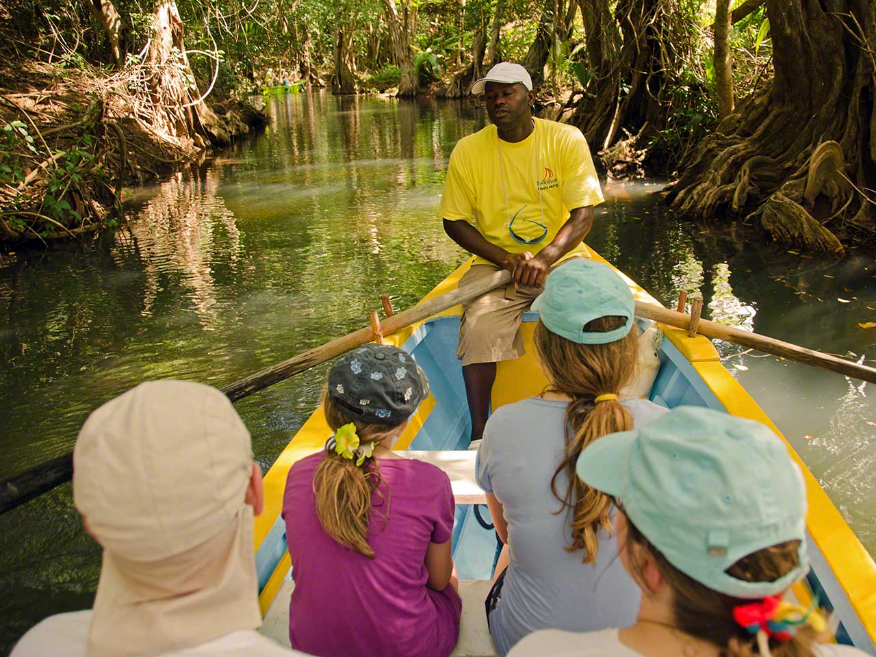 The first stop was the dock where everyone waited while I cleared into and out of Dominica. This procedure was relatively simple but I still had to use carbon sheets between the different copies of the forms and I am sure that not too many younger people have ever seen those, at least in Europe. Once back on the panga we motored to the entrance of the Indian River park area, Alexis went ashore to pay the park entrance fees and soon we were off. Soon after motoring under the bridge the use of outboards is disallowed and Alexis went forward, unshipped a pair of oars, and proceeded to row us slowly up the river while explaining in depth the flora and fauna around us, plus a history of the area and island. We did learn that regardless of what animal he hunted for cooking it ended up tasting like chicken, with the notable exception of the fish, which tasted like fish.