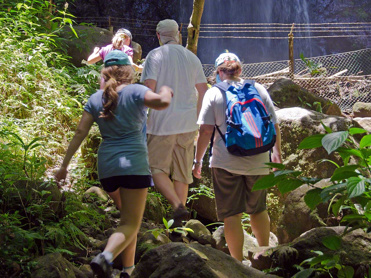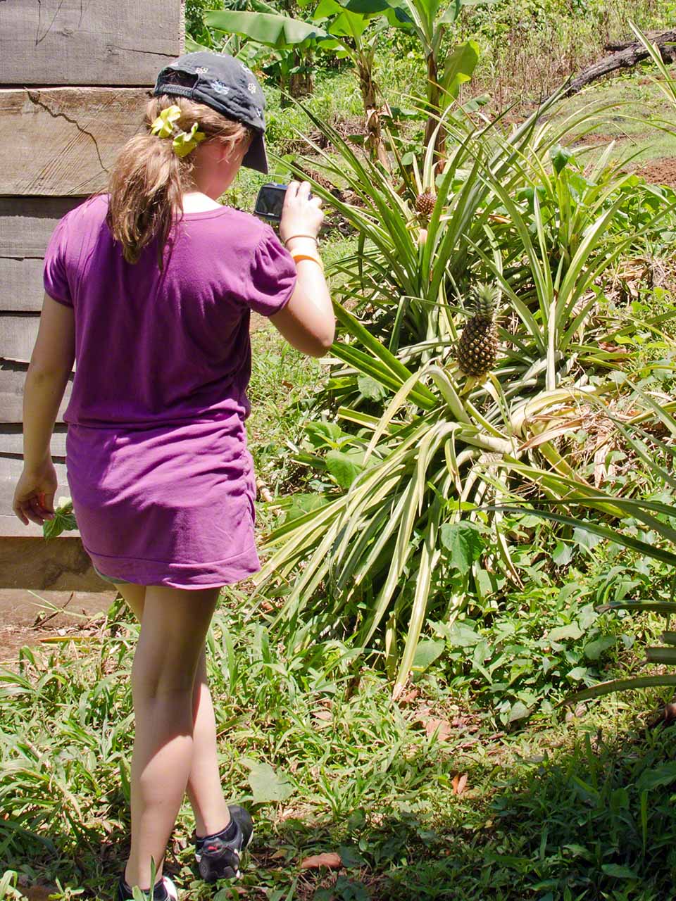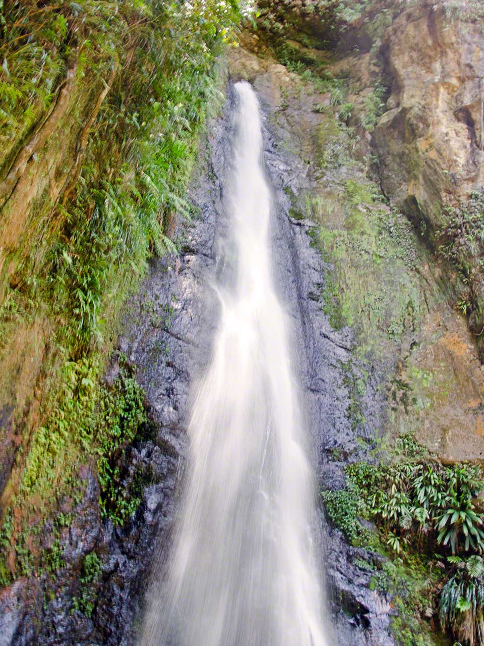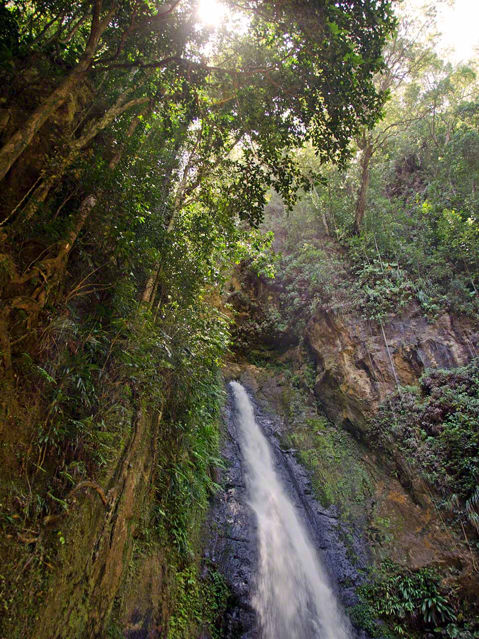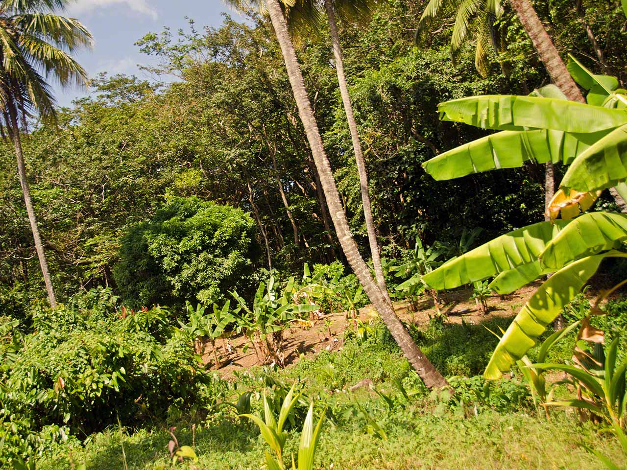 At the end of the trail we had a short respite and drank fresh juice at a stand while waiting for our next tour guide, Max. He arrived in a minibus and soon we were off, heading towards the higher and moister levels of the jungle. Our destination was the Syndicate farms and the Syndicate Falls above them. Once again we were treated to detailed explanations of many plants and crops on the way, with a sprinkling of island geography and history mixed in.