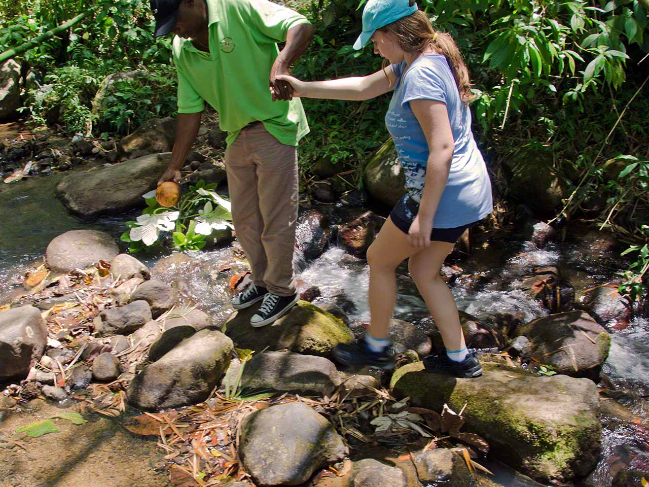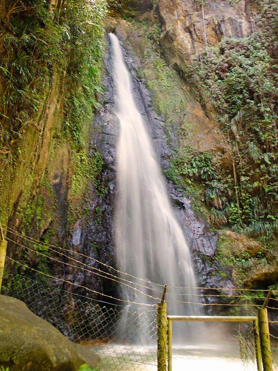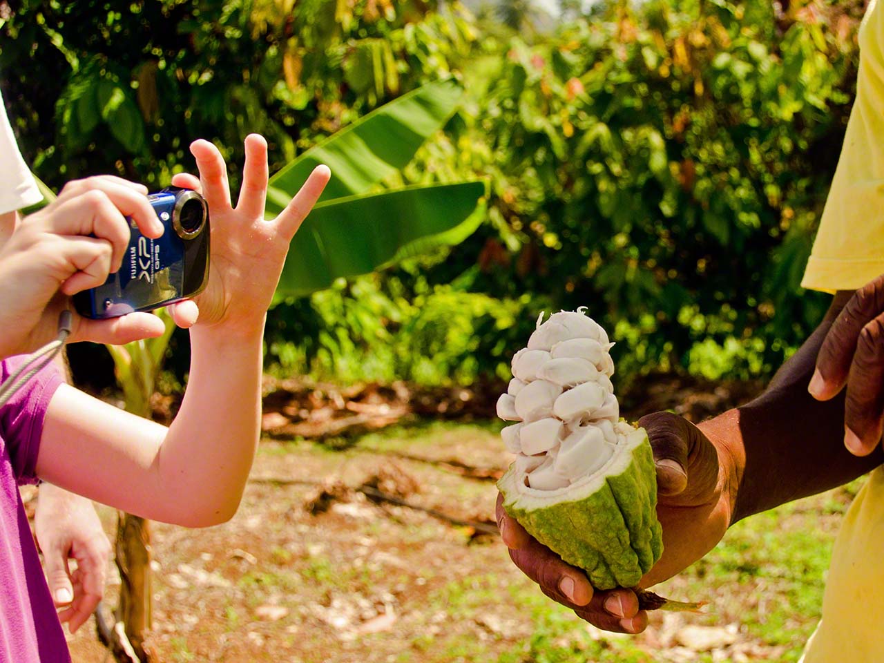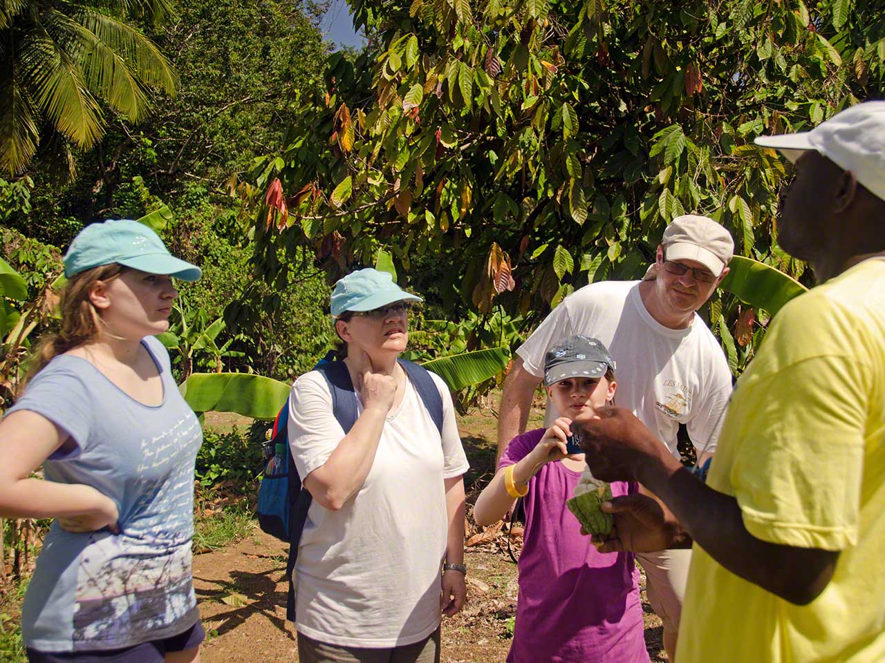 Up in the farm we saw numerous crops close-up: banana, plantain, avocado, nutmeg, grapefruit, cocoa, coffee, tomatoes, watermelon and more. We got to sniff at lemon grass and got some cinnamon bark to take back and had a snack of succulent grapefruit before entering the forest path and walking up to the falls. I’m not sure what the fence in front of the falls is supposed to stop (the gate is open), but it detracted from the beauty of the falling water – nonetheless a pretty sight indeed!