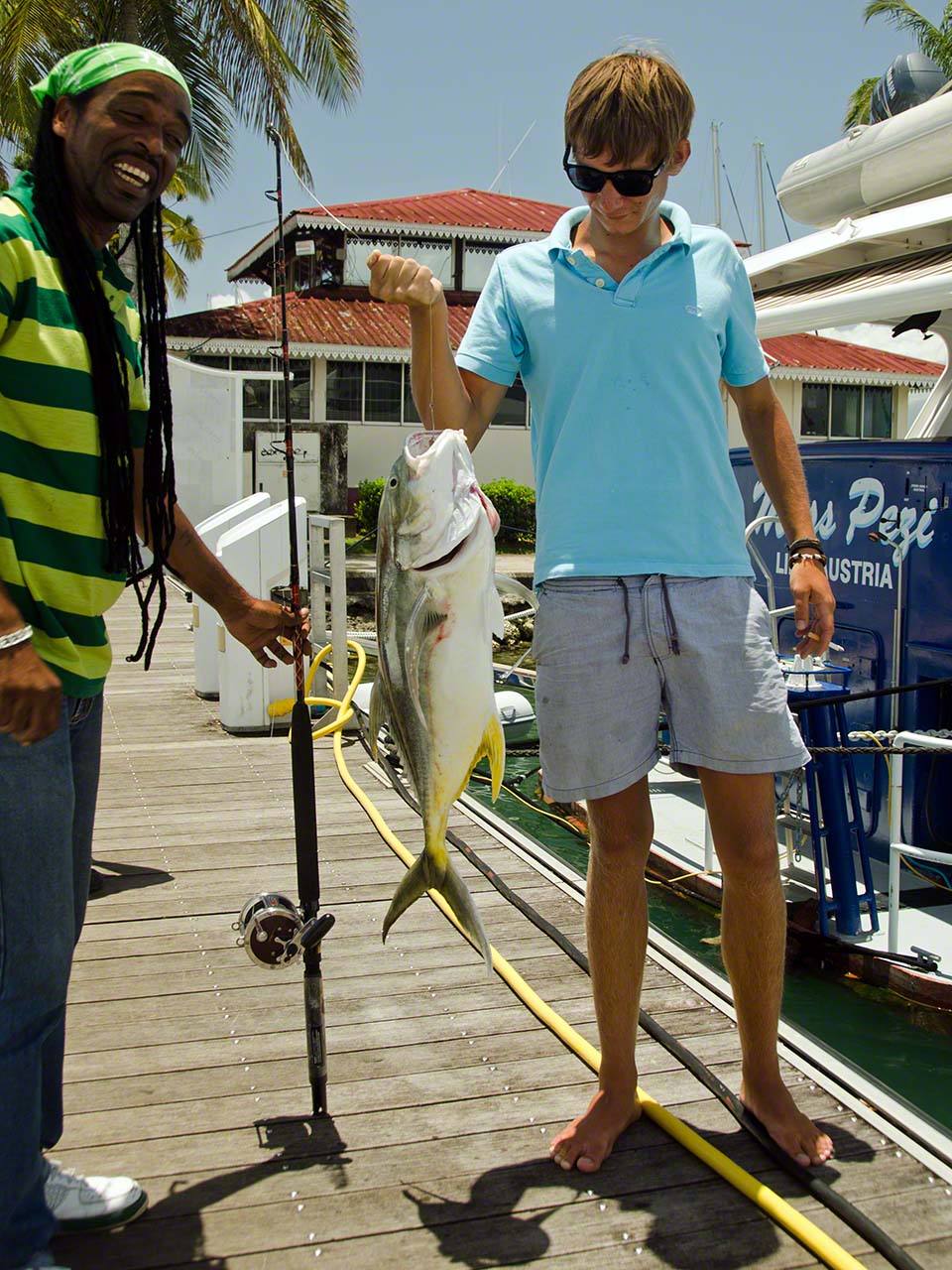 Rauten, one of the crew members, spends the twilight time with a local fisherman on the docks, using a line with hooks and no bait to hook small fry, which are then used on bigger lines as bait. He caught a very large fish during the day and quite a crowd gathered to see the master fisherman at work!