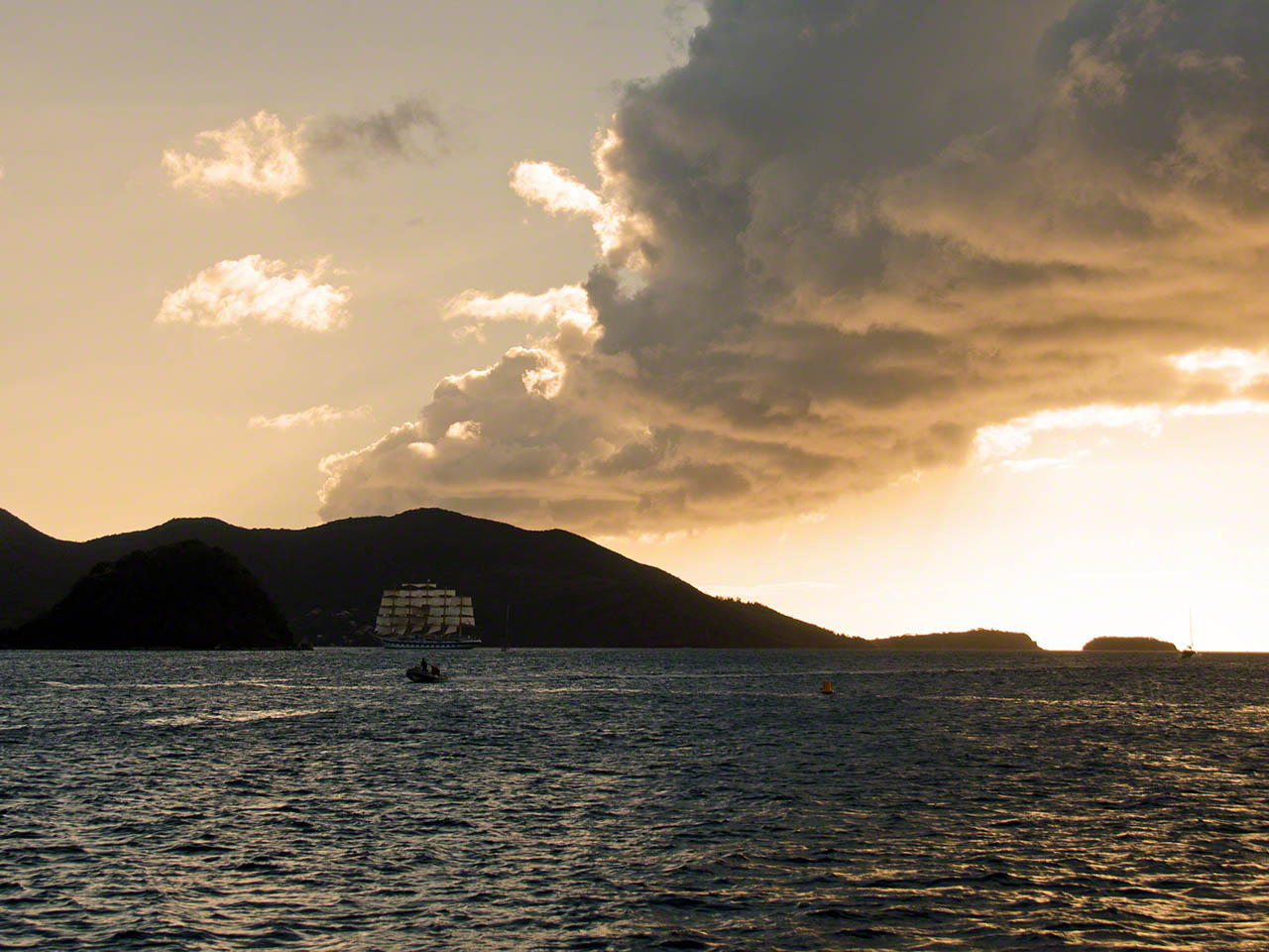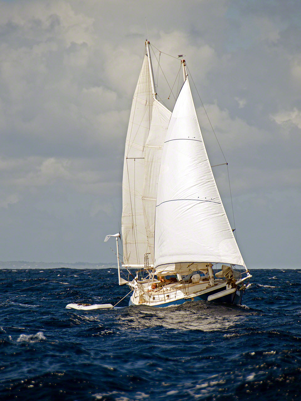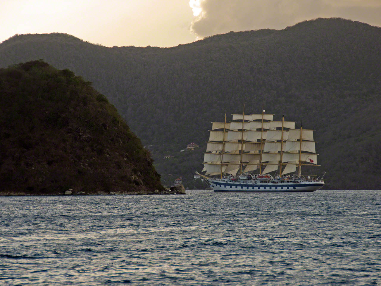 Finally managed to cut the virtual umbilical cord to the dock (and unplug the actual power line, water hose, and dock lines) and make it away from the marina. I got an early start but somehow didn’t manage to get away until noon, so instead of sailing straight to Dominica I sailed halfway there, to the Îles des Saintes. The winds started off by howling but the reefs I had in the sails soon turned out to be a bit conservative but I kept them in anyway, as I was in no hurry and even passed the only other boat on the same stretch, a small ketch.