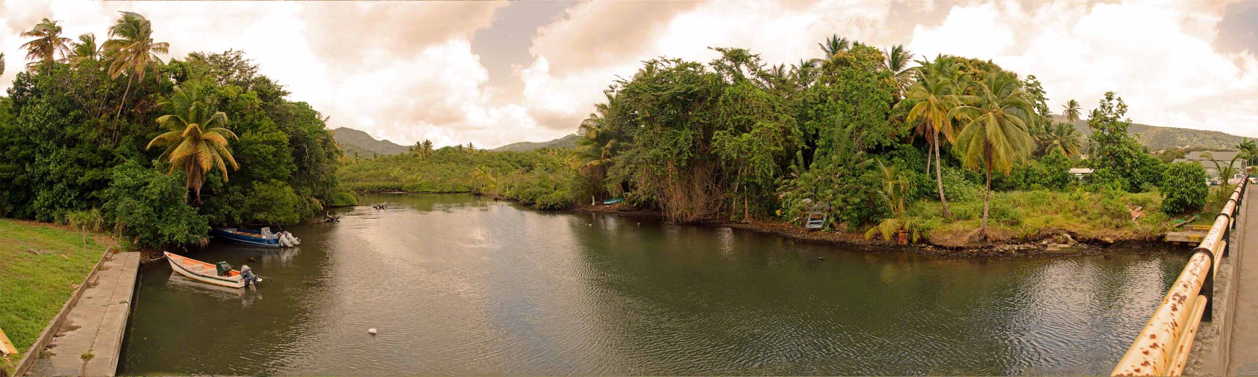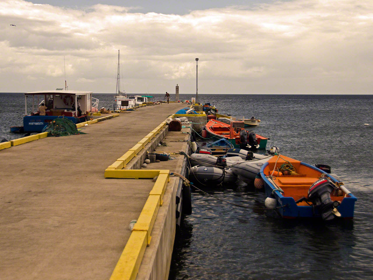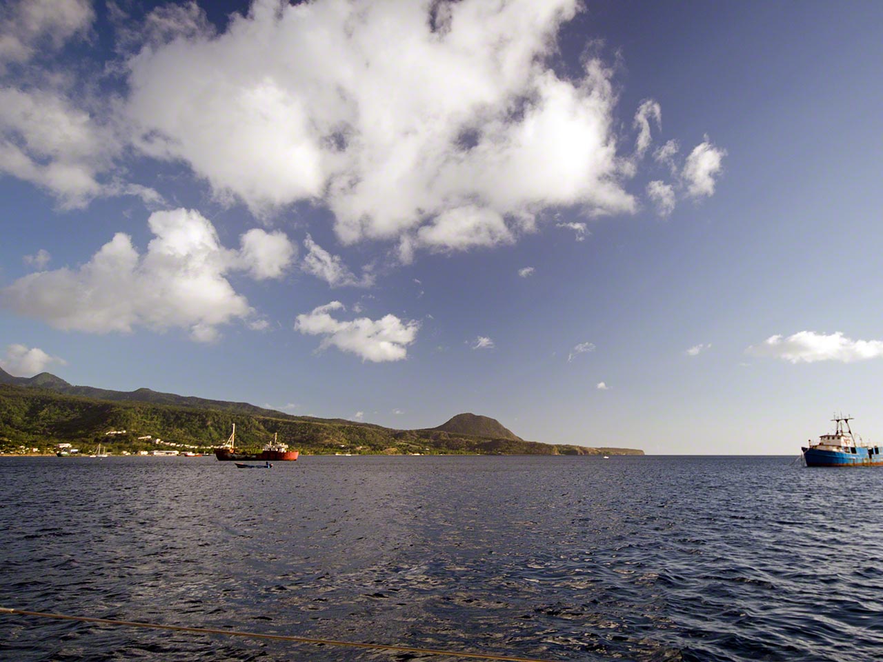 I went ashore and walked around the town of Portsmouth for a bit, the morning market had completed and the vendors were shutting down their stands. I was surprised at the number of people bouncing around the street who were very obviously zoned out on drugs – their behavior wasn’t that of people stoned but evidently on something different and stronger. Despite that negative impression the walk was nice, going to the Indian River bridge on the one side of town and just as far in the other direction. I didn’t find a cash machine, but had some EC left over with which to buy some bread and frozen hamburger meat, the former for a late lunch and the latter for dinner.